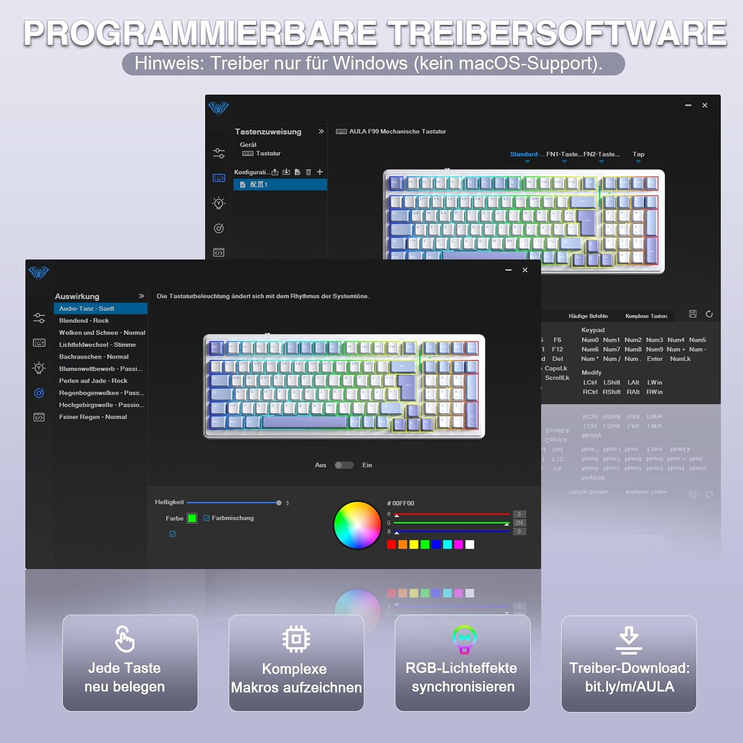 AULA F99 Безжична геймърска механична клавиатура, QWERTZ разположение, BT5.0/2.4G/USB-C, уплътнителна структура, гореща смяна, софтуер, RGB, PBT капачки на клавишите, 8000 mAh, кремообразен звук, 95% защита, механична клавиатура (синя)