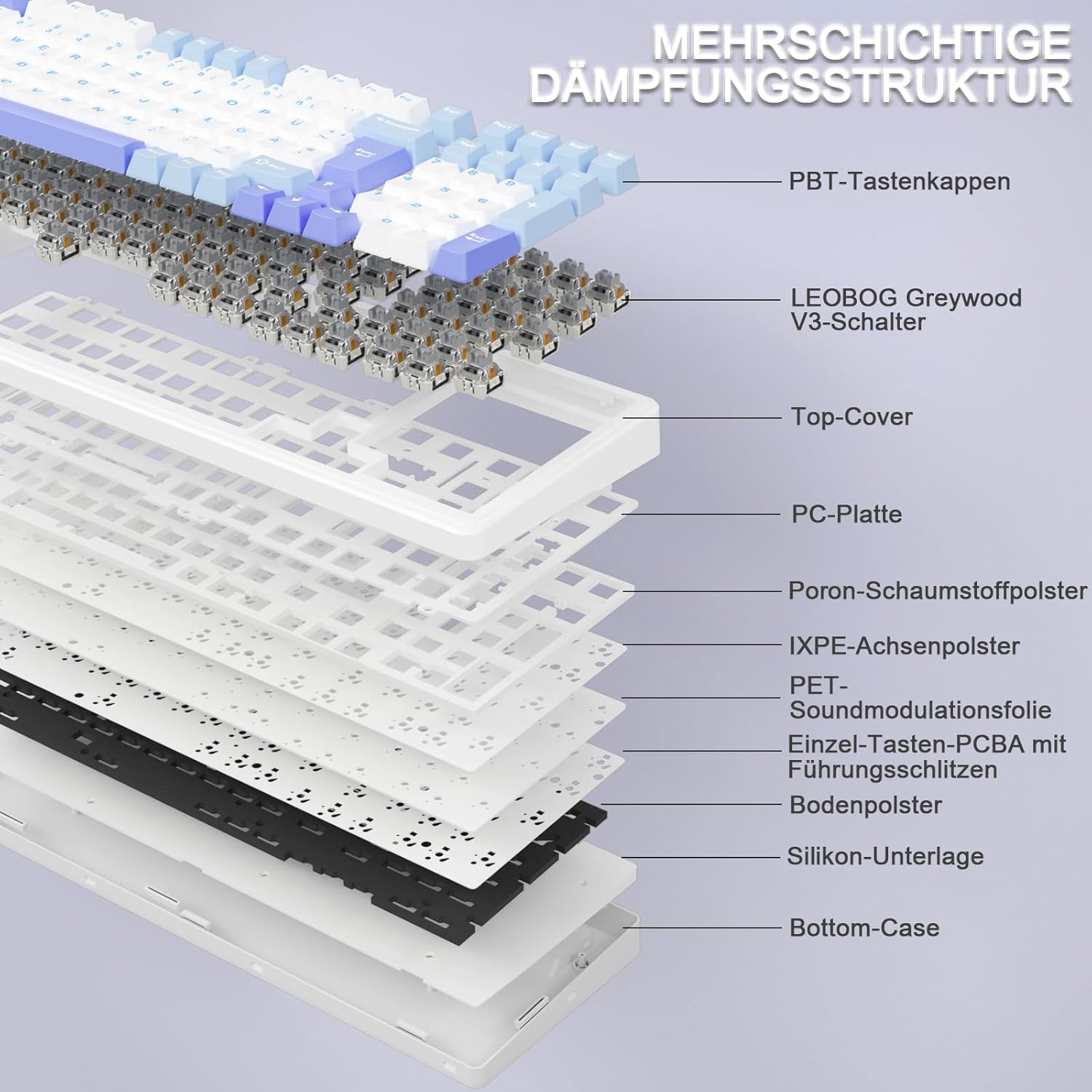 • Предварително обработени превключватели с функция за гореща смяна: кремообразната клавиатура F99 с функция за гореща смяна позволява смяна на превключвателите без инструменти и запояване, идеална за ентусиасти, които искат редовно да усъвършенстват усещането си при писане. Висококачествените гнезда поддържат както 3-пинови, така и 5-пинови превключватели за максимална гъвкавост. Специален акцент: вградените превключватели Leobog Gray Wood V3 се доставят фабрично. Ултраплавна обратна връзка с клавишите с нисък резонанс.