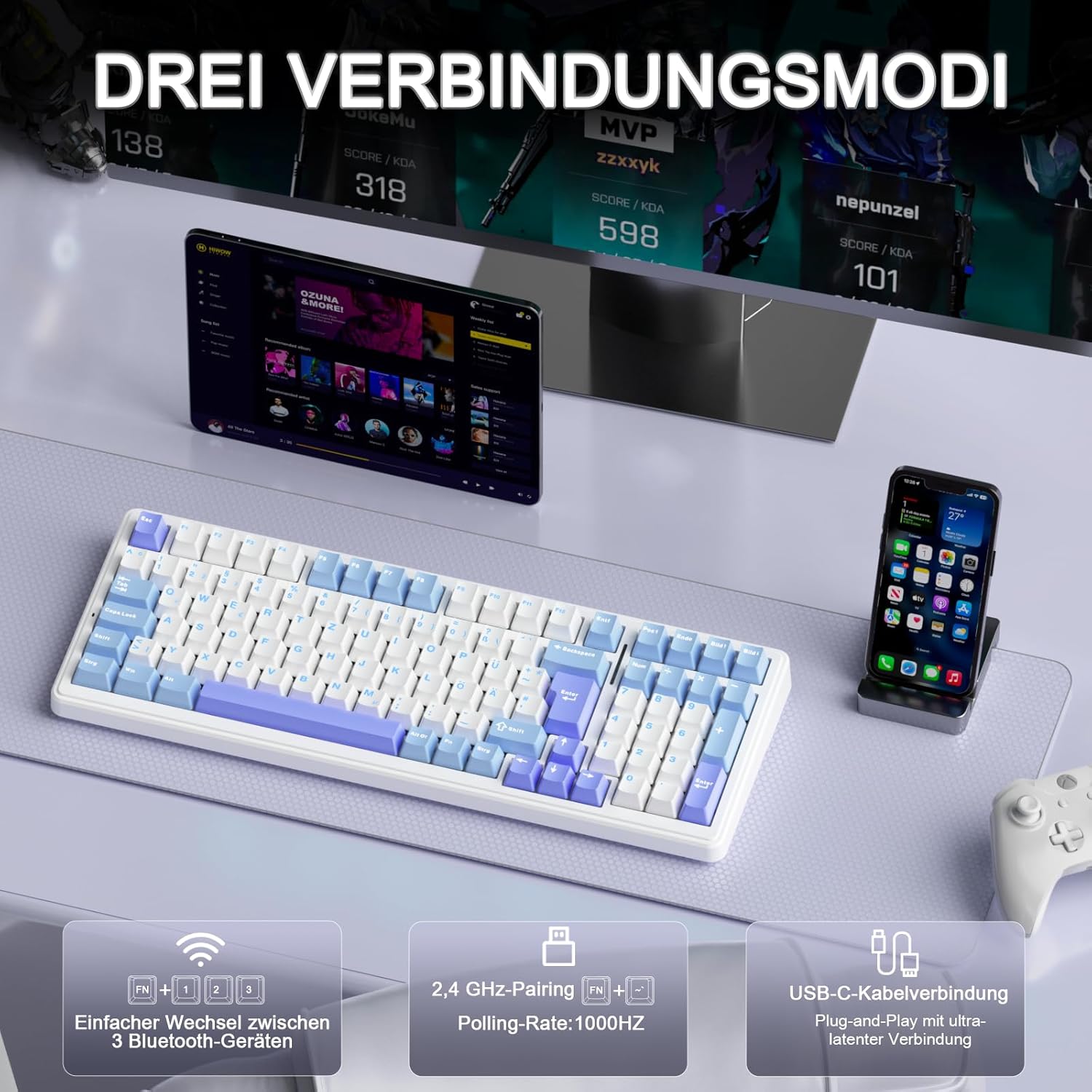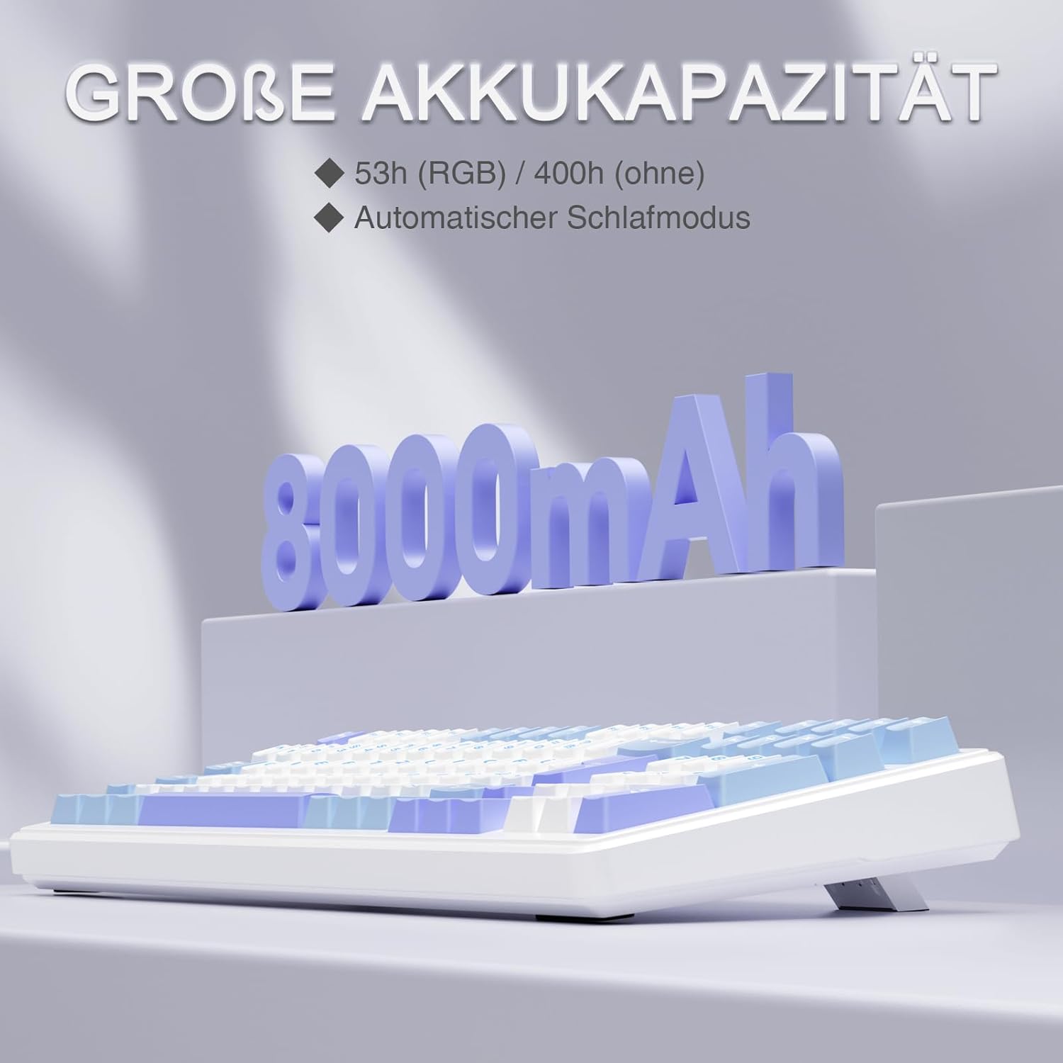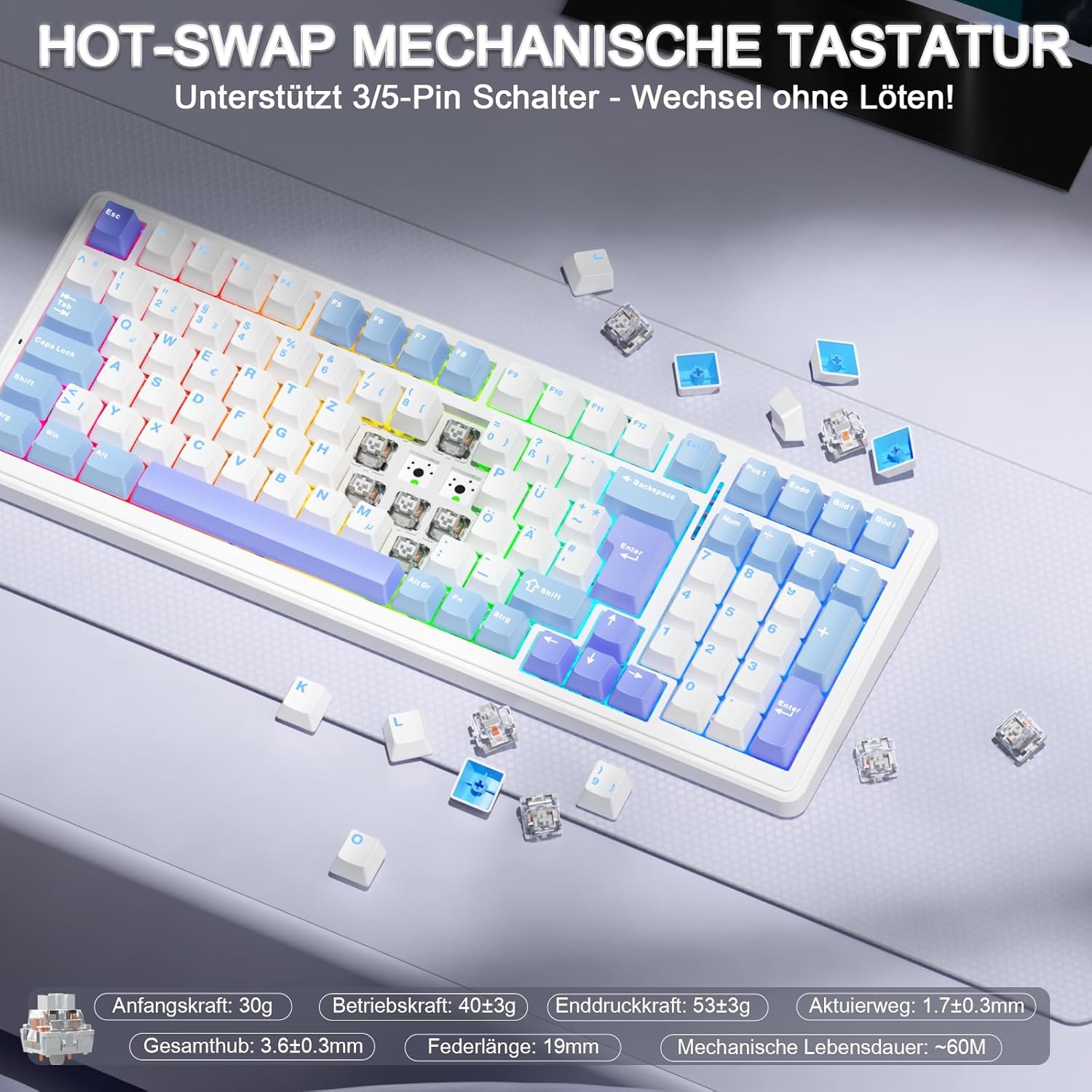 AULA F99 Безжична геймърска механична клавиатура, QWERTZ разположение, BT5.0/2.4G/USB-C, уплътнителна структура, гореща смяна, софтуер, RGB, PBT капачки на клавишите, 8000 mAh, кремообразен звук, 95% защита, механична клавиатура (синя)