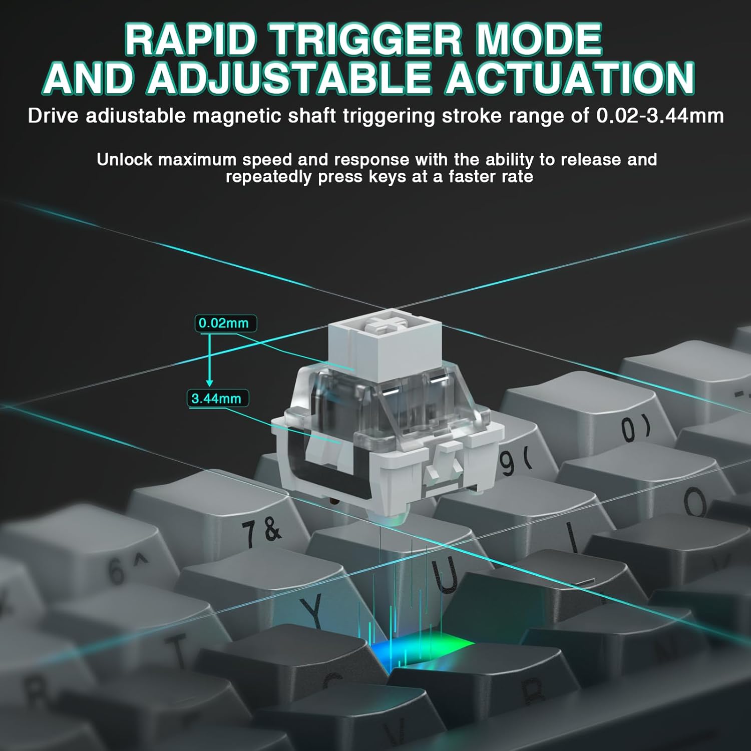 • ИГРОВА КЛАВИАТУРА RAPID TRIGGER В режим Rapid Trigger, WIN60 HE без усилие се справя със сложни маневри с несравнима скорост и прецизност, за да бъде една крачка пред играта. С ултра ниска стъпка на RT от само 0,02 мм, можете да регулирате точката на спиране на всеки клавиш от 0,02 мм до 3,44 мм, което ви позволява да контролирате бързи или ултра прецизни натискания на клавиши и да осигурите светкавично бързо време за реакция, идеално за бързи стрелби и сложни комбинации.