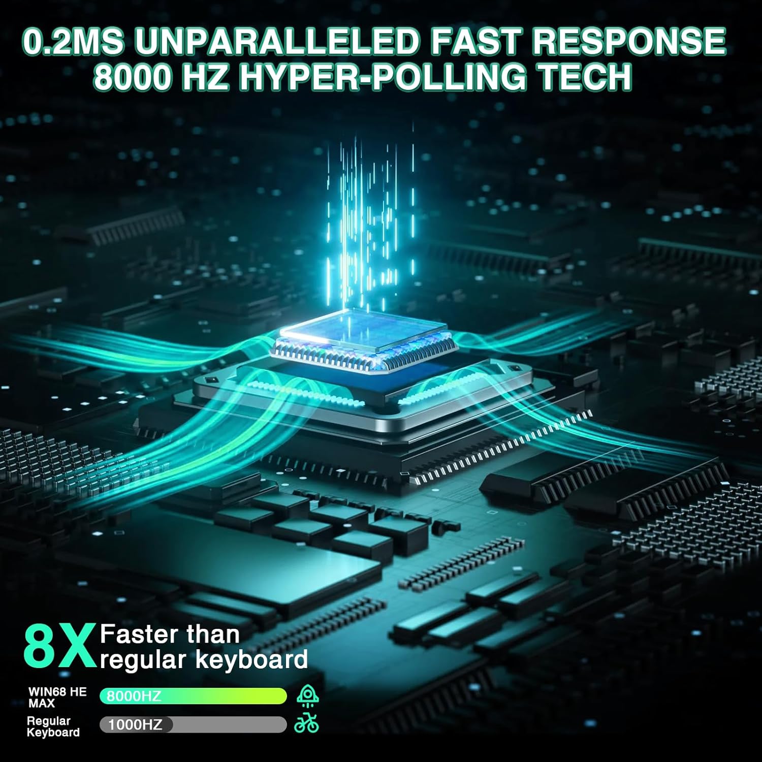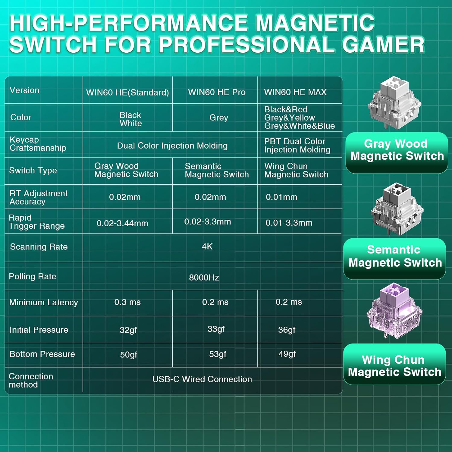 • Магнитни превключватели с ефект на Хол: Кабелната механична геймърска клавиатура WIN60 HE е оборудвана с напълно регулируеми магнитни превключватели с ефект на Хол, които с честота на анкетиране до 8000 и изключително ниска латентност от само 0,3 ms гарантират, че всяко натискане на клавиш се усеща незабавно и като продължение на вашата нервна система. Проектирана за FPS игри като Valorant и CSS.2 за по-бързо превключване и бързо спиране за подобрена точност и позициониране.