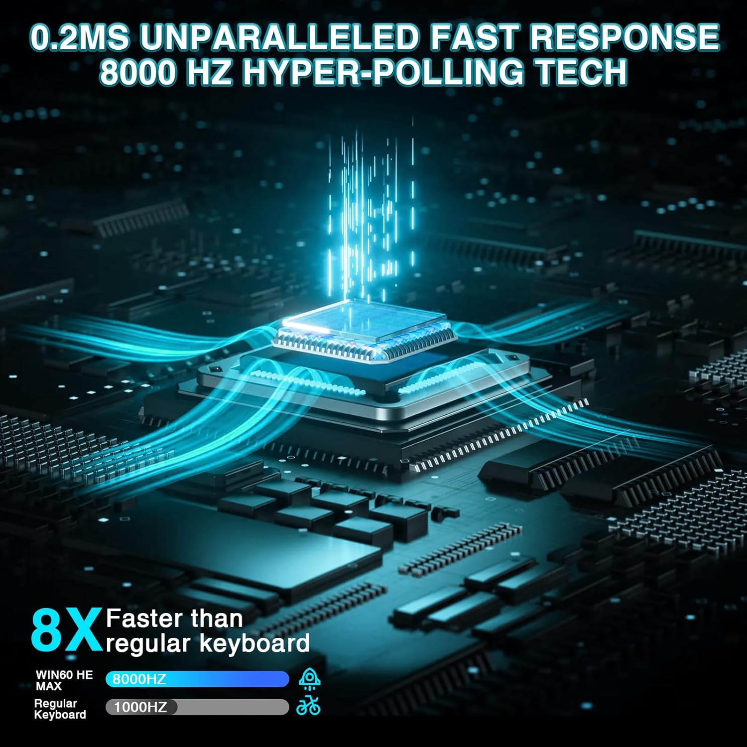 • Магнитни превключватели с ефект на Хол: Кабелната механична геймърска клавиатура WIN60 HE е оборудвана с напълно регулируеми магнитни превключватели с ефект на Хол, които с честота на анкетиране до 8000 и изключително ниска латентност от само 0,3 ms гарантират, че всяко натискане на клавиш се усеща незабавно и като продължение на вашата нервна система. Проектирана за FPS игри като Valorant и CSS.2 за по-бързо превключване и бързо спиране за подобрена точност и позициониране.