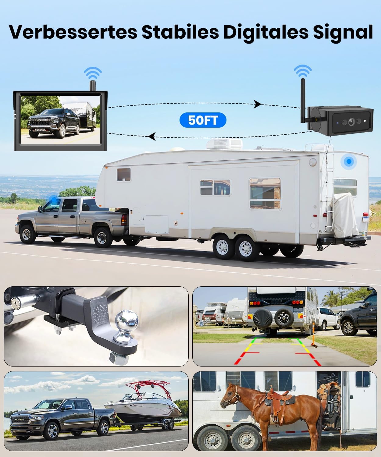 • Силен, стабилен сигнал без забавяне или трептене: Вградена с най-новата безжична антена за подобряване на стабилността с 50%, тази камера за заден ход за кемпери предлага обхват на безжично предаване до 15 метра без трептене или забавяне. Тази безжична камера за заден ход е идеална за камиони, пикапи, кемпери, каравани, ремаркета за коне, трактори, кемпери и ремаркета.