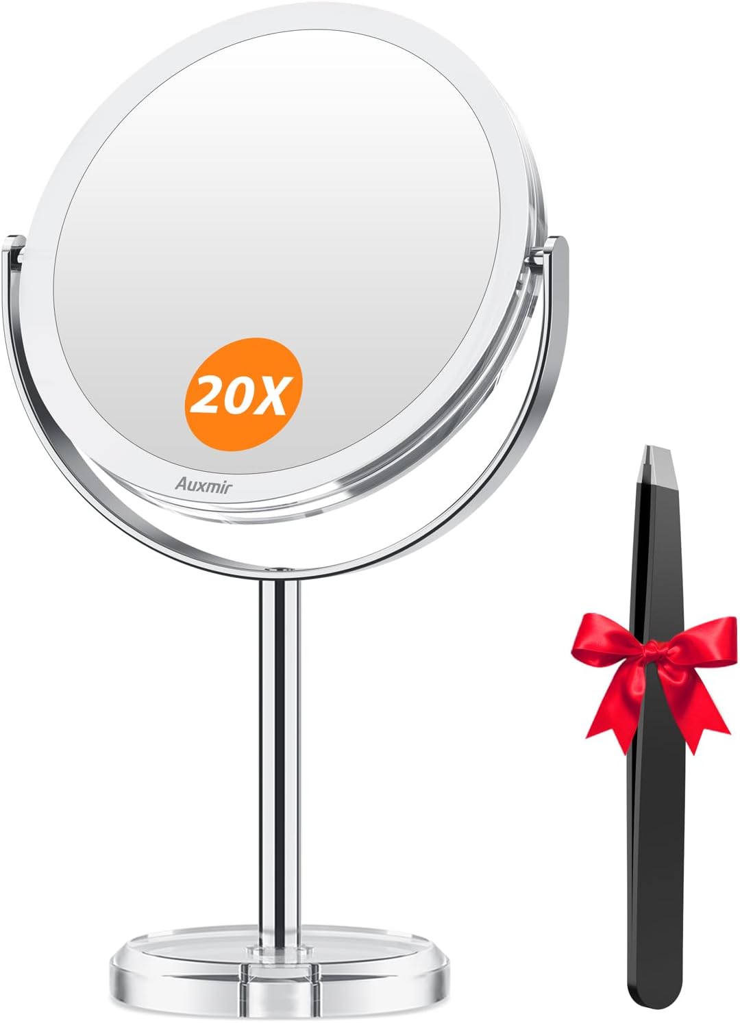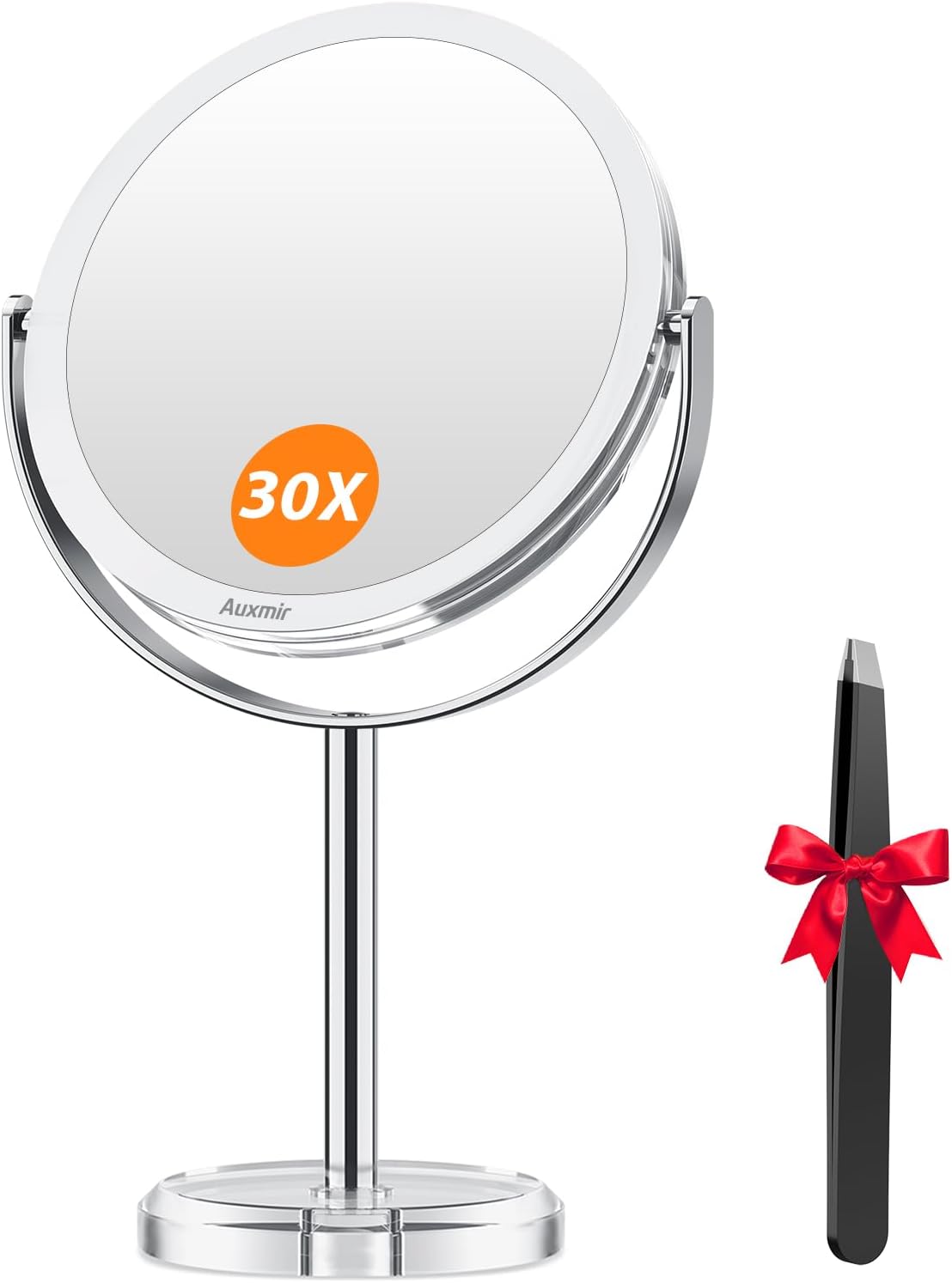 • 1X/30X: Двустранното козметично огледало Auxmir има 1x HD огледало и 30x увеличително огледало. Идеално за ежедневен грим и грижа за лицето, като например скубане на вежди, нанасяне на червило, бръснене и носене на контактни лещи.