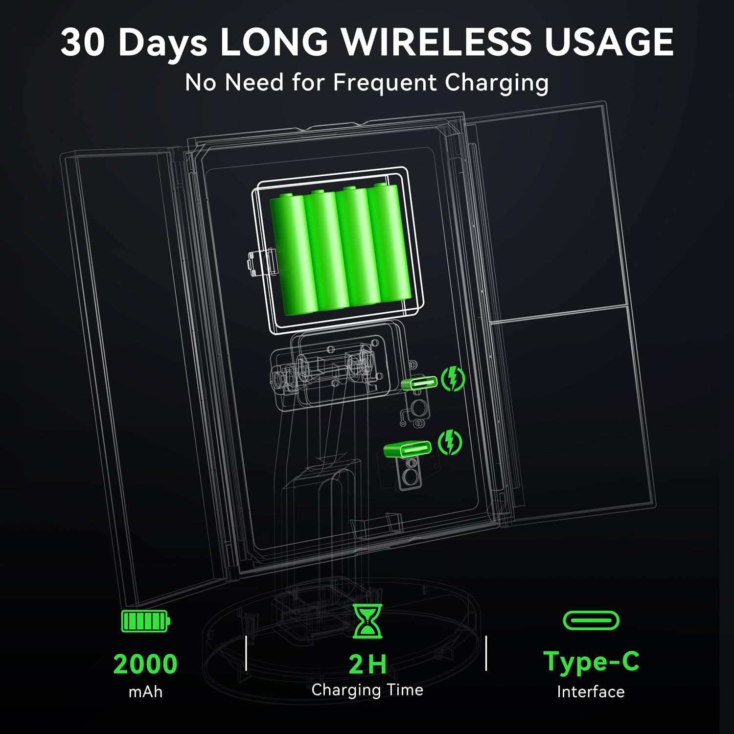 • Акумулаторна литиева батерия 2000 mAh: огледалото за грим се захранва от вградената литиева батерия и може да се зарежда чрез USB-C кабел (включен в комплекта). Не е необходима смяна на батерии. За пестене на енергия и опазване на околната среда, LED светлината се изключва автоматично след 30 минути.