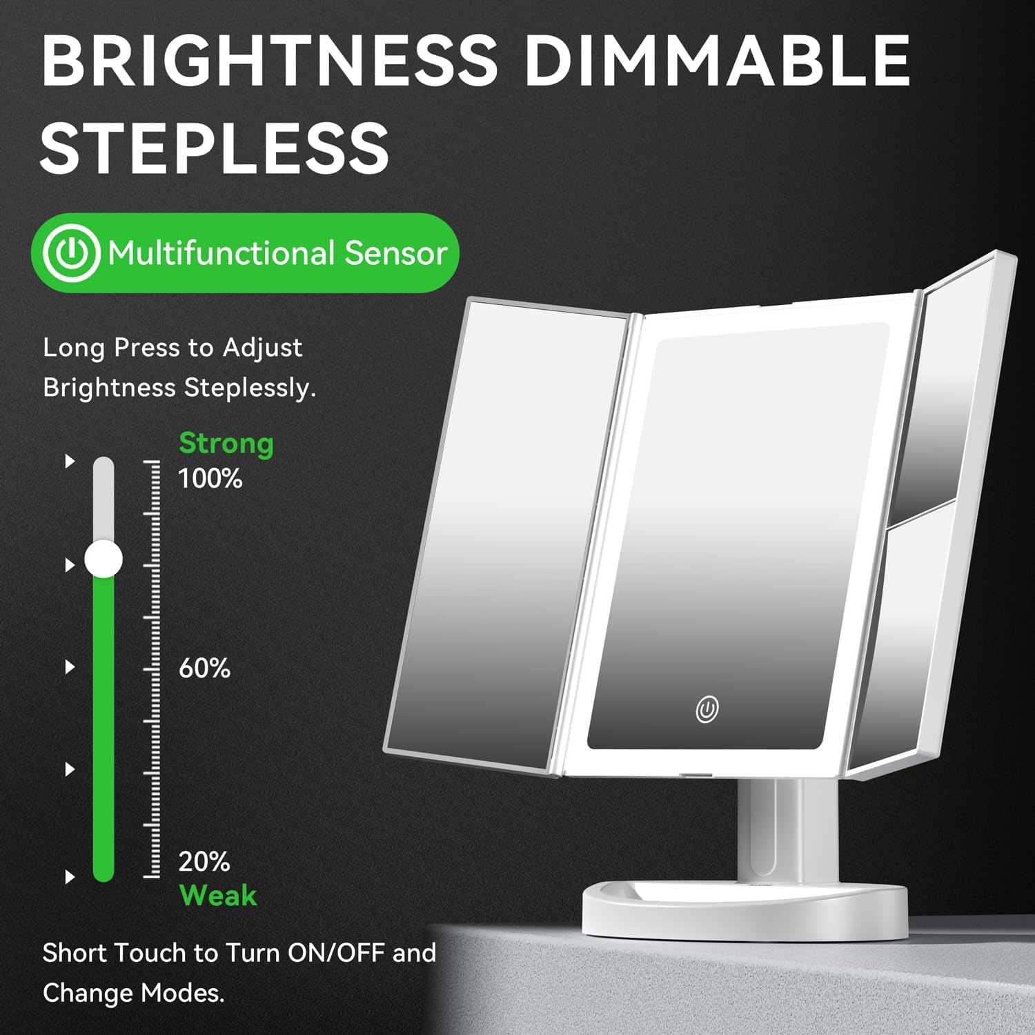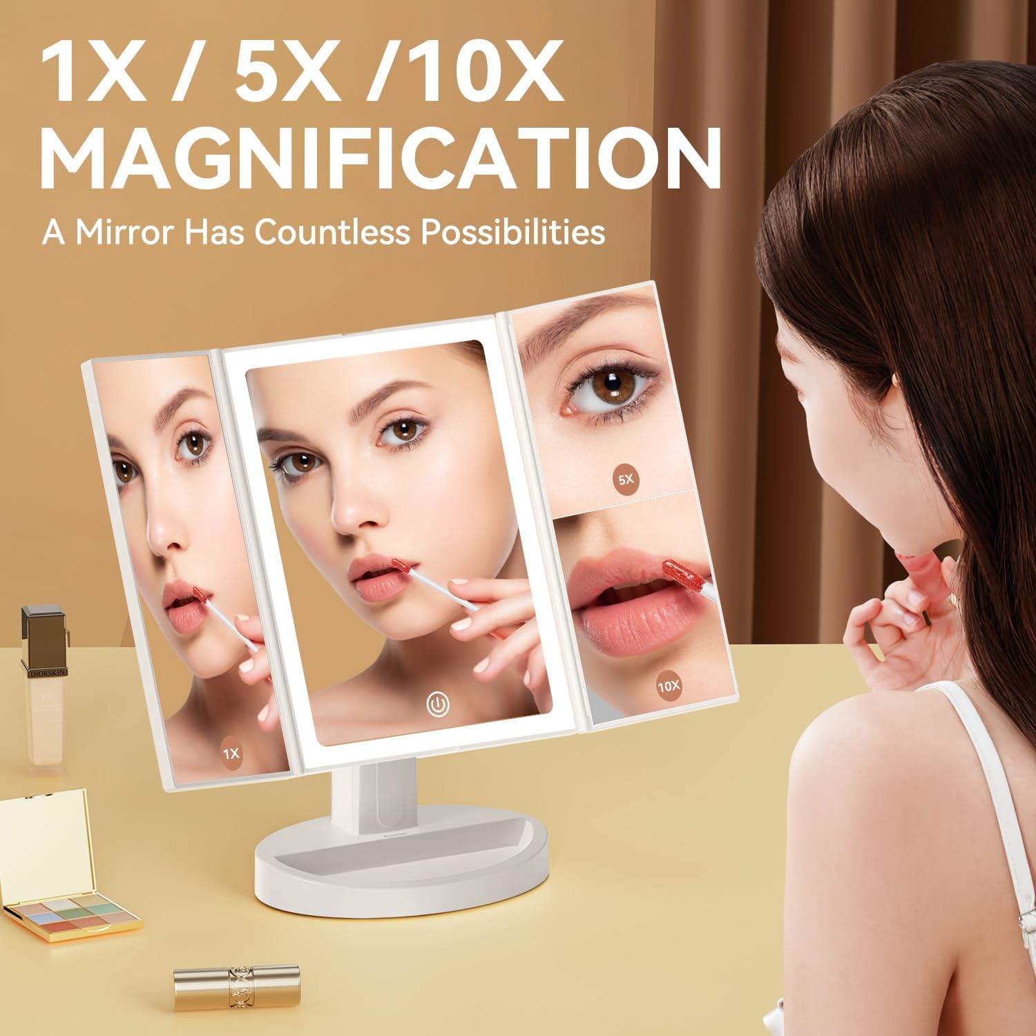Auxmir Огледало за грим с осветление 10X/5X/1X увеличение, 2000 mAh USB акумулаторно козметично огледало с тъчскрийн димируемо осветление 3 цвята на светлината, сгъваемо LED настолно огледало с увеличително огледало