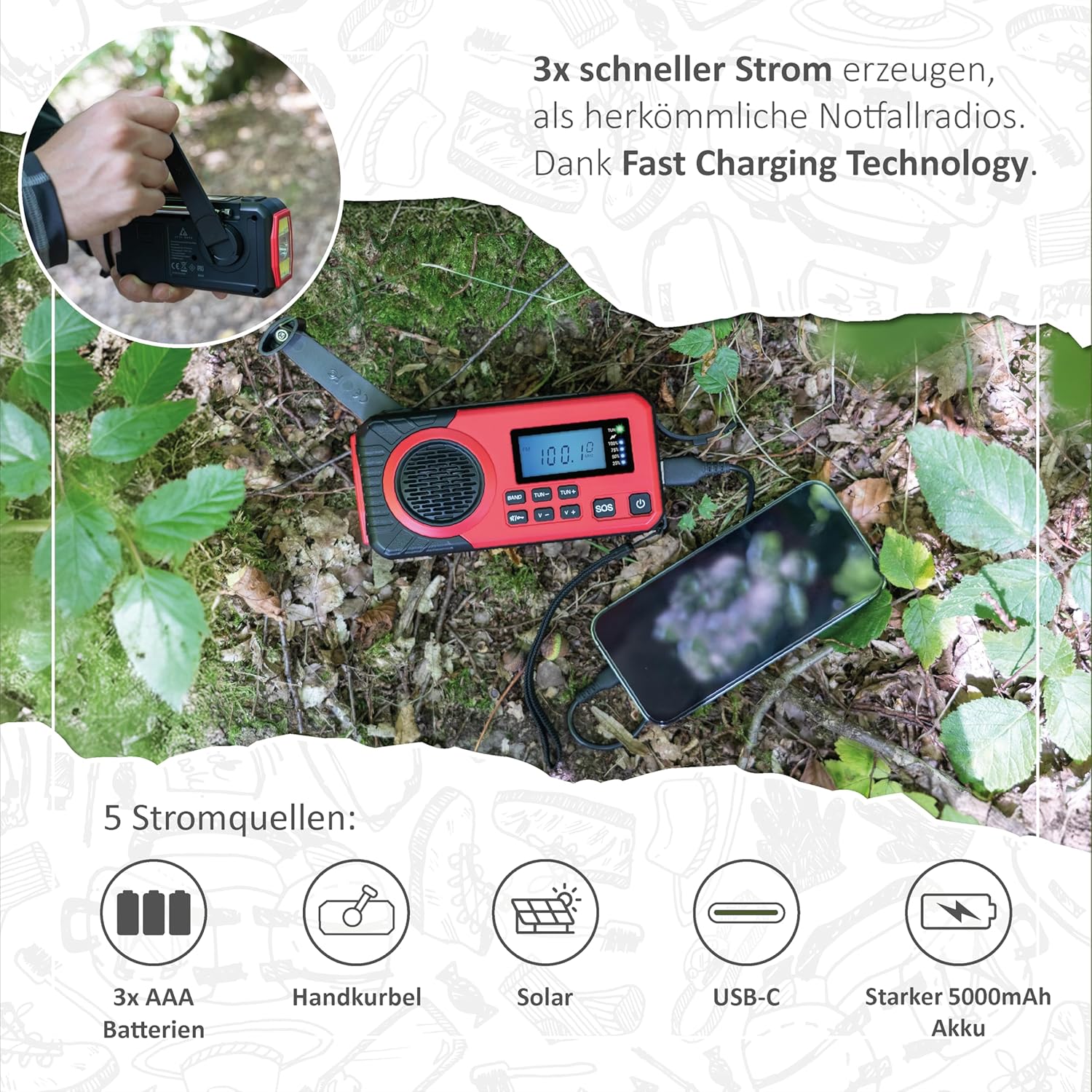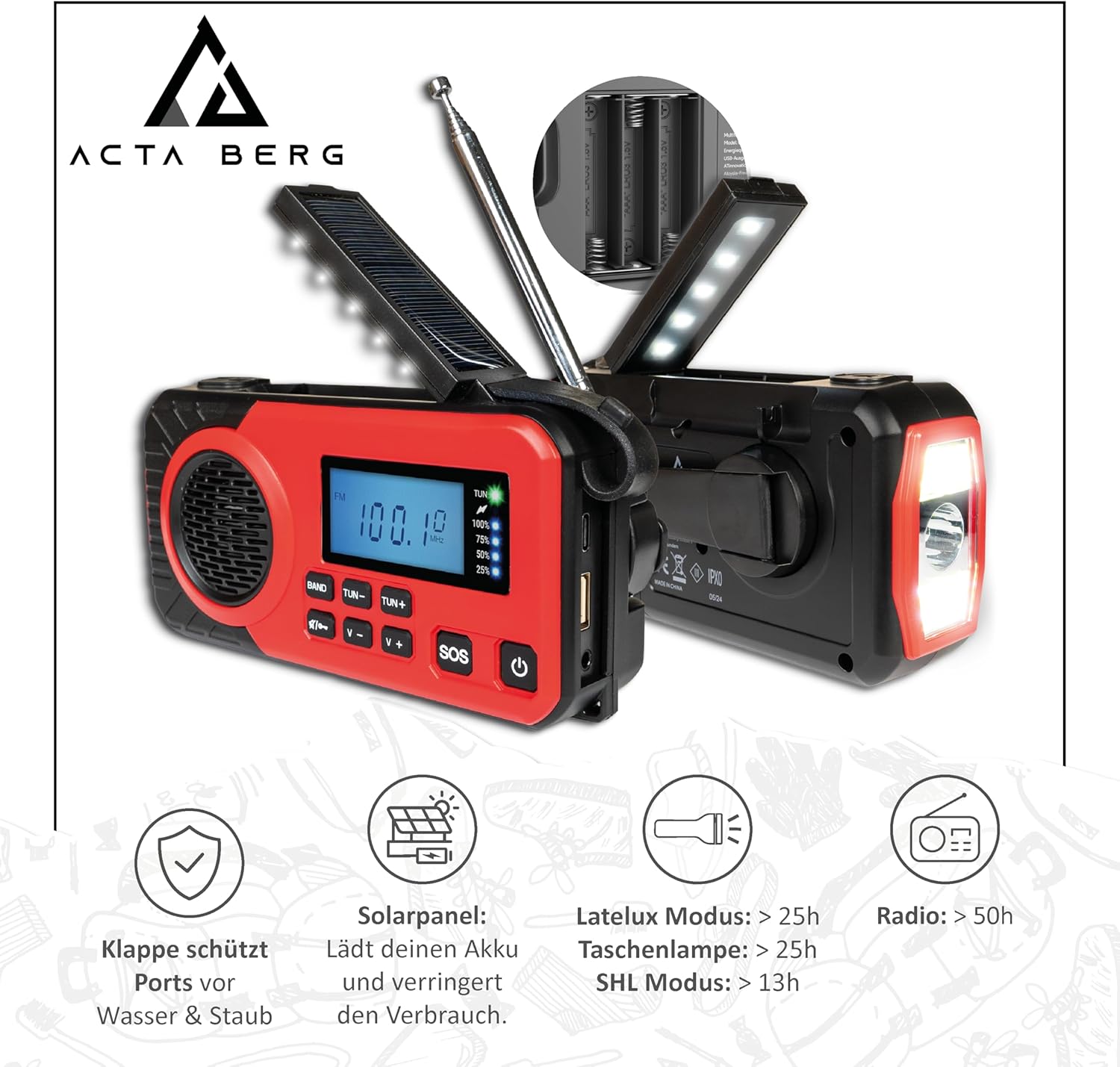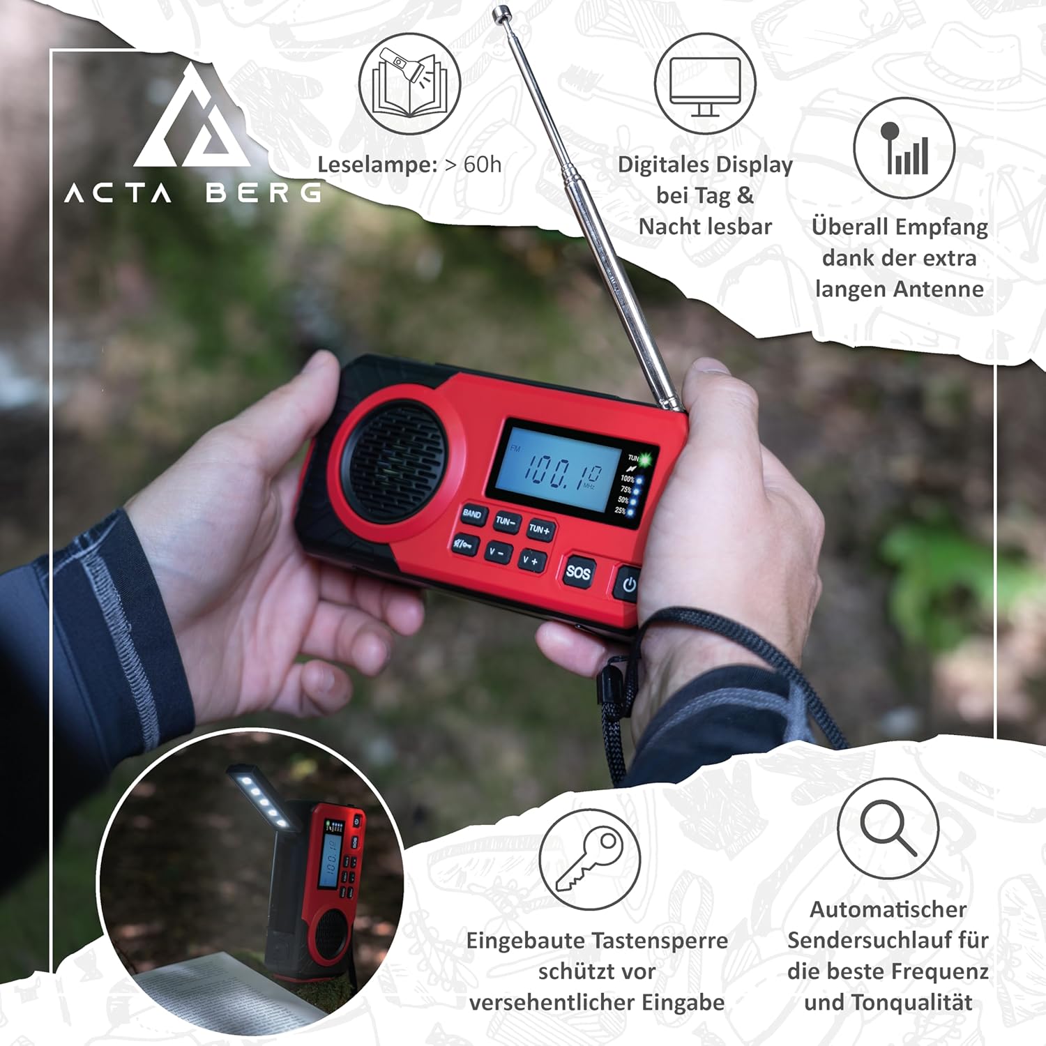 Аварийно радио Acta Berg Crank Radio с манивела и батерия 5000 mAh, слънчево радио с приемник Worldwide, ръчна манивела, оборудване за аварийно спиране при затъмнение, като фенерче и зарядно устройство AM/FM/SW с USB, червено