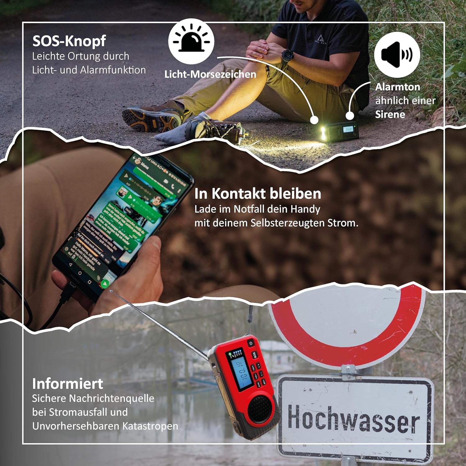 • Електричество на открито. Независимо дали обичате къмпингуване, туризъм или по друг начин попадате в тежки ситуации - с нашата аварийна радиостанция определено сте се погрижили за всичко. Благодарение на захранването, ние генерираме до 3 пъти повече енергия от конвенционалните аварийни радиостанции!