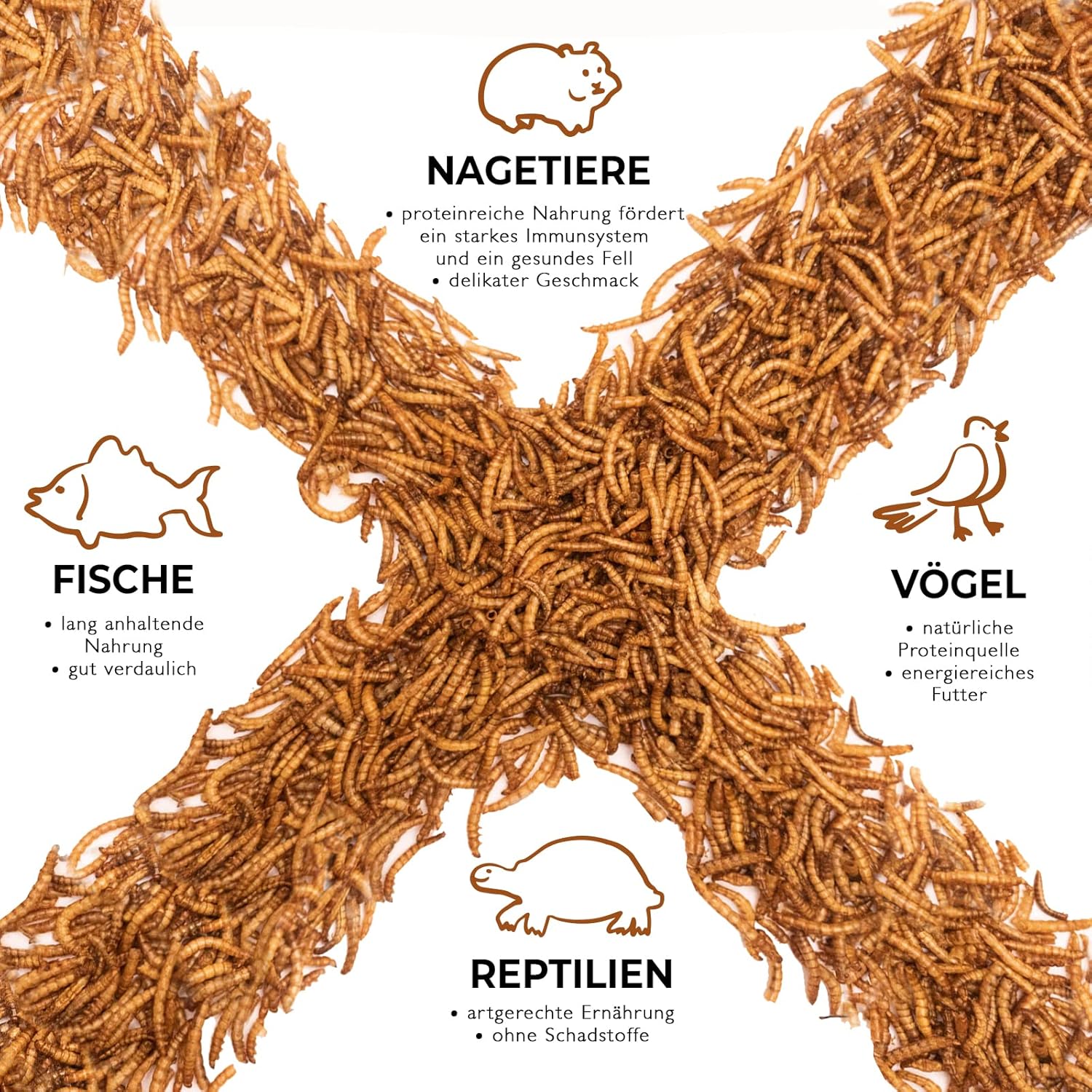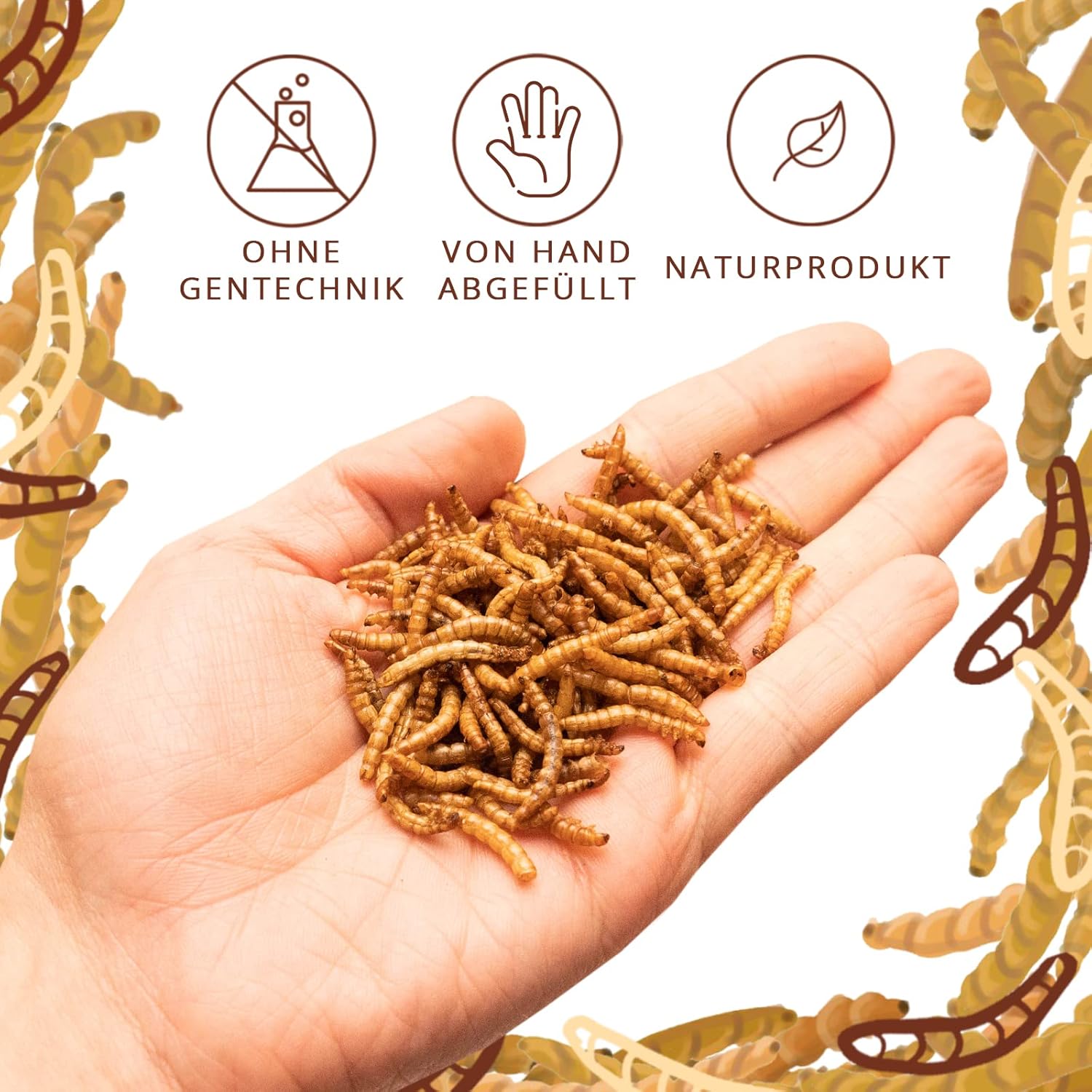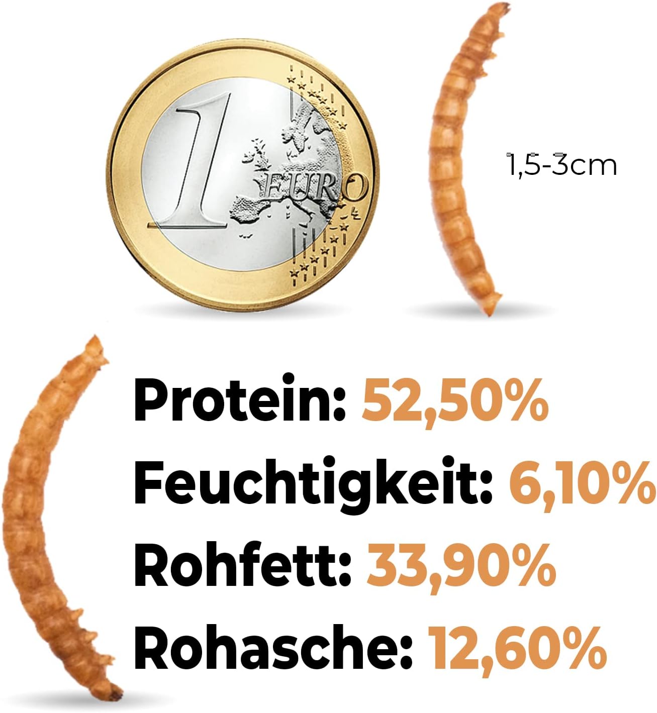 • Процесът на сушене запазва всички ценни протеини и витамини. В комбинация с внимателното ръчно опаковане без счупване, винаги можете да разчитате на качеството на нашите брашнени червеи!
