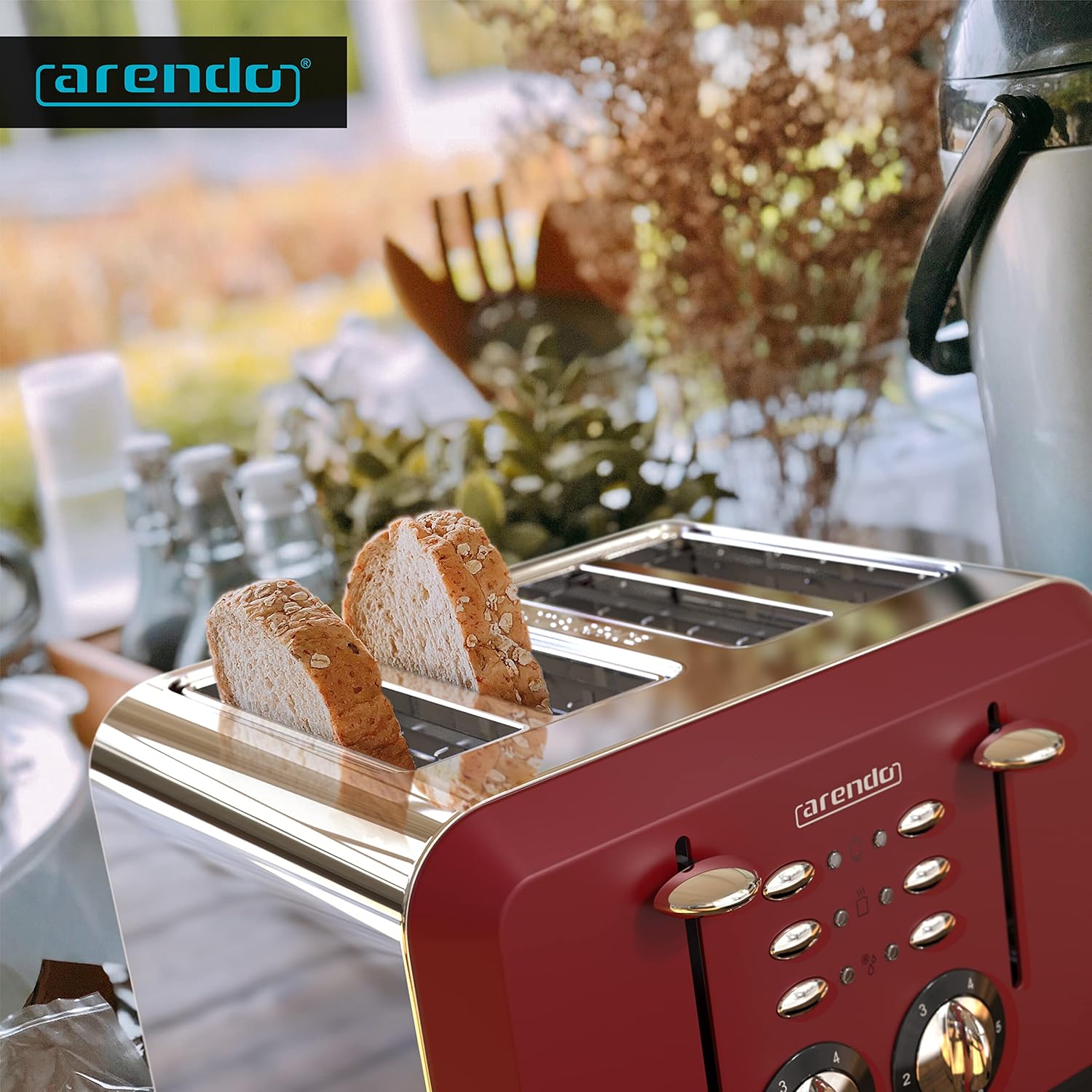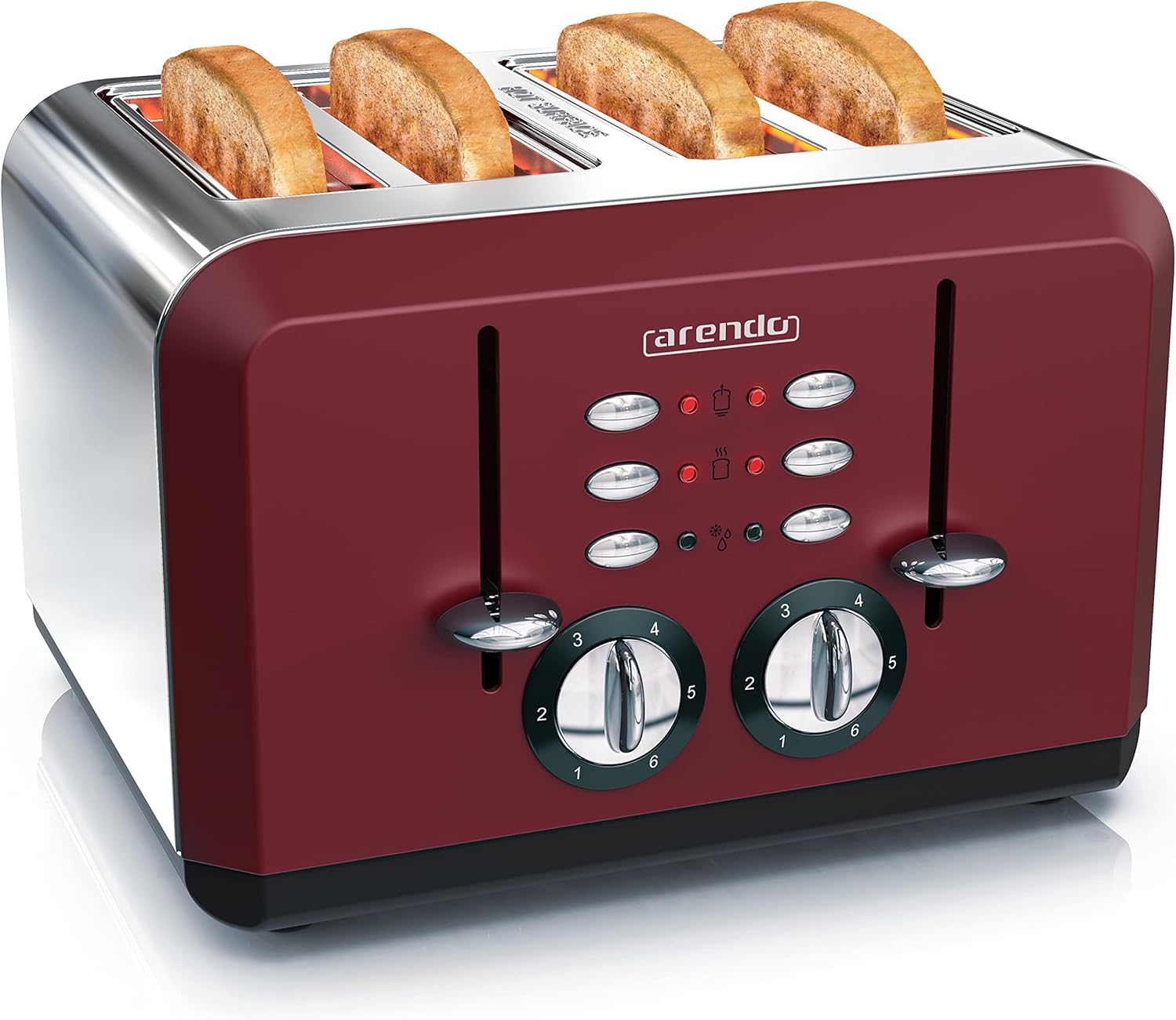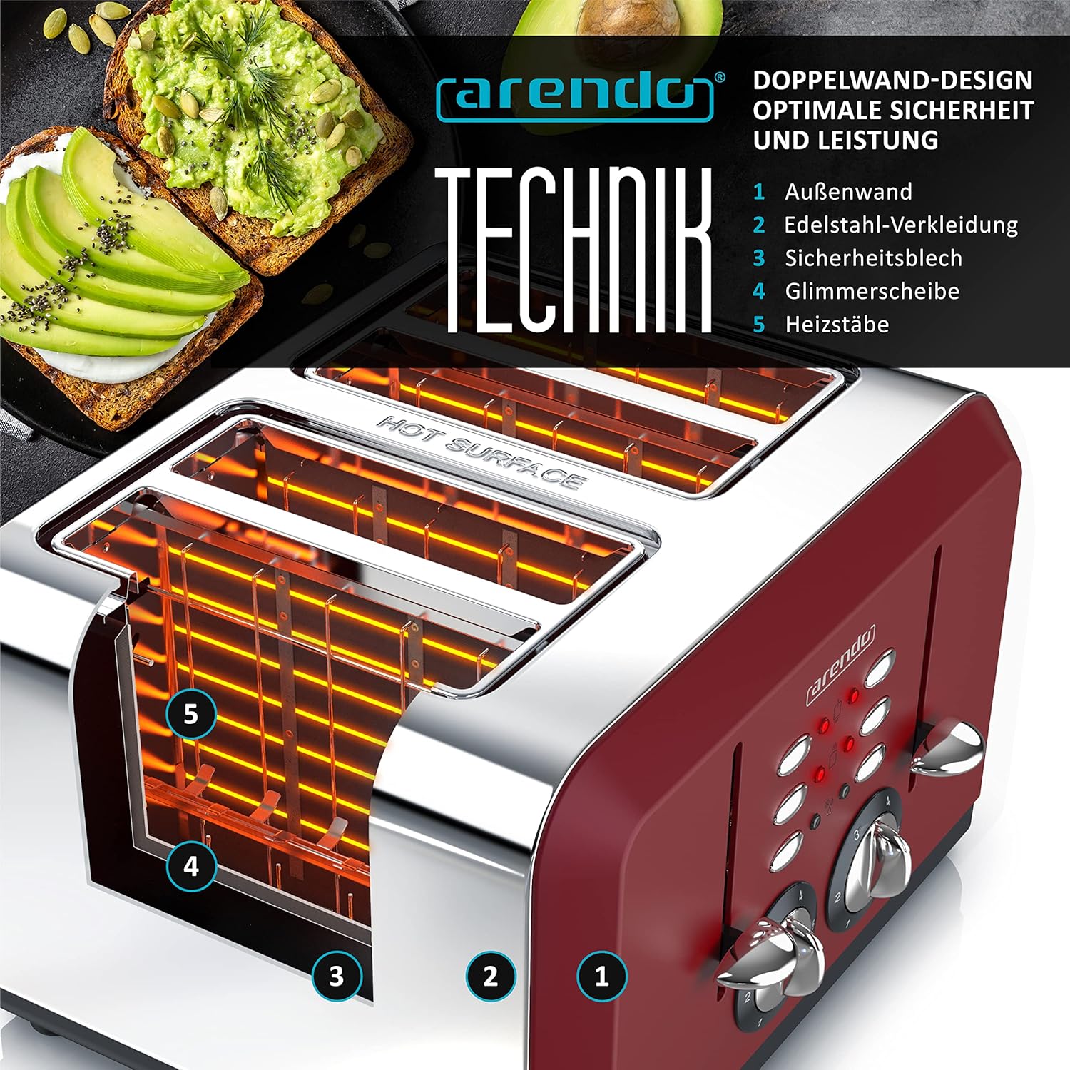Автоматичен тостер Arendo за 4 филийки, корпус от неръждаема стомана, до четири филийки хляб/препечен хляб за сандвичи, нива на препичане 1-6, функция за затопляне и размразяване, отделение за трохи, сертифициран GS, в червено