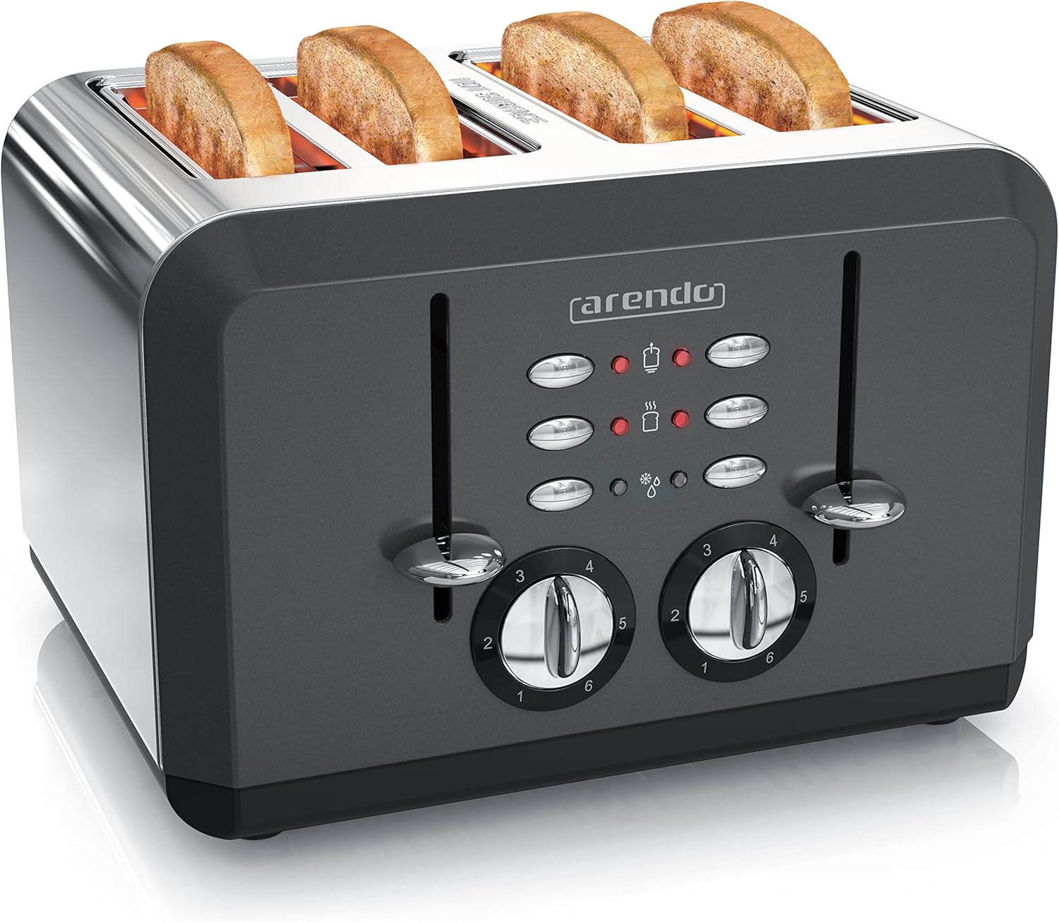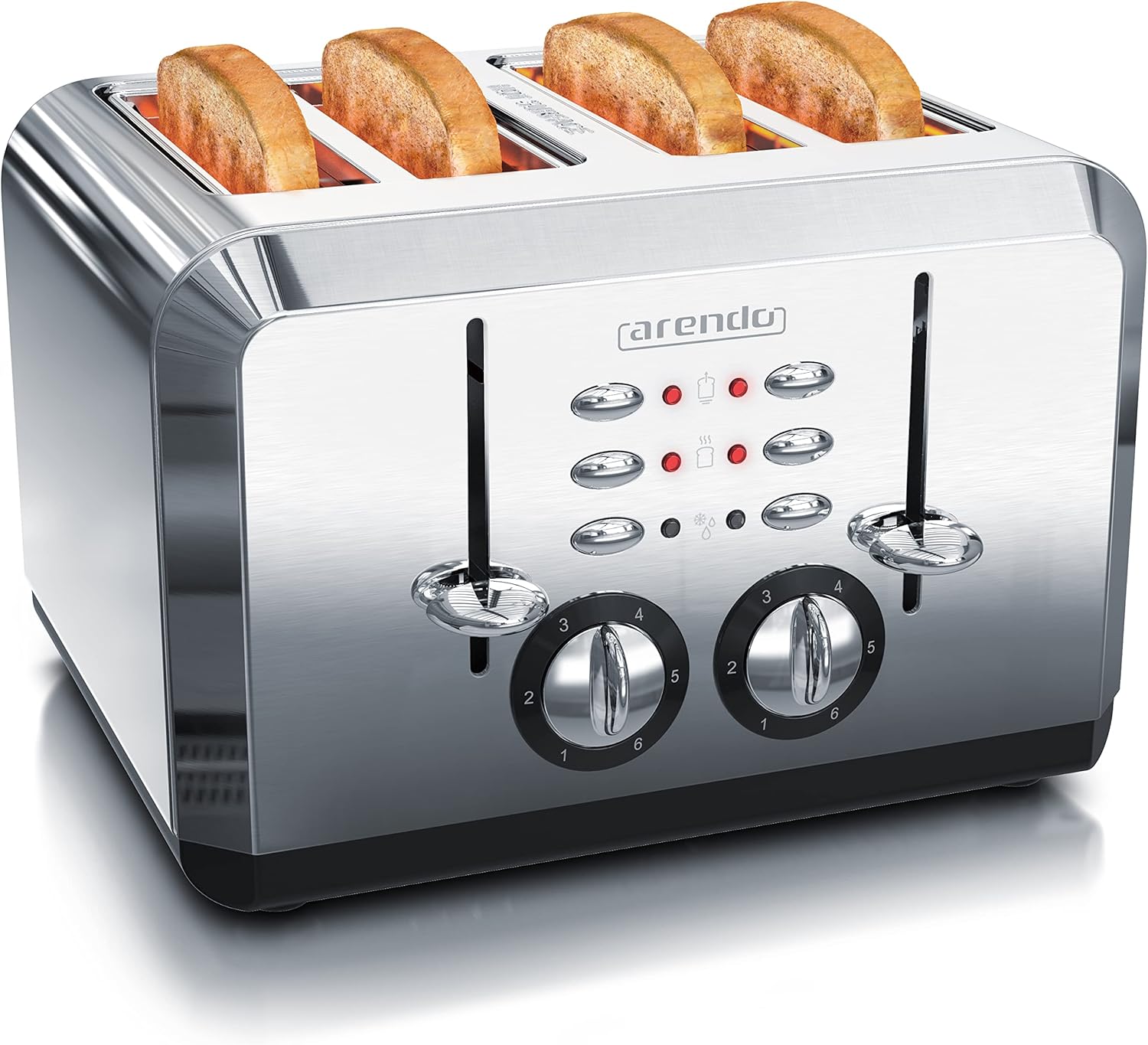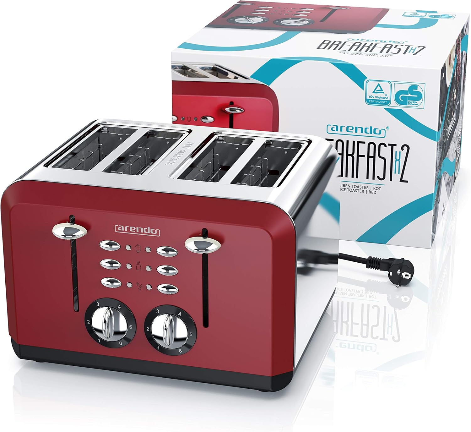 Автоматичен тостер Arendo за 4 филийки, корпус от неръждаема стомана, до четири филийки хляб/препечен хляб за сандвичи, нива на препичане 1-6, функция за затопляне и размразяване, отделение за трохи, сертифициран GS, в червено