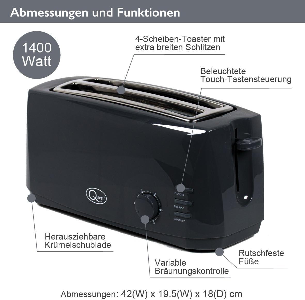 Автоматичен тостер Quest за 4 филии, черен – Изключително широки дълги отвори за палачинки и гевреци – 6 настройки – Функция за претопляне и размразяване