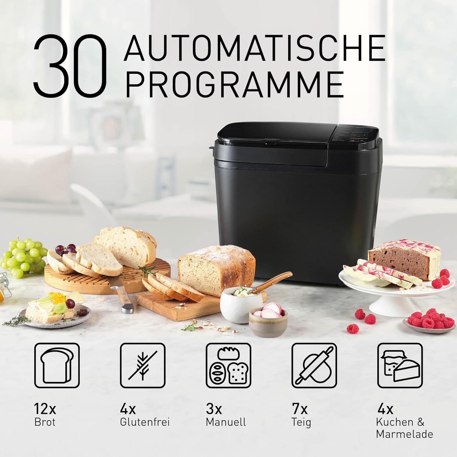 • Автоматични и ръчни настройки: тази първокласна машина за хляб има до 32 програми, включително пълнозърнест хляб, спелта, квасен хляб, бриош, кексове, пица, конфитюр. Просто добавете вода към сместа и готово! Ръчните настройки ви позволяват да проявите креативност.