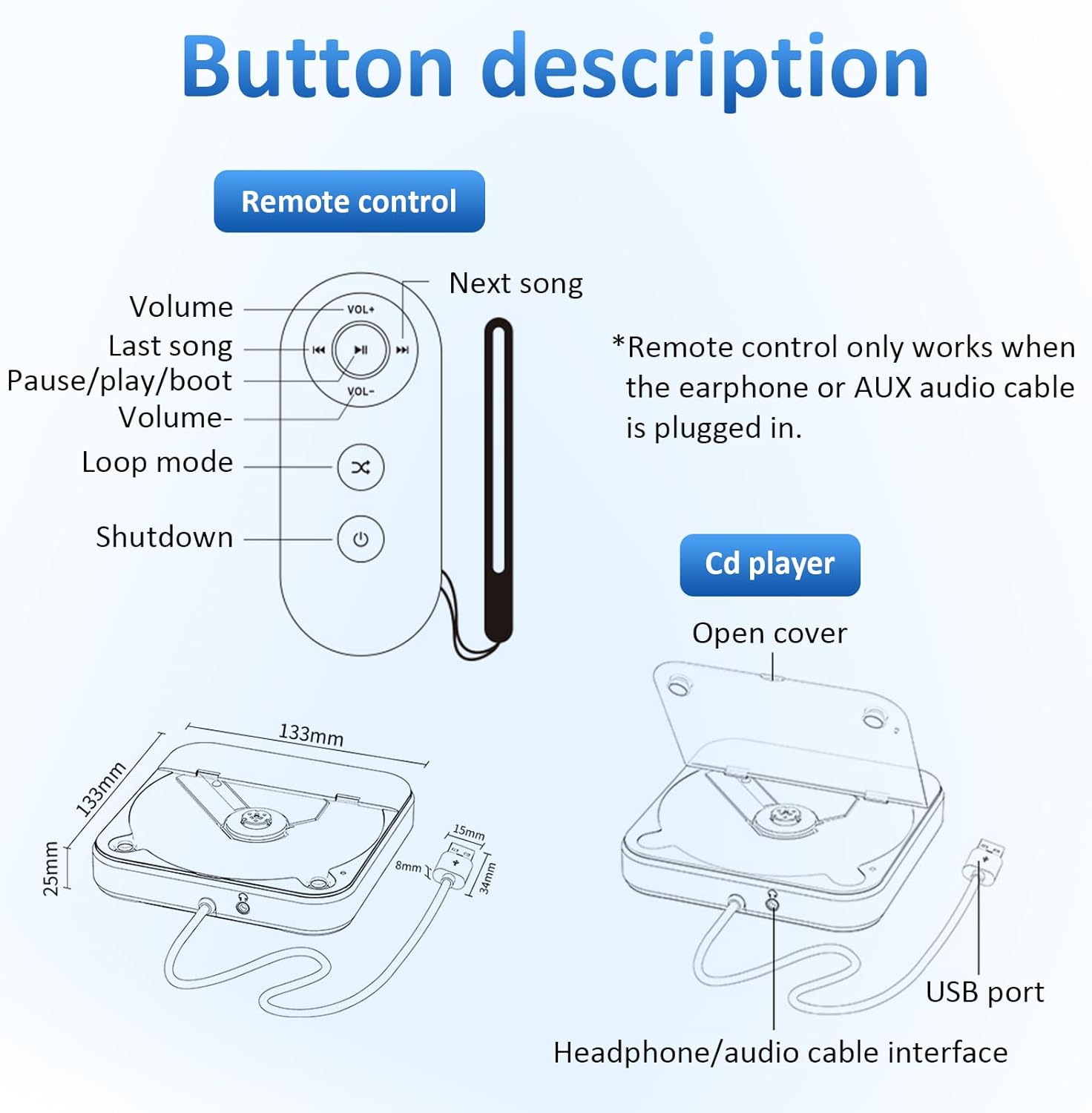 Die Fernbedienung muss funktionieren, wenn Kopfhörer oder ein AUX-Audiokabel angeschlossen sind. Der USB-Anschluss des CD-Players wird mit der Stromversorgung verbunden und durch Einstecken der Kopfhörer kann in den CD-Modus gewechselt werden, um allein Musik zu hören.