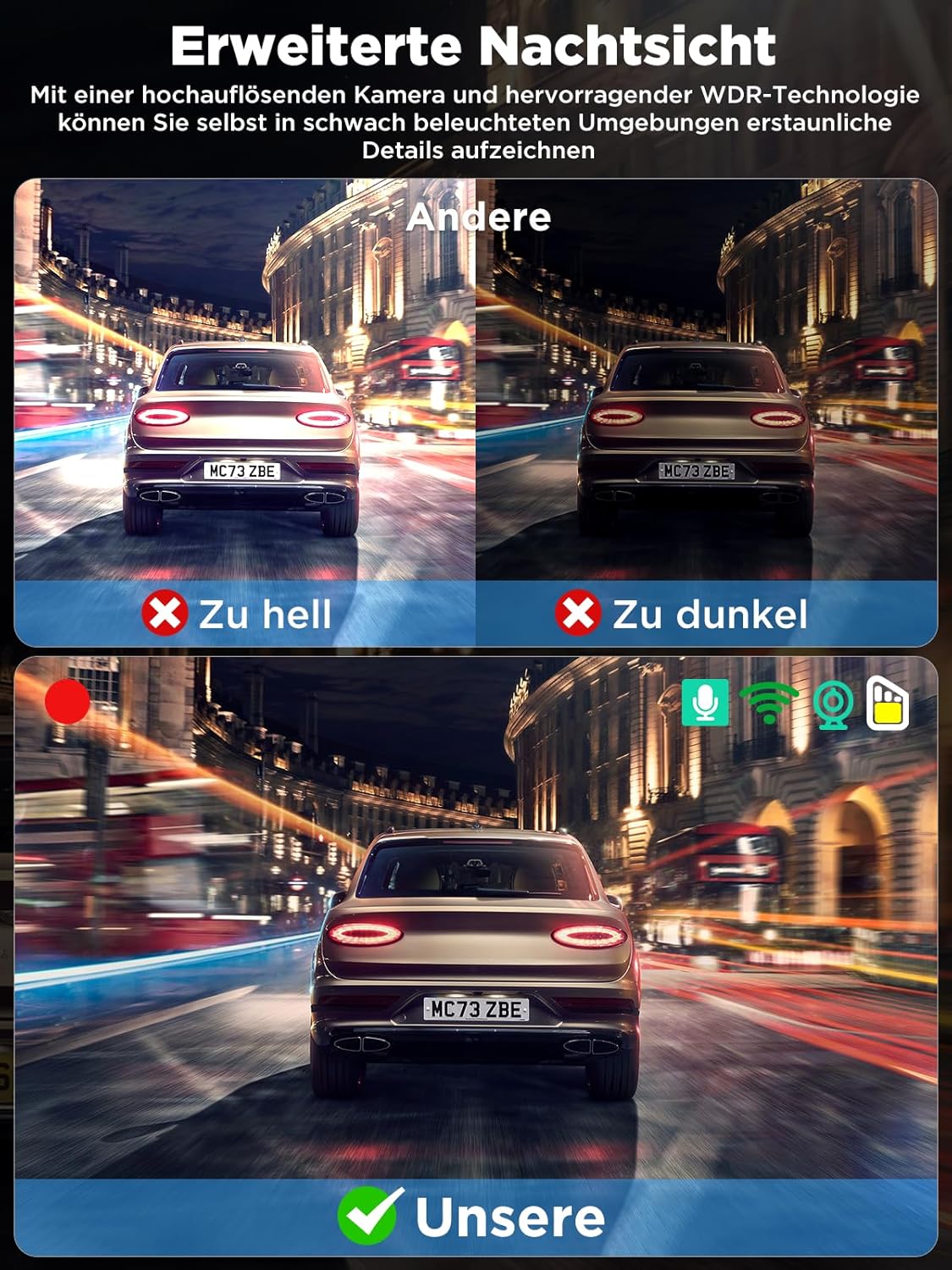 • Einfache Bedienung und komplettes After-Sales-System Für die Bedienung dieser Dashcam sind nicht zu viele Tasten erforderlich. Selbst wenn Sie ein Anfänger sind, können Sie mit unserer Bedienungsanleitung problemlos loslegen. Die Dashcam verfügt über einen 1,97-Zoll-Bildschirm, der Echtzeitvideos anzeigen kann, ein eingebautes Mikrofon und Sprachansagen. Wir bieten eine zweijährige Garantie und lebenslangen technischen Support. Sollten Sie während der Nutzung auf Probleme stoßen, können Sie sich gerne an uns wenden. Wir werden Ihnen innerhalb von 24 Stunden helfen und dafür sorgen, dass Sie zufrieden sind.
