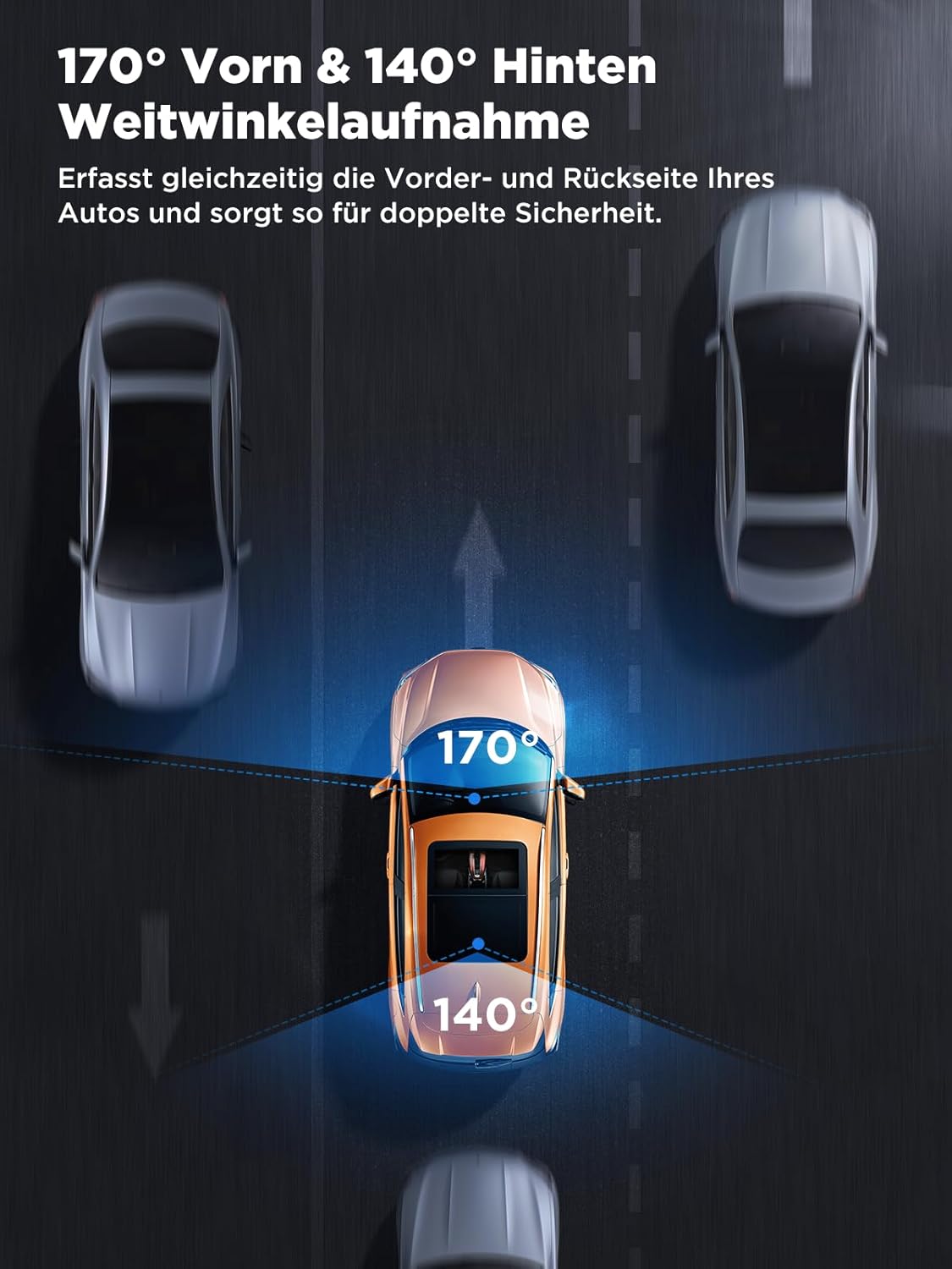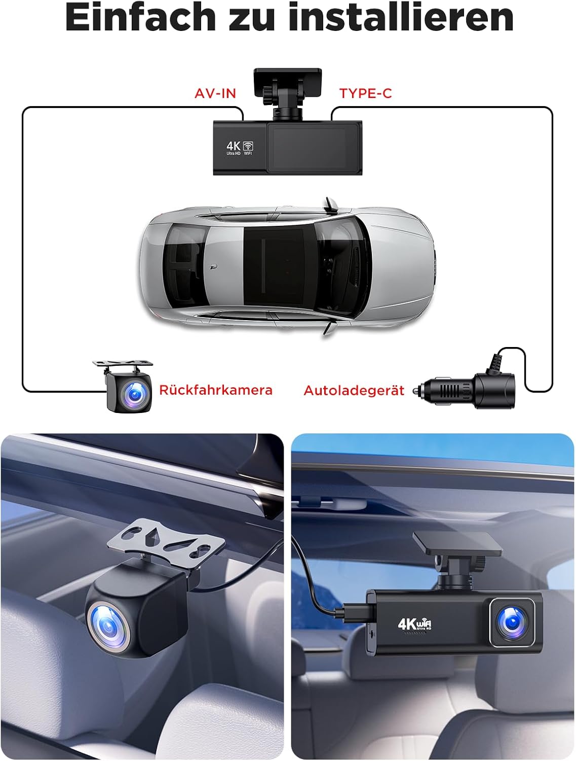 • Kompaktes Design und einfache Installation Diese Dashcam wurde von professionellen Produktdesignern mit kompakter Struktur, schönen Proportionen, exquisiter und kleiner Größe entworfen, die die Sicht des Fahrers und das Innendesign des Autos nicht beeinträchtigt. Plug and Play, einfache Installation, komplettes Zubehör. Die Front- und Rückkameras der Dashcam können den Aufnahmewinkel anpassen. Die Rückkamera ist gut wasserdicht und kann sowohl innerhalb als auch außerhalb des Autos installiert werden, was praktischer ist.