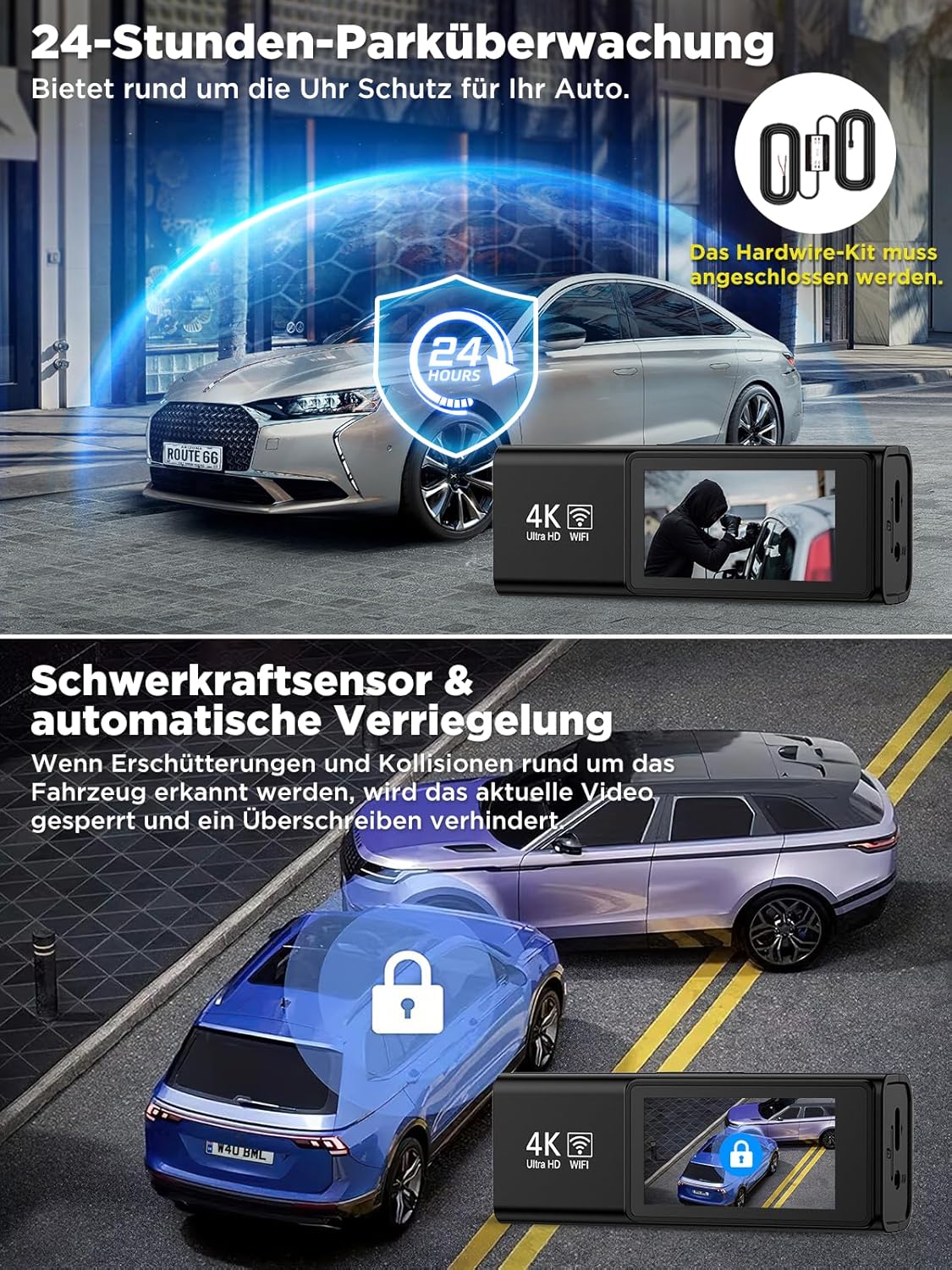 • 24-часово наблюдение на паркирането Когато колата ви е спряла, видеорегистраторът автоматично превключва в режим на паркиране за непрекъснато наблюдение, осигурявайки денонощна защита на вашето превозно средство. (Тази функция изисква комплект за окабеляване, който можете да получите, като се свържете с нас.) Видеорегистраторът е оборудван със сензор за гравитация, който бързо открива внезапни сблъсъци или удари, заключва съответните обективи навреме и автоматично защитава важни видеоклипове от презаписване, така че те да могат да служат като релевантно доказателство в критични моменти.