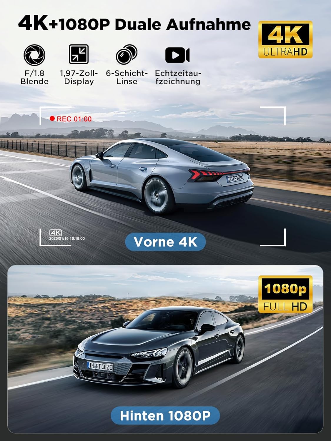 • Topabol 4K+1080P видеорегистратор Този видеорегистратор е оборудван с предна камера с ултрависока резолюция 4K и задна камера с Full HD 1080P резолюция. Двойните камери заснемат всеки детайл на пътя, като пътни знаци, регистрационни номера и предупредителни знаци, с висока резолюция. Те записват пътните условия и пейзажа по маршрута, запазват пълни и ясни видеоклипове на произшествия като доказателство и едновременно наблюдават предния и задния изглед, осигурявайки цялостно чувство за сигурност.