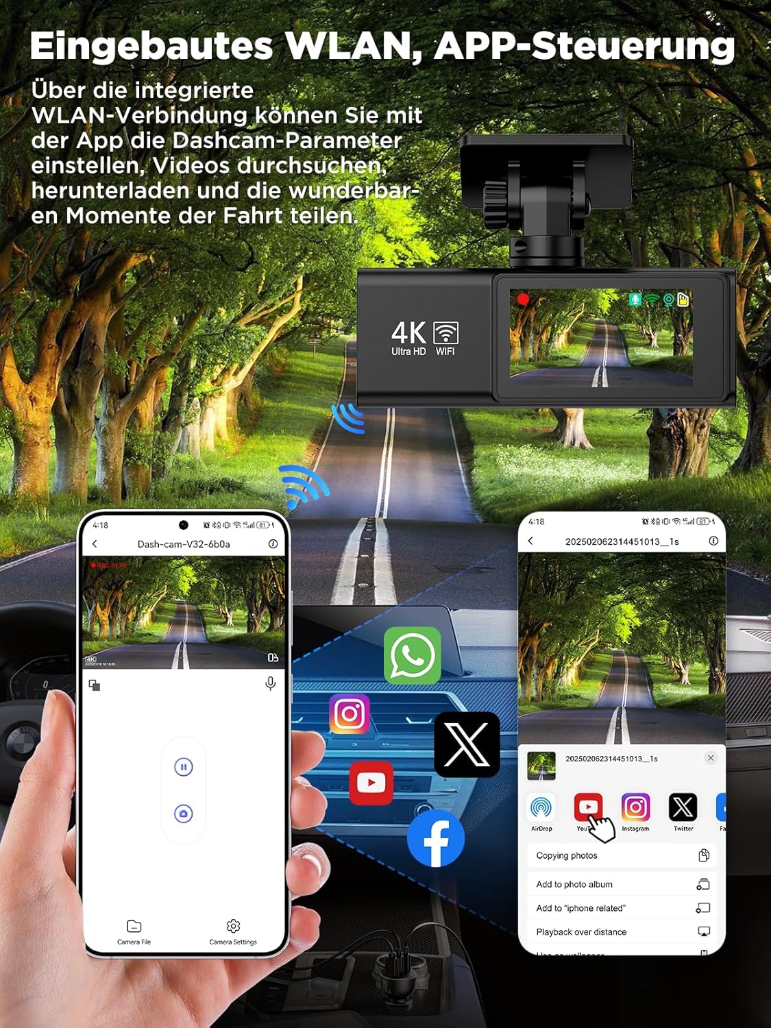 • WiFi- und APP-Steuerung Die Dashcam bietet WiFi-Funktion und das Mobiltelefon kann über WiFi verbunden werden. Sie können das Video einfach auf das Mobiltelefon übertragen und direkt ansehen und die Echtzeitvorschau des Videos erleben, ohne die Speicherkarte herauszunehmen. Mit der App können Sie die Funktionen und Parameter der Dashcam einstellen und anpassen, gespeicherte Fahrvideos herunterladen, Videodateien bearbeiten und die schöne Landschaft der Fahrt mit Ihrer Familie und Ihren Freunden teilen.