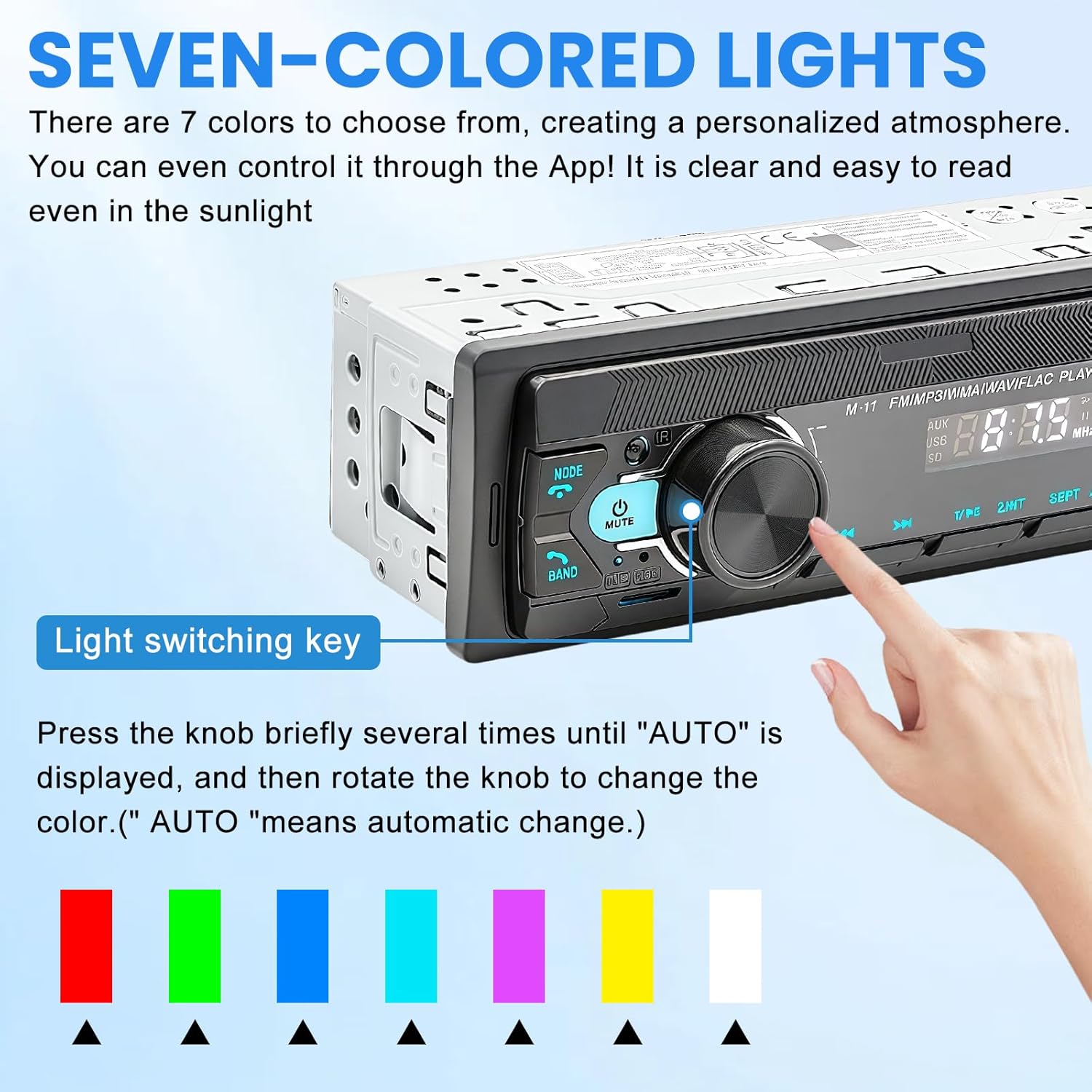 Bluetooth автомобилното радио предлага 7 регулируеми цвята на LED фона.