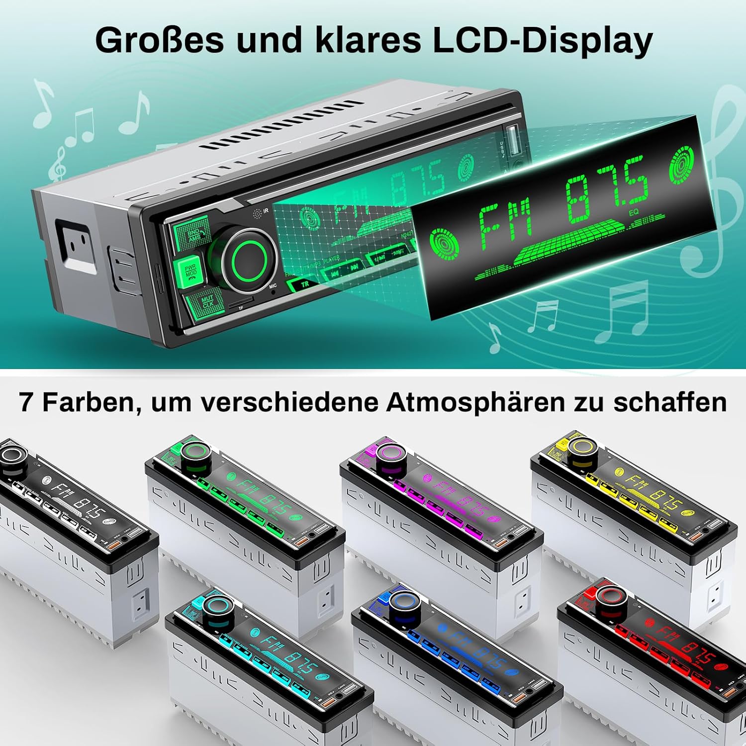 • Голям LCD екран със 7 цвята: Екранът е по-голям от повечето автомобилни радиостанции на пазара, а усъвършенстваната технология на дисплея прави изображението по-ясно дори при ярка слънчева светлина. Автомобилното радио има 7 цвята осветление, като можете да променяте цветовете според настроението си или да ги сменяте автоматично.