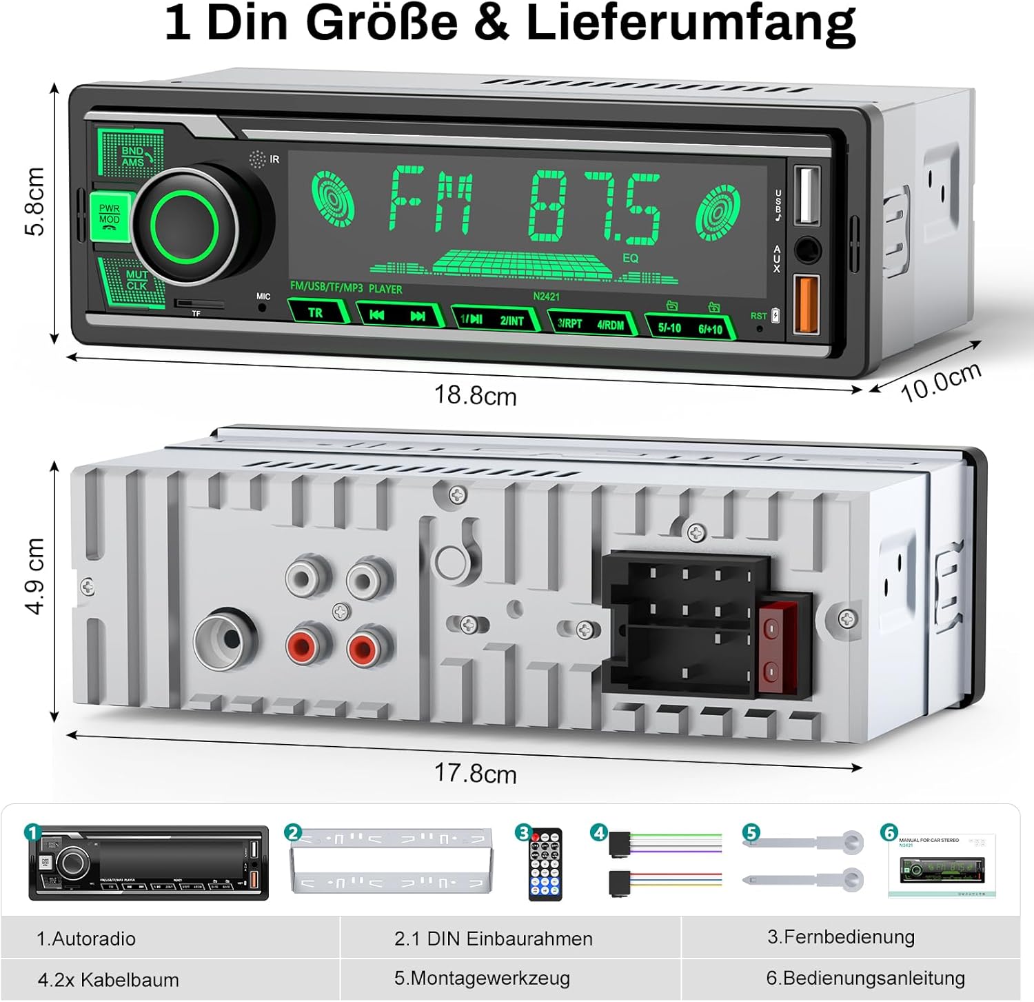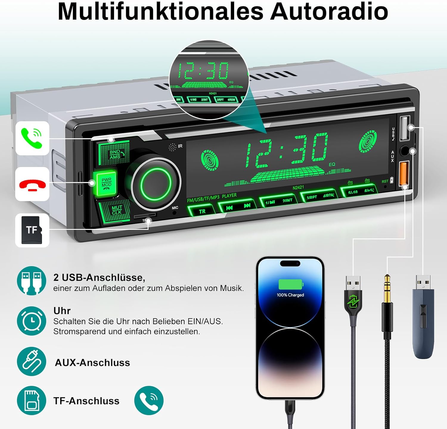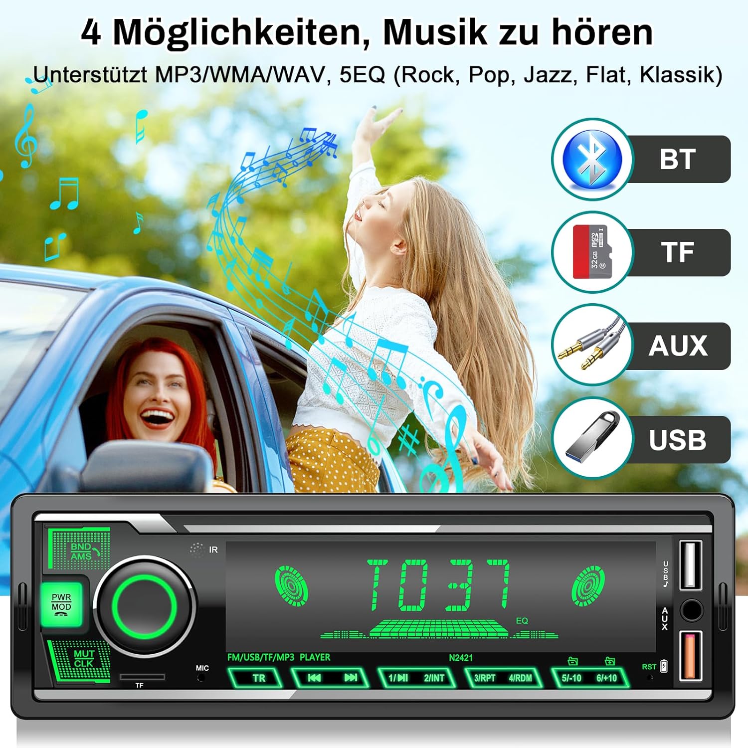 • Лесно за употреба: Bluetooth автомобилното радио с 2 USB порта, единият USB порт за бързо зареждане с 2.1A, другият USB порт за музика (поддържа MP3/WMA/WAV формат за възпроизвеждане). SD картата и AUX входът са готови за употреба.