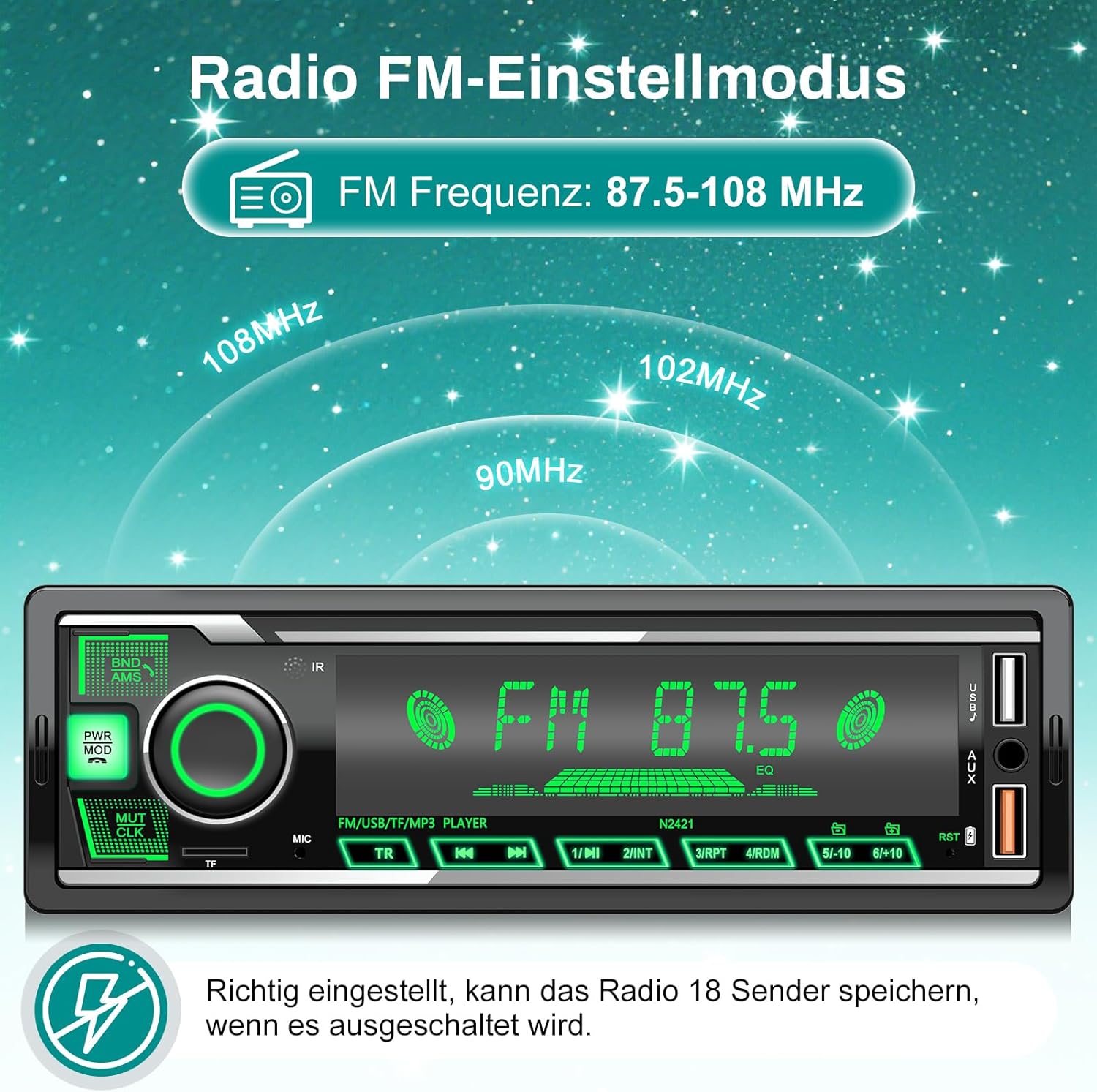 • FM автомобилно радио с функция за запаметяване на предавателя: FM радио обхват: 87.50MHz~108.00MHz, могат да бъдат запазени 18 предварително зададени радиостанции. Насладете се на ясен и надежден прием. Интуитивното управление и компактният дизайн на автомобилното радио са проектирани за комфорт и го правят идеален спътник за пътувания с кола, пътуване до работа или ежедневно каране.
