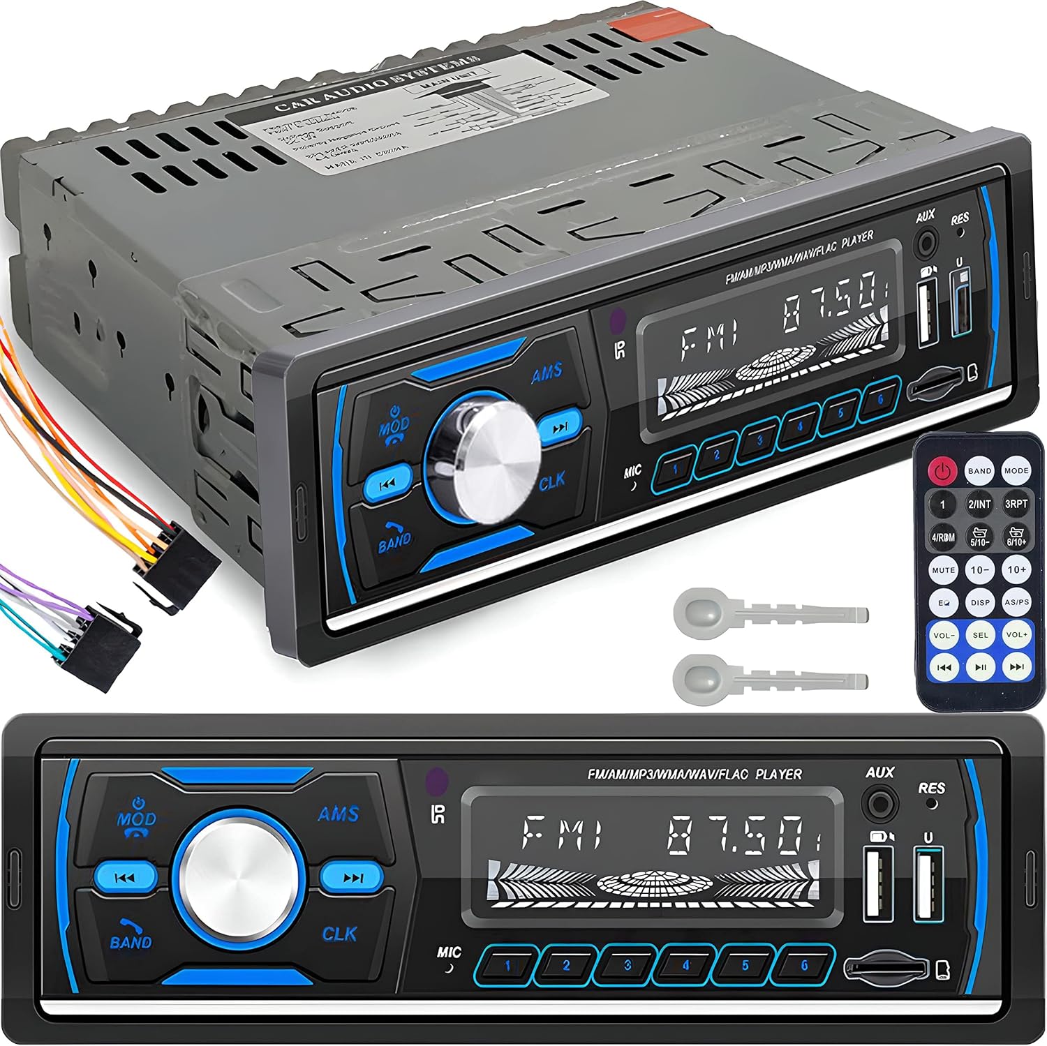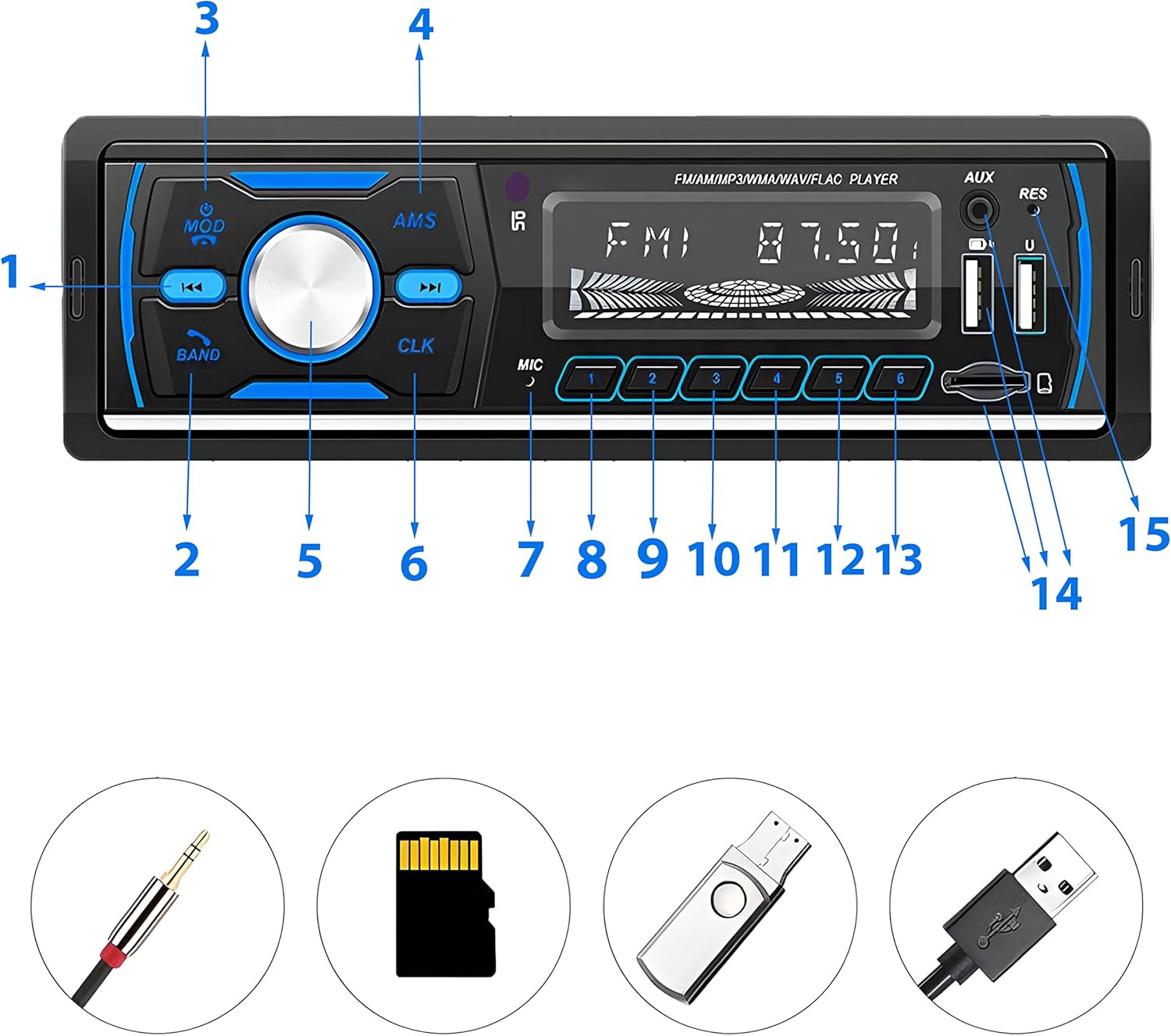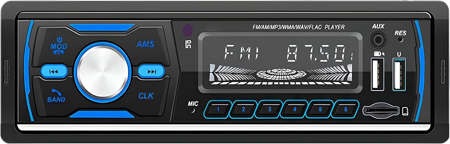 The 1 DIN car radio has many useful functions that make your car journeys more enjoyable. In addition to the AM FM tuner, the radio also allows you to play popular MP3 and WMA files from memory sticks or microSD cards. You can also connect non-Bluetooth devices via the AUX output and enjoy great sound from speakers and subwoofers.