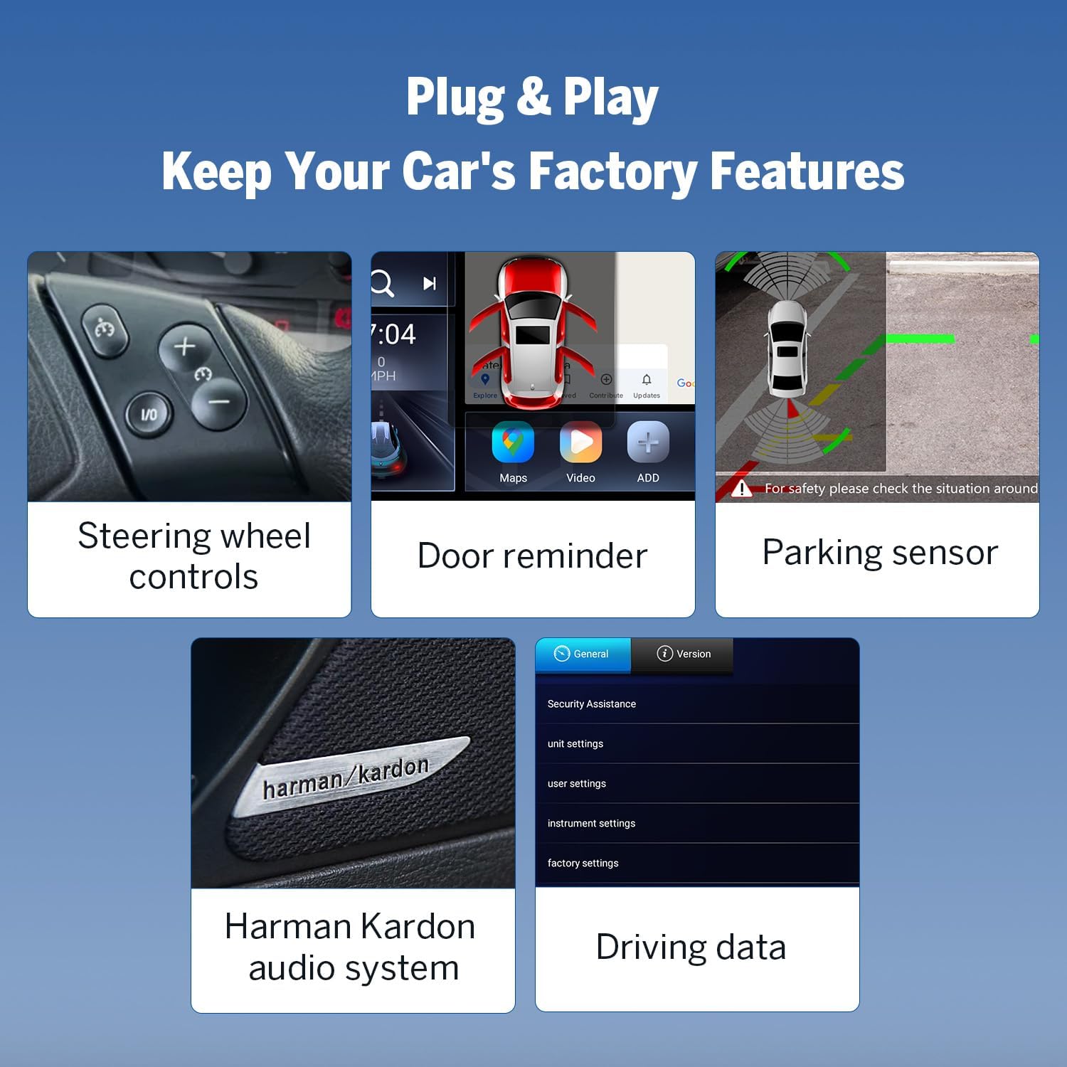 • 【Запазване на OEM характеристики】: Plug & Play и запазване на фабричните функции, включително управление от волана, информация за вратите и показване на данни за пътуването и др. Този Apple Car Player се предлага с 3 вградени теми на потребителския интерфейс, от които можете да избирате. Лесно персонализирайте автомобилното си радио по ваш вкус.