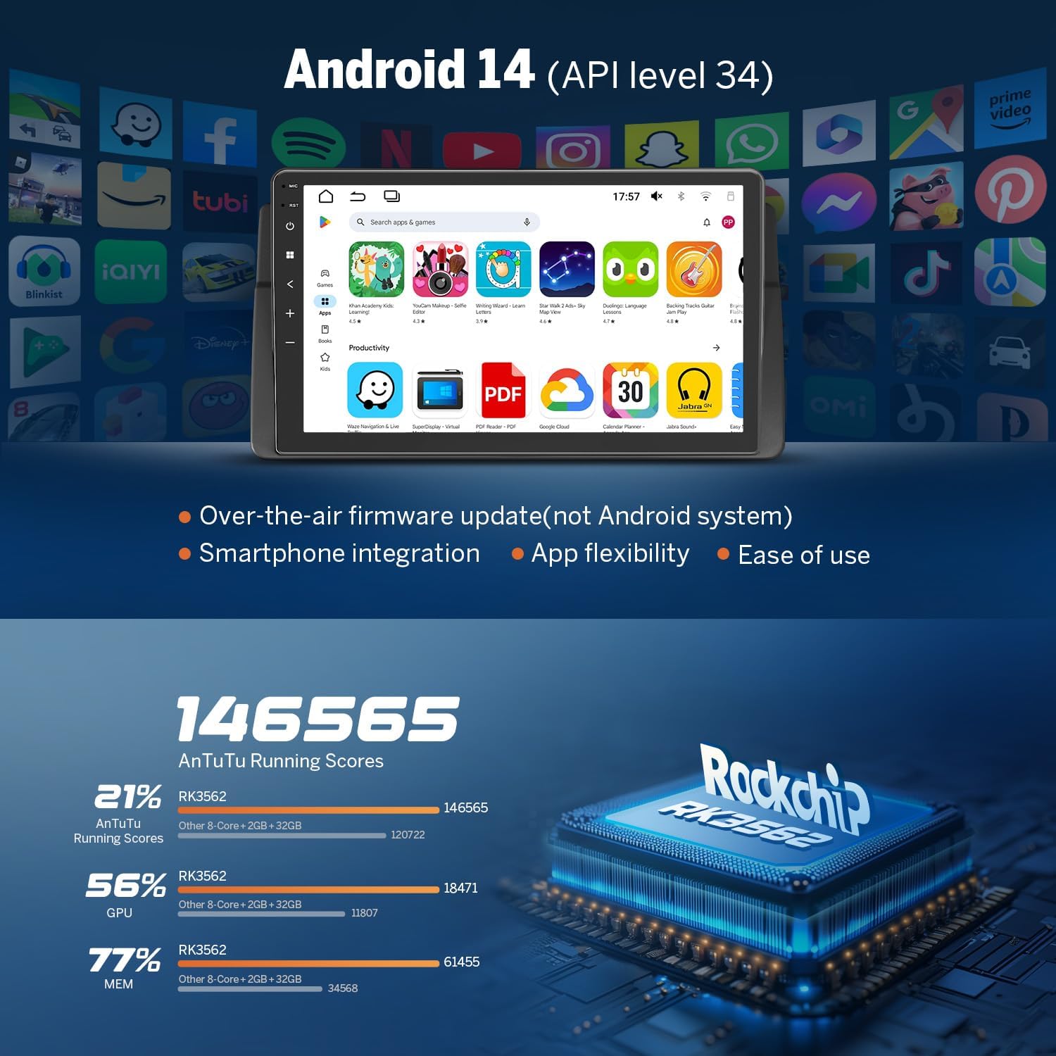 • 【Android 14 автомобилно радио за BMW E46】: Работещо с най-новата операционна система Android 14, това автомобилно радио осигурява плавна работа без забавяне или заекване. Новият процесор Rockchip осигурява висока производителност и ниска консумация на енергия, надминавайки обикновените 8-ядрени процесори. Подходящо за модели BMW E46 от 1998 до 2006 г. Разполага с CANBUS декодер. Когато е свързано, то поддържа синхронизиране на информация от оригиналните настройки на автомобила, като например управление на волана, радарна информация и др.