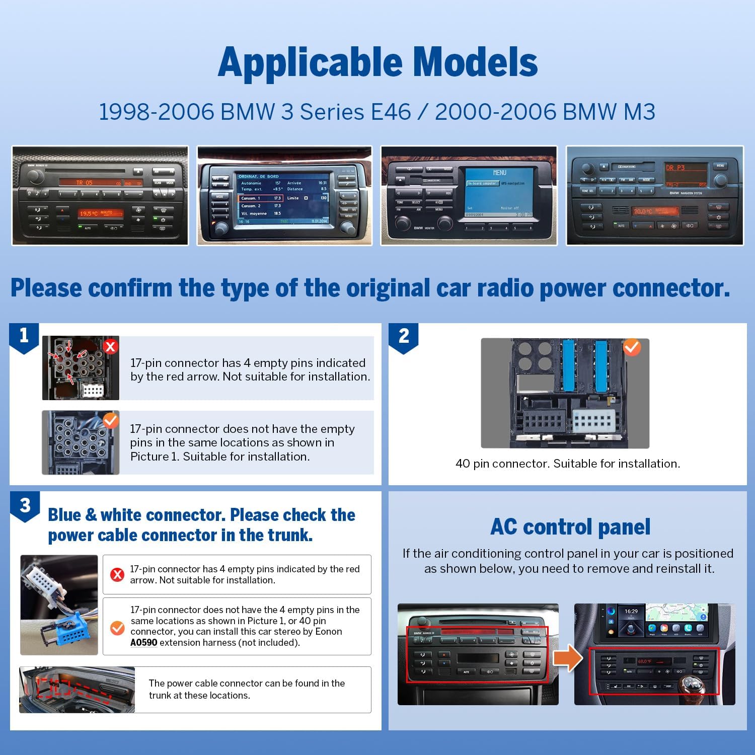 Авторадио Eonon, съвместимо с BMW E46 1998-2006, Android 14 CarPlay, Android Auto, MirrorLink, 3+32 GB GPS, Bluetooth, USB-RCA изход, поддържа камера за заден ход, онлайн актуализация E46X7