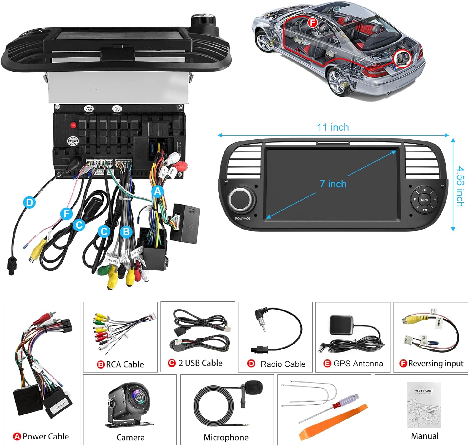 This Fiat 500 car radio head unit supports return input and automatically switches when reversing or parking the vehicle. Ensure safety when driving. The reversing ambient live detection, safe and comfortable parking aid. Reversing camera is included: 170° wide angle, night vision and IP69 waterproof.