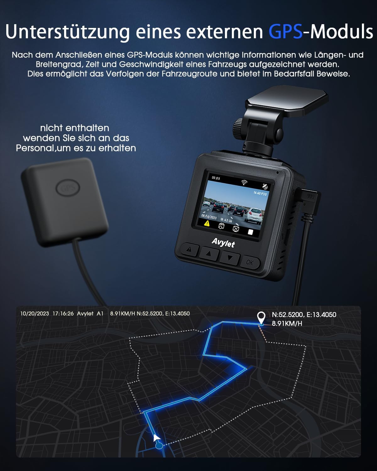 Avylet Автомобилна видеокамера за кола WiFi 2K, Мини предна камера за кола с външен GPS модул, 1.5" IPS екран, приложение, ултра нощно виждане и 150° широкоъгълен обхват, WDR, 24/7 режим на паркиране с разпознаване на движение, G-сензор
