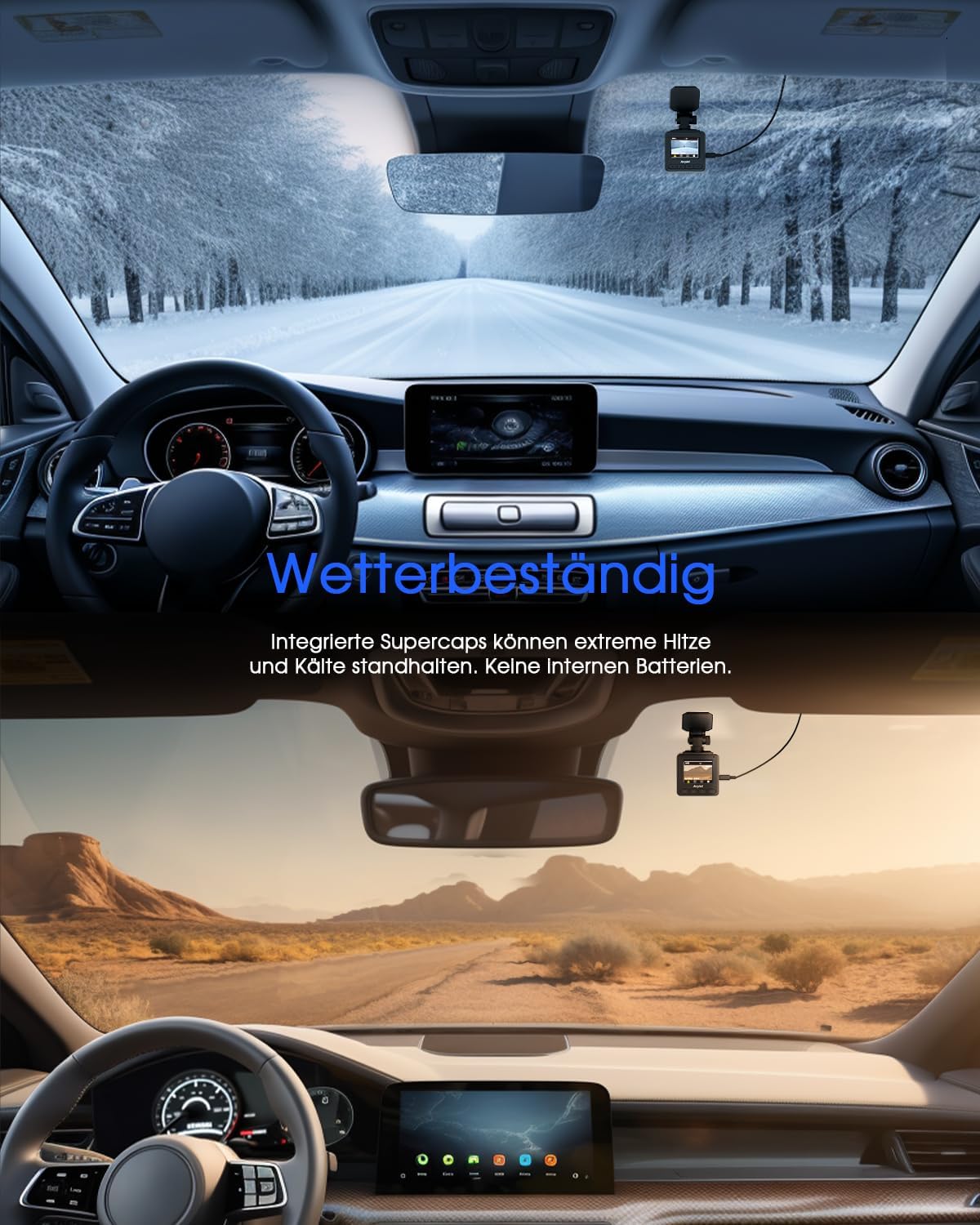 • Superkondensator (keine eingebaute Batterie!): Ausschließliche Stromversorgung über Zigarettenanzünder. Zuverlässiger Betrieb bei Extremtemperaturen von -20 °C bis 70 °C. Keine Wärmeausdehnungsrisiken, bis zu 30 % längere Lebensdauer. Wichtig: Kein kabelloses Laden möglich! Kein Zigarettenanzünder im Fahrzeug? Kontaktieren Sie uns für eine professionelle Individuallösung!