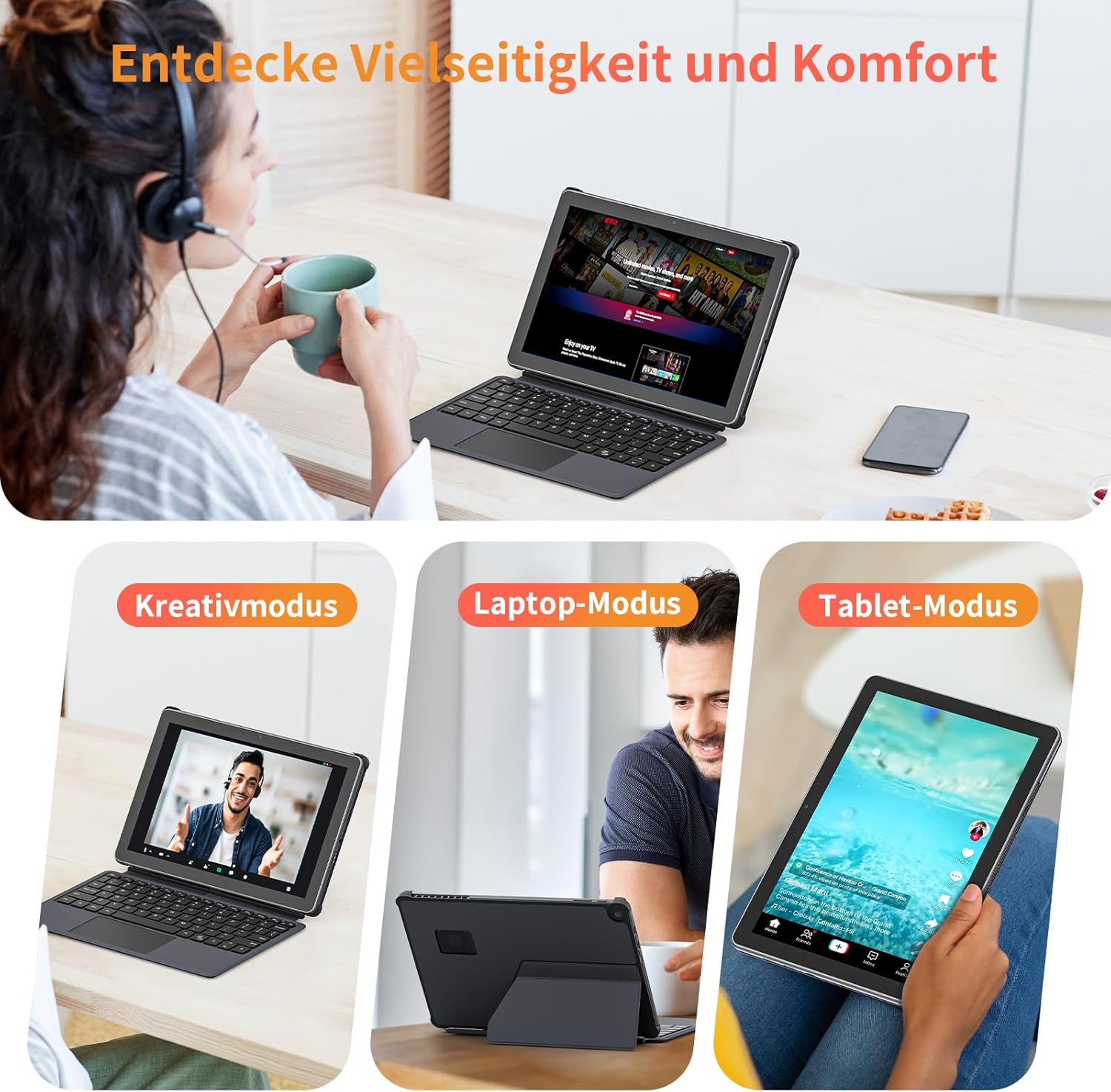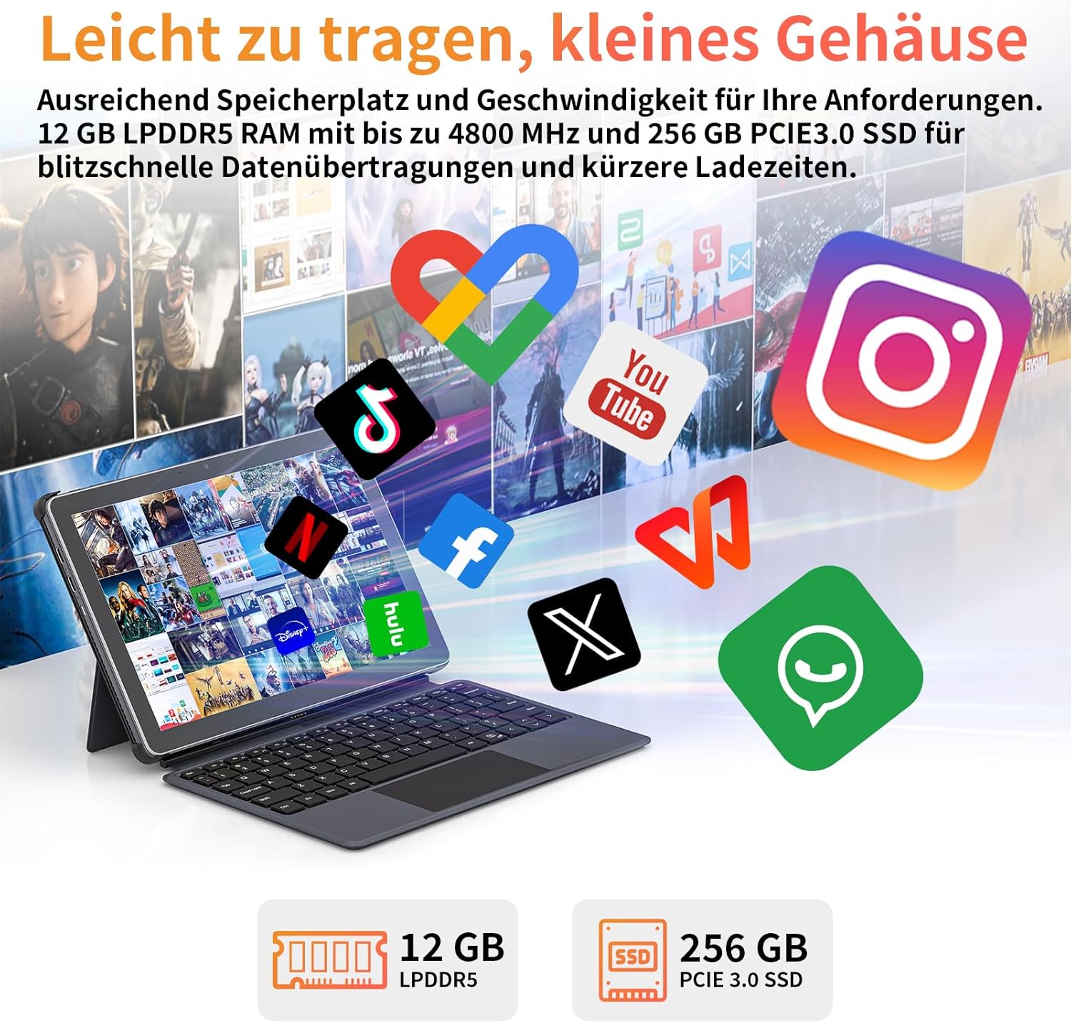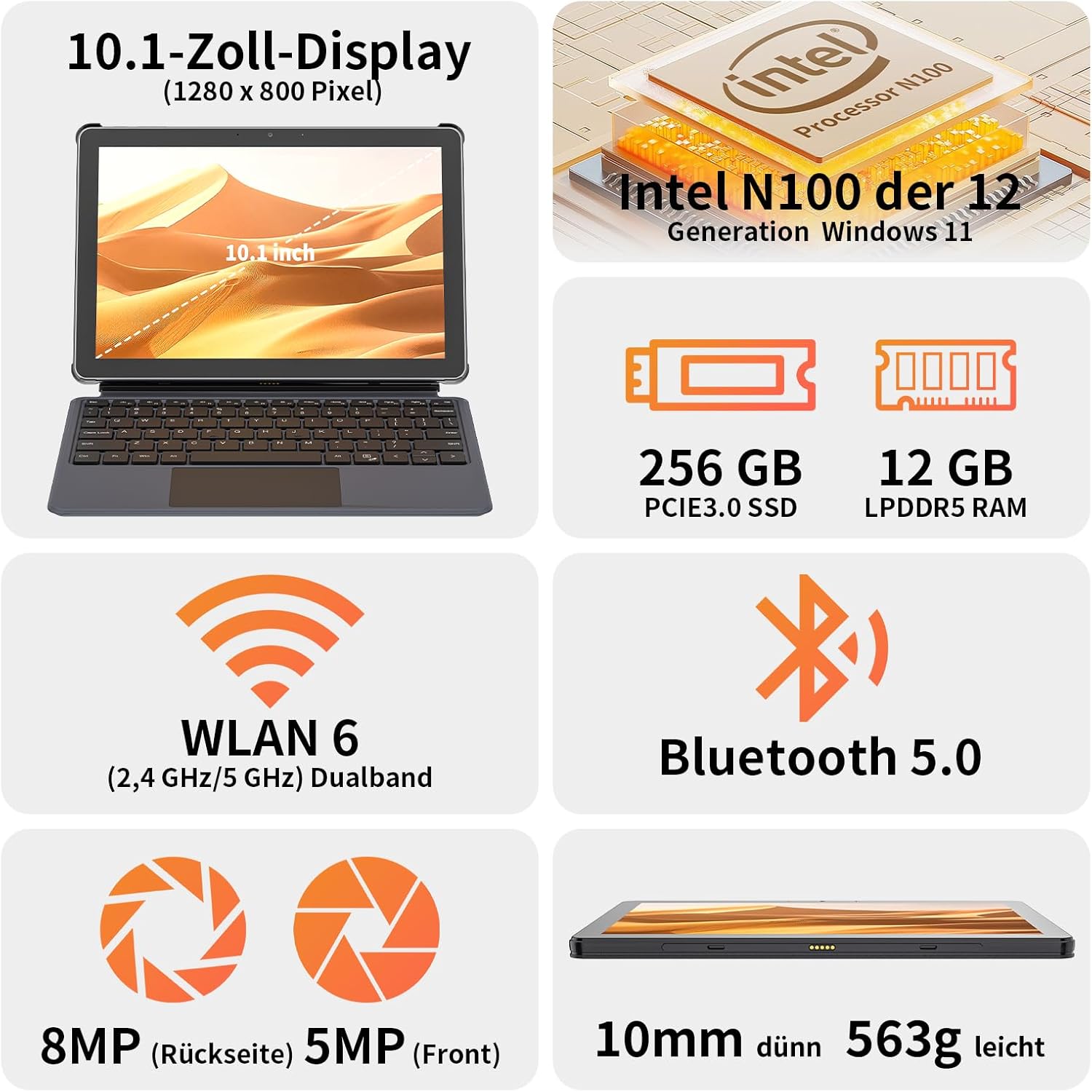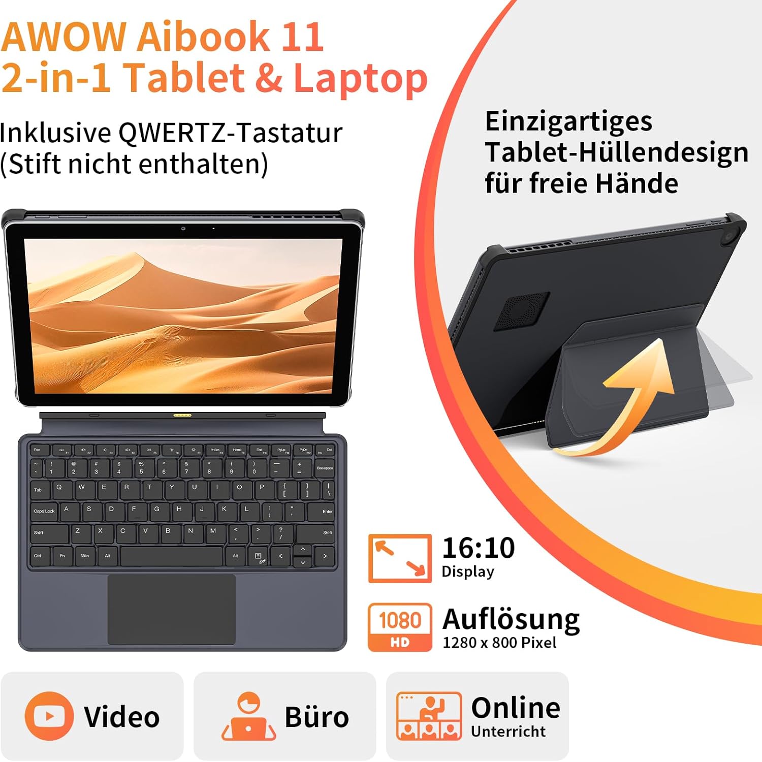 AWOW AIBOOK 11 10.1-инчов 2-в-1 таблет WI-11 с немска клавиатура – ​​12GB LPDDR5 RAM, 256GB PCIE3.0 SSD, Gen12 N100, сензорен екран, двубандов WiFi, USB-C, HDMI, 8MP камера