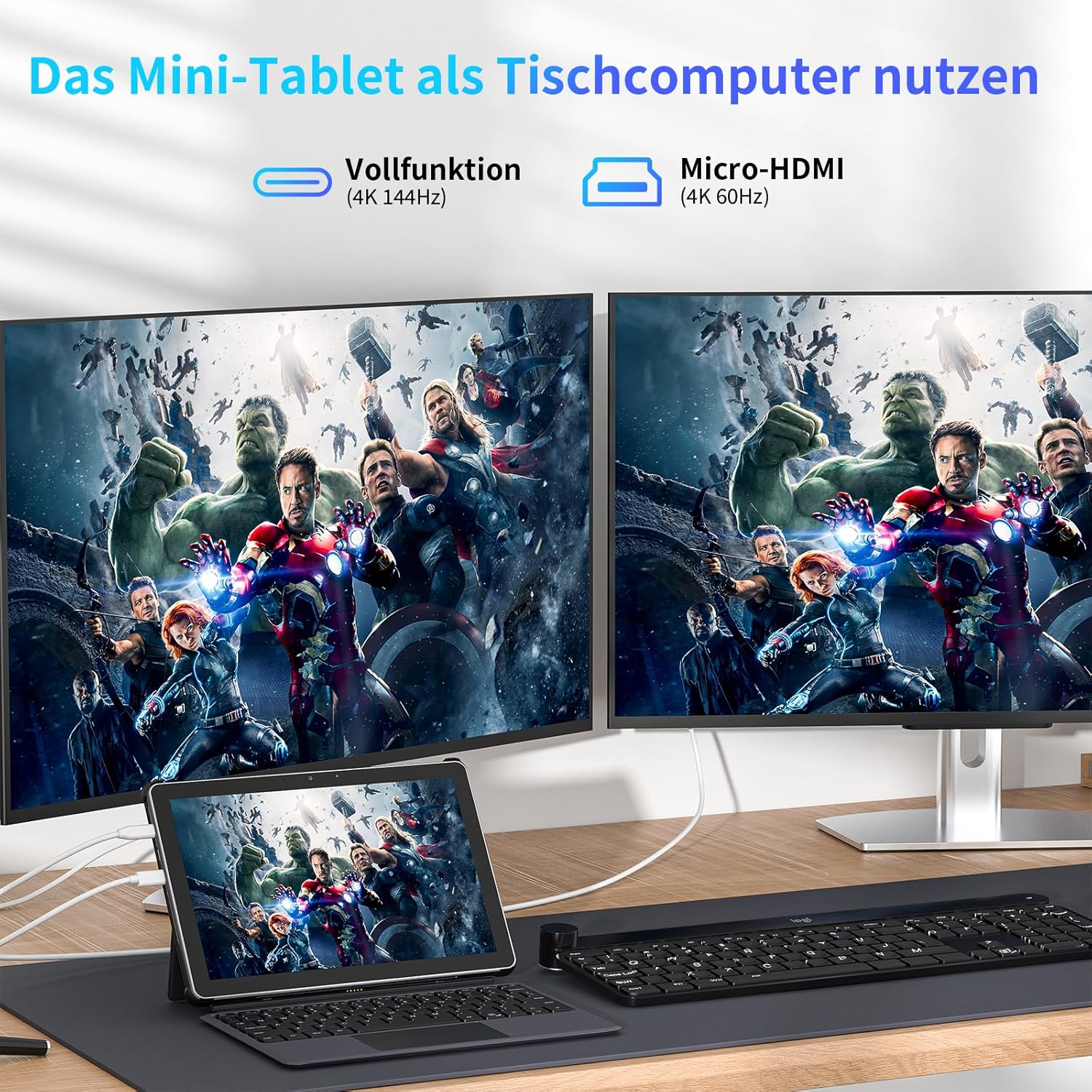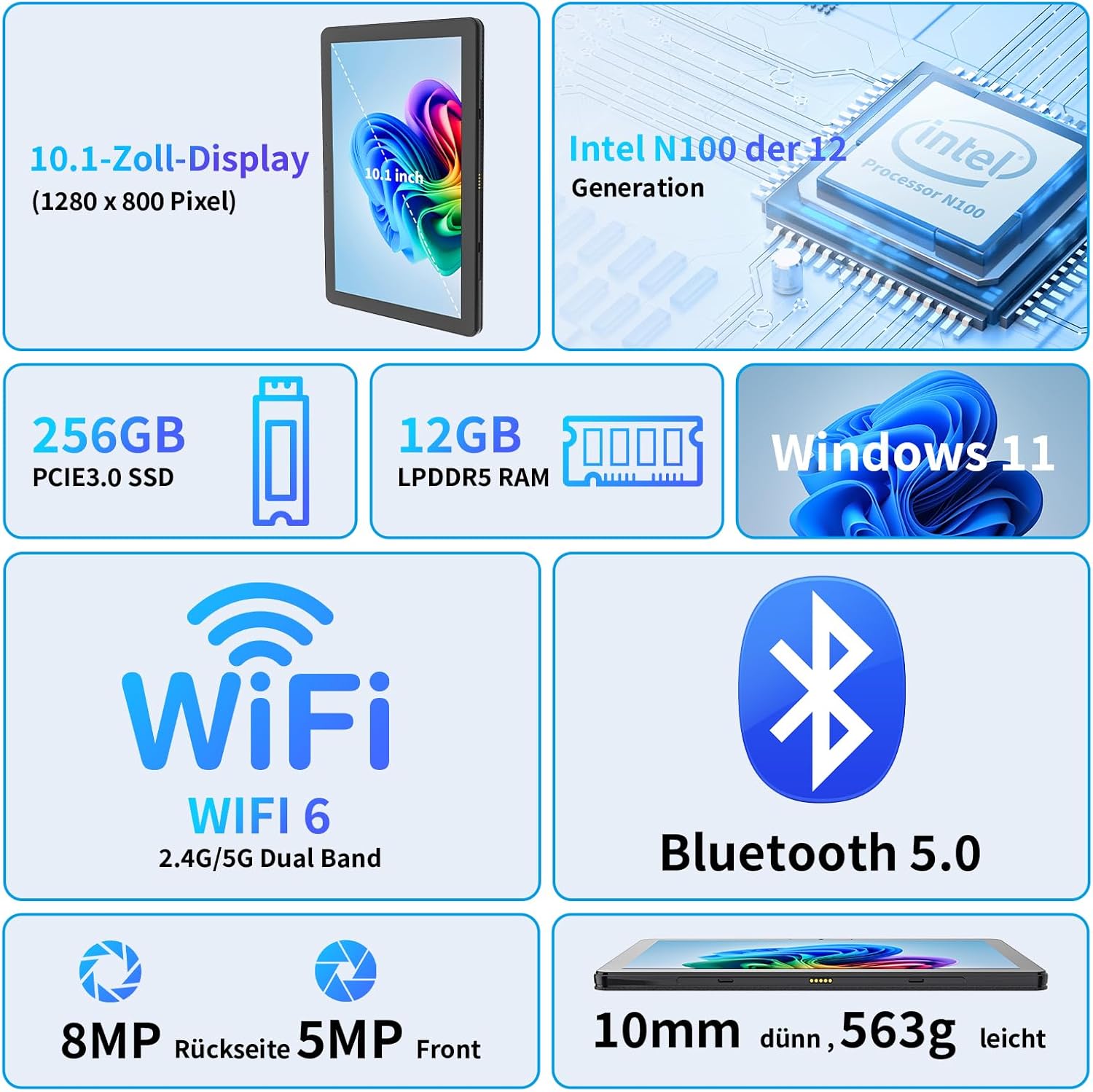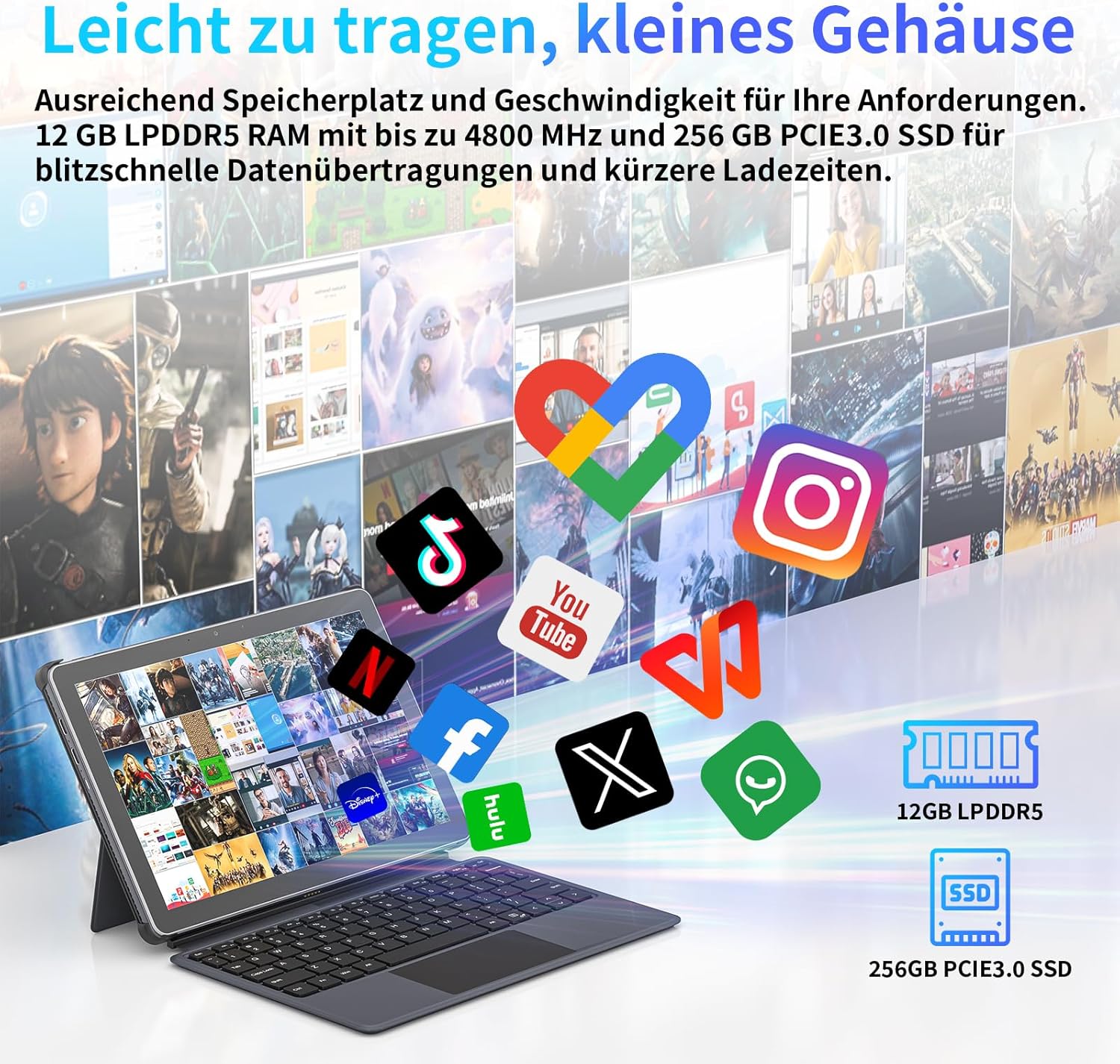 AWOW AIBOOK 11 10.1-инчов Wi-Fi 11 таблет с клавиатура – ​​Gen12 N100, 12GB LPDDR5 RAM, 256GB PCIe SSD, FHD сензорен екран, двубандов WiFi, USB-C, HDMI, 8MP камера, немски (2-в-1 лаптоп, трансформиращ се)
