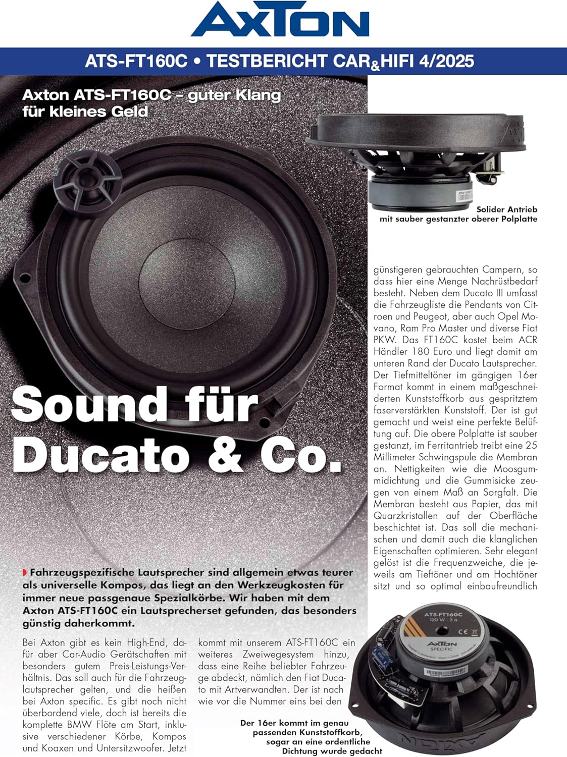 С ATS-FT160C, серията SPECIFIC на AXTON получава перфектно пасваща двупосочна компонентна система „plug & play“, която е съвместима с Fiat Ducato III и структурно идентични модели като Peugeot Boxer II, Citroen Jumper II и Opel Movano C. ATS-FT160C е проектиран специално за монтаж в предните врати.