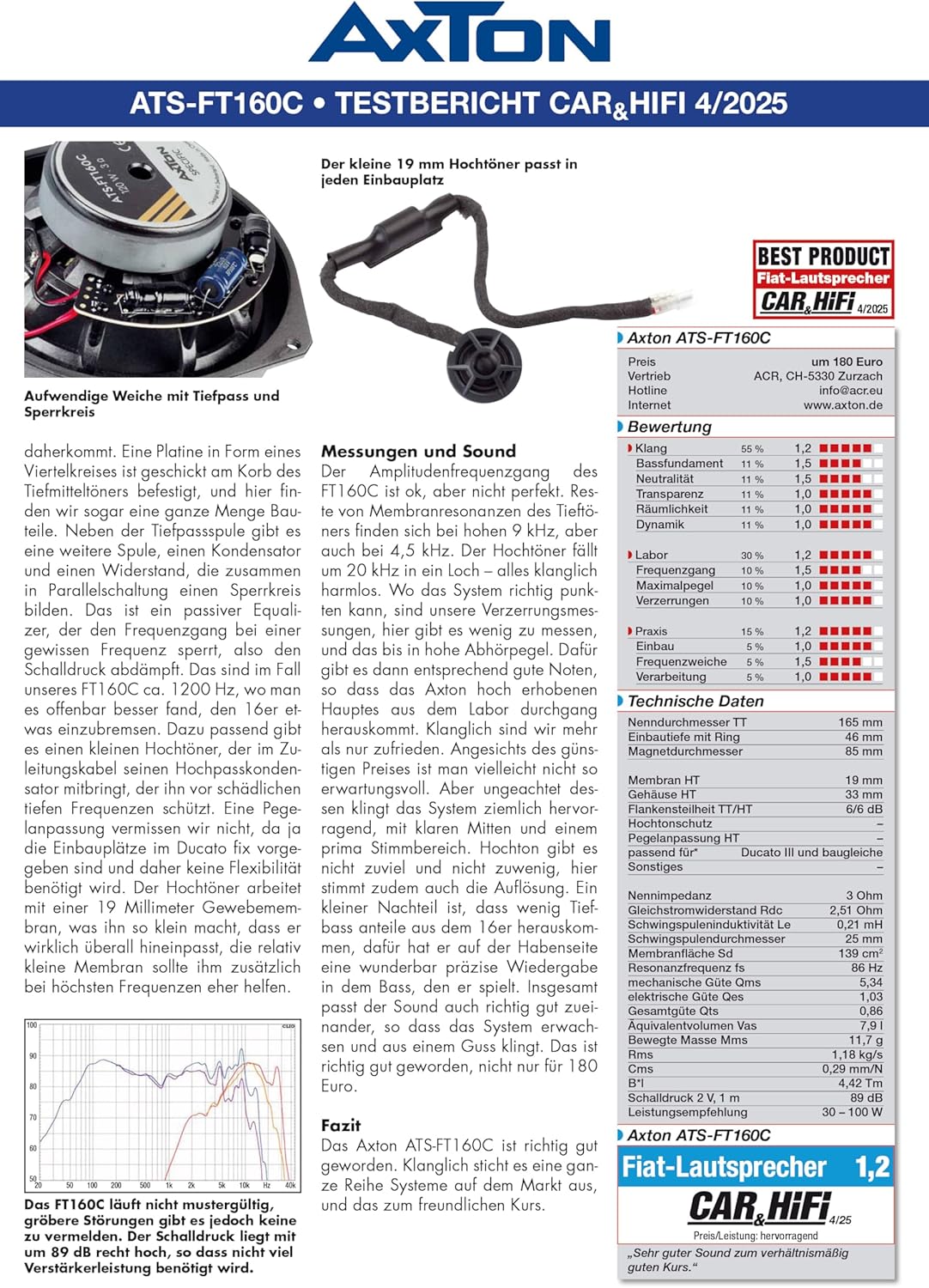 Das ATS-FT160C klingt dadurch sehr harmonisch und akkurat, es hebt Stimmen klar hervor, was insbesondere auch bei Hörbüchern oder auch Telefonaten von großem Wert ist. Der kräftige Ferritmagnet sorgt für Power und unterstützt den definierten, klaren Klang. Der Hochtöner hat eine 20 mm Gewebekalotte und überzeugt mit Brillanz und räumlicher Wiedergabe.