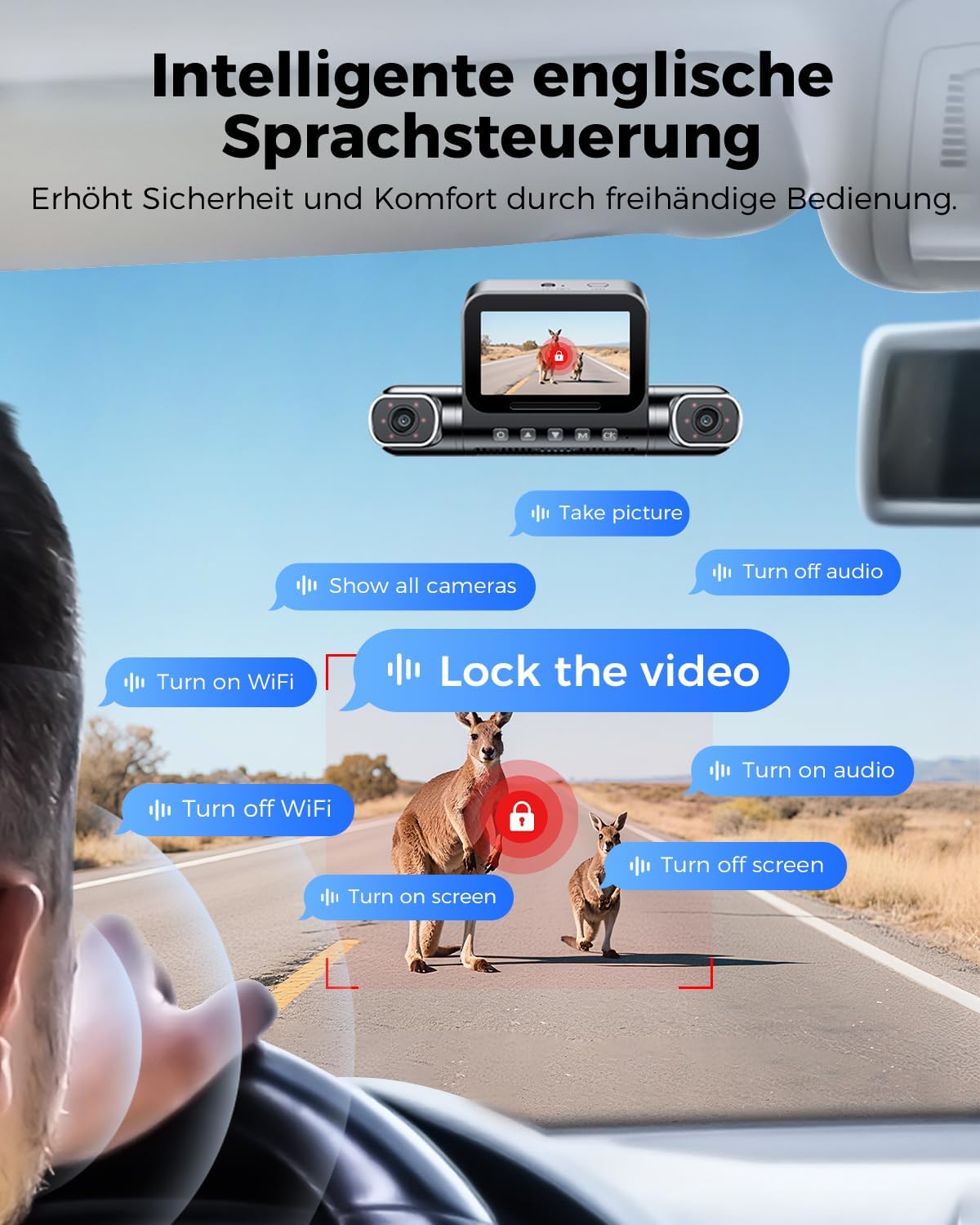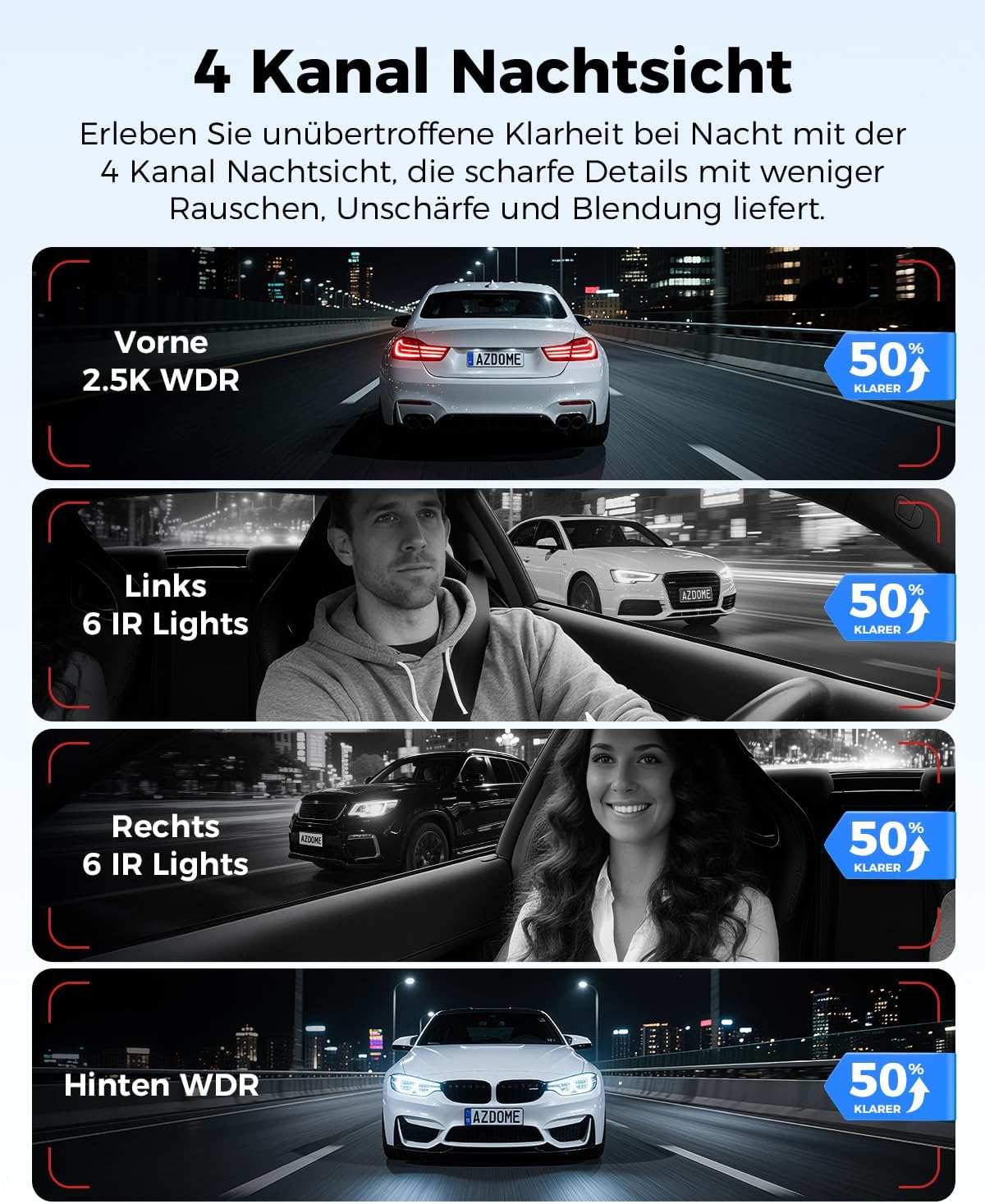 AZDOME 4-канална 4K видеорегистратор за кола 360 градуса със 128GB eMMC, 2.5K+3 * 1080P видеорегистратор, 5G WiFi, гласово управление отпред и отзад, IR нощно виждане, режим на паркиране, напомняне за умора на водача