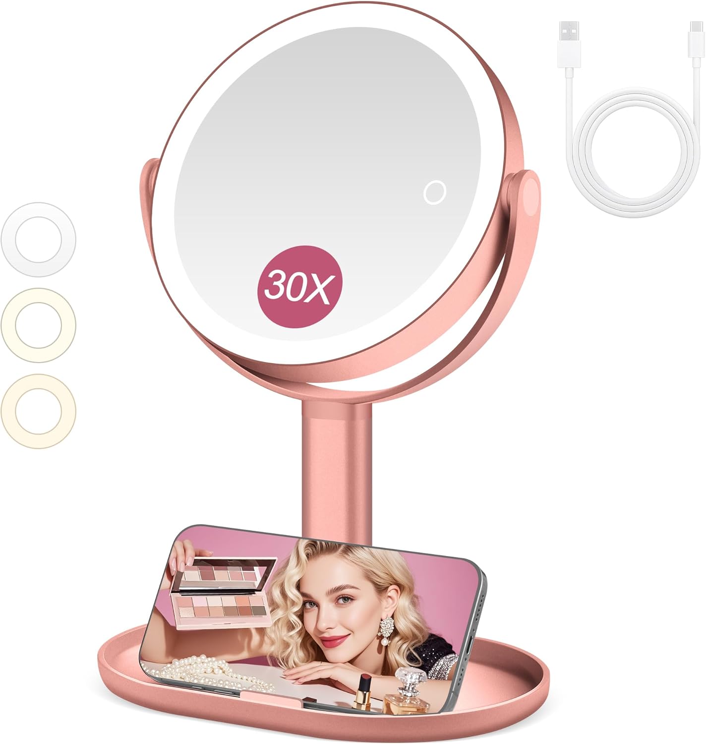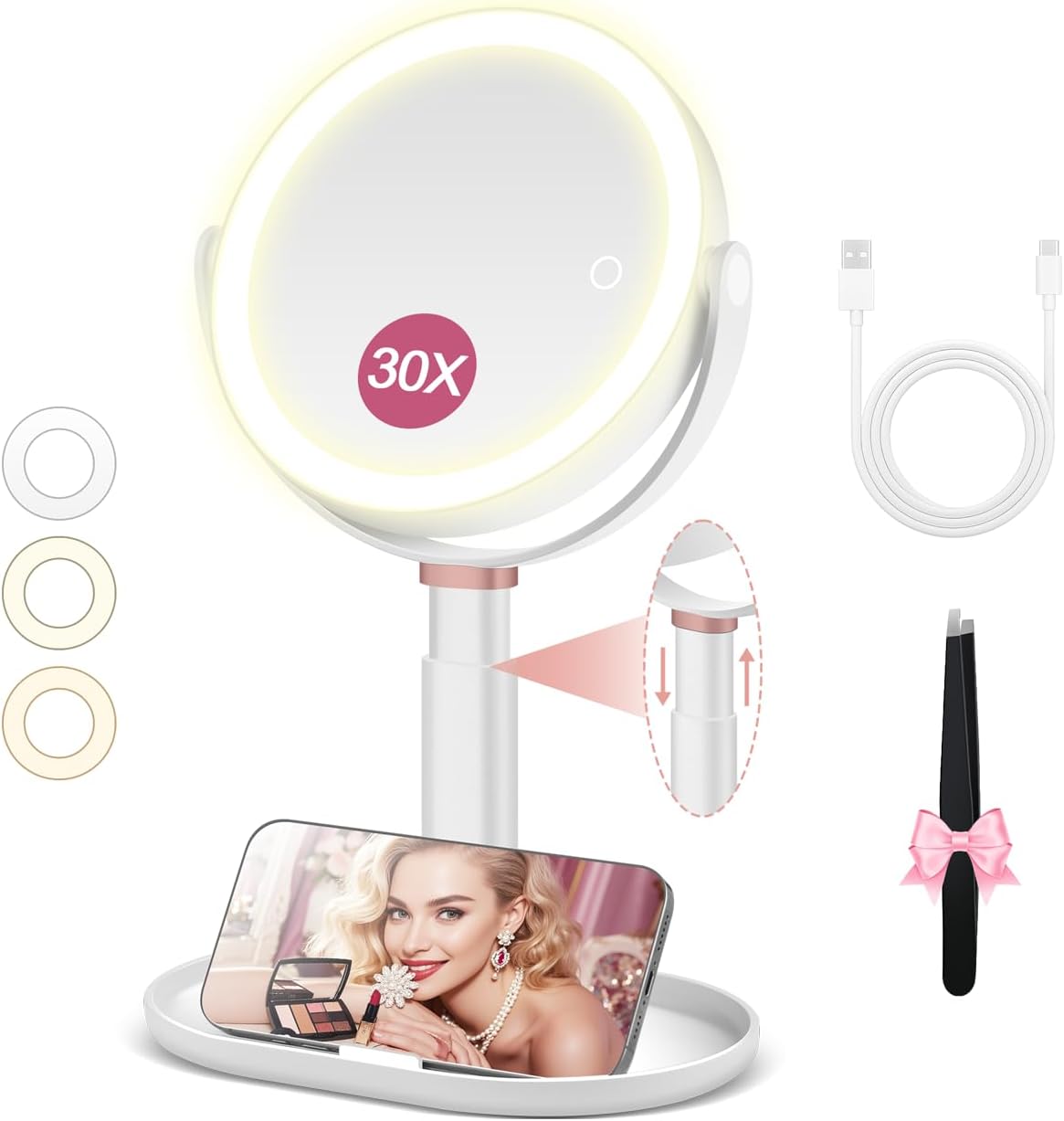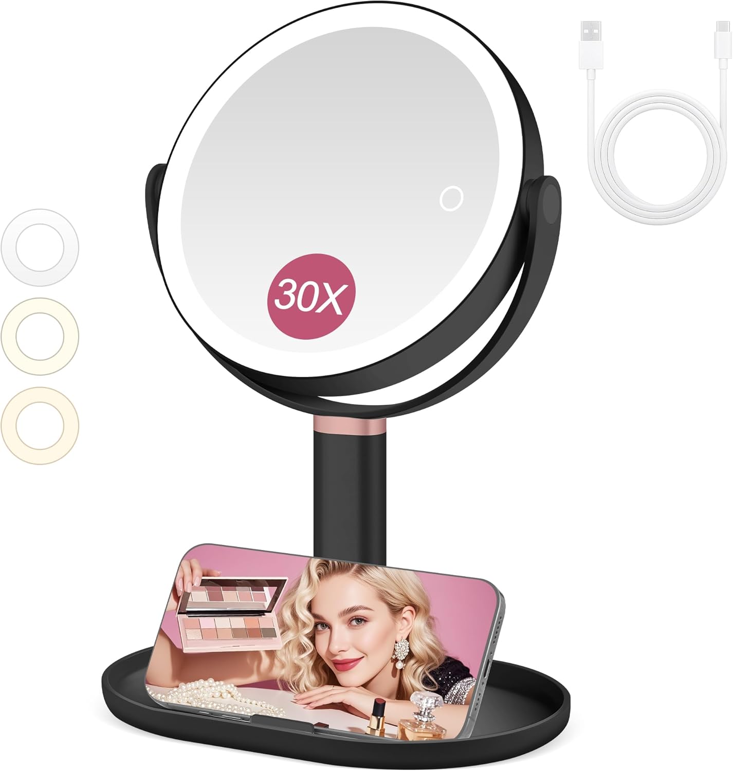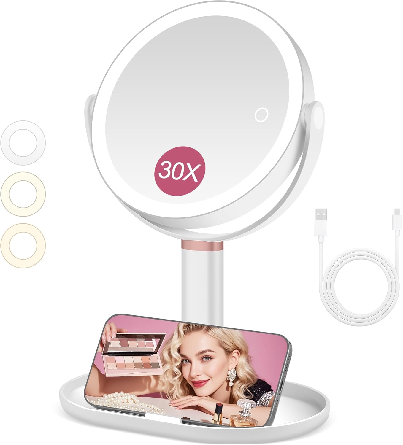 • Огледало за грим с 1/30x увеличение и осветление: това огледало за тоалетка има две огледала: огледало с 1x HD увеличение за ежедневен грим и огледало с 30x увеличение, което може без усилие да улови всеки детайл от лицето ви и да освети външния ви вид без слепи петна. Идеално за премахване на черни точки, нанасяне на очна линия или скубане на вежди. (Забележка: моля, спазвайте разстояние по-малко от 10 см, когато използвате увеличителното огледало, в противен случай може да причини отблясъци или размазани изображения)