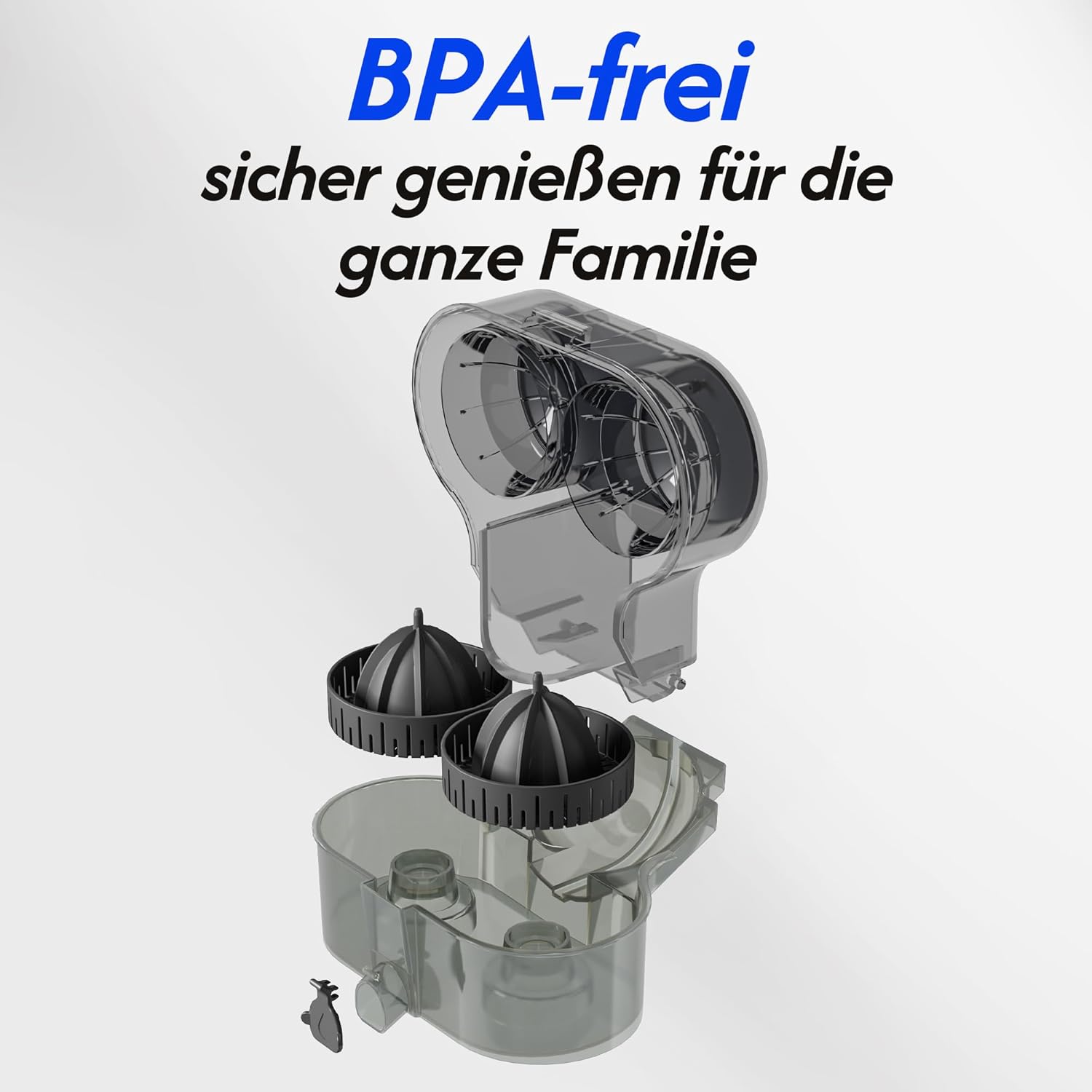 С два пресоващи конуса, B Juicy O2 постига двойна ефективност – идеална за забързани сутрини или по-големи количества.