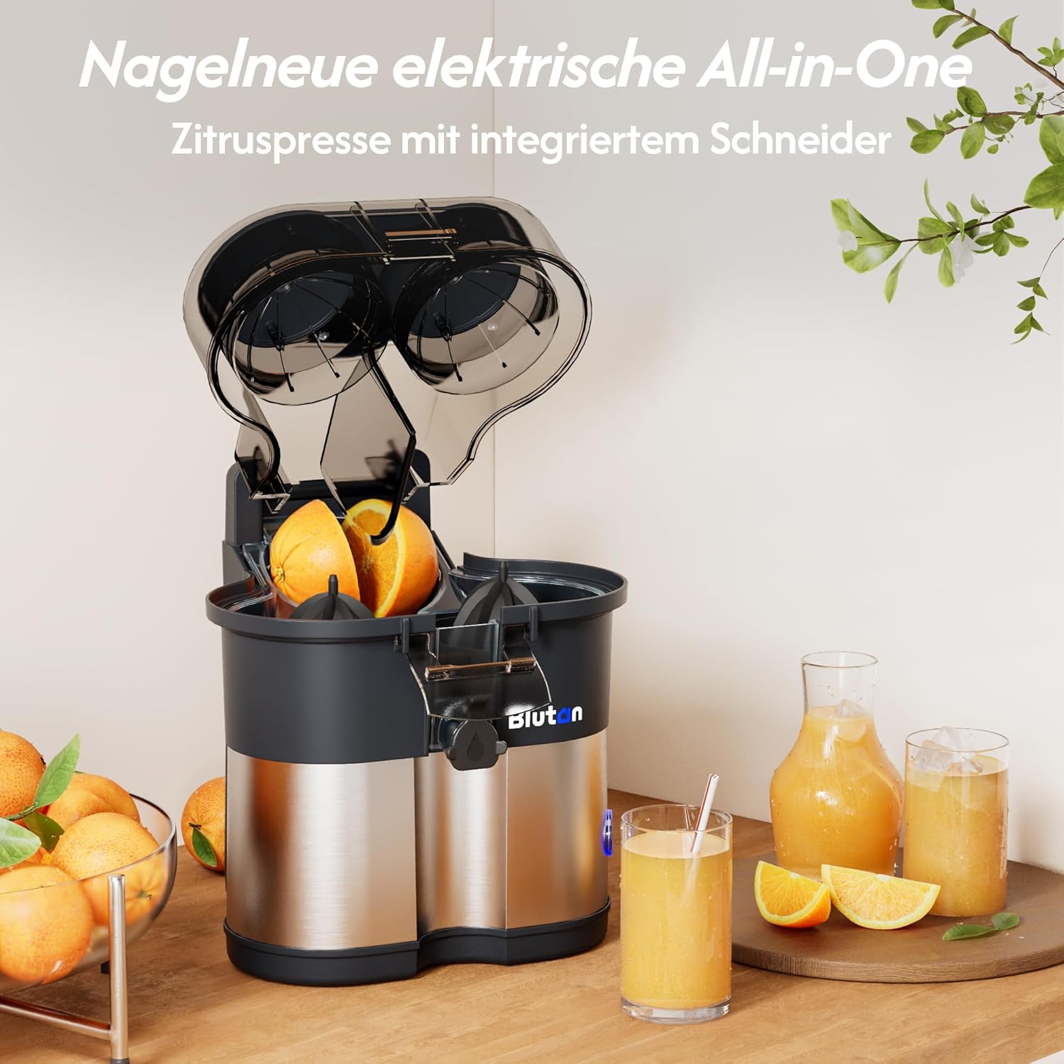 B Juicy O2 съчетава рязане, пресоване и ефективност в едно компактно устройство – идеално за пресен, домашен цитрусов сок по всяко време.