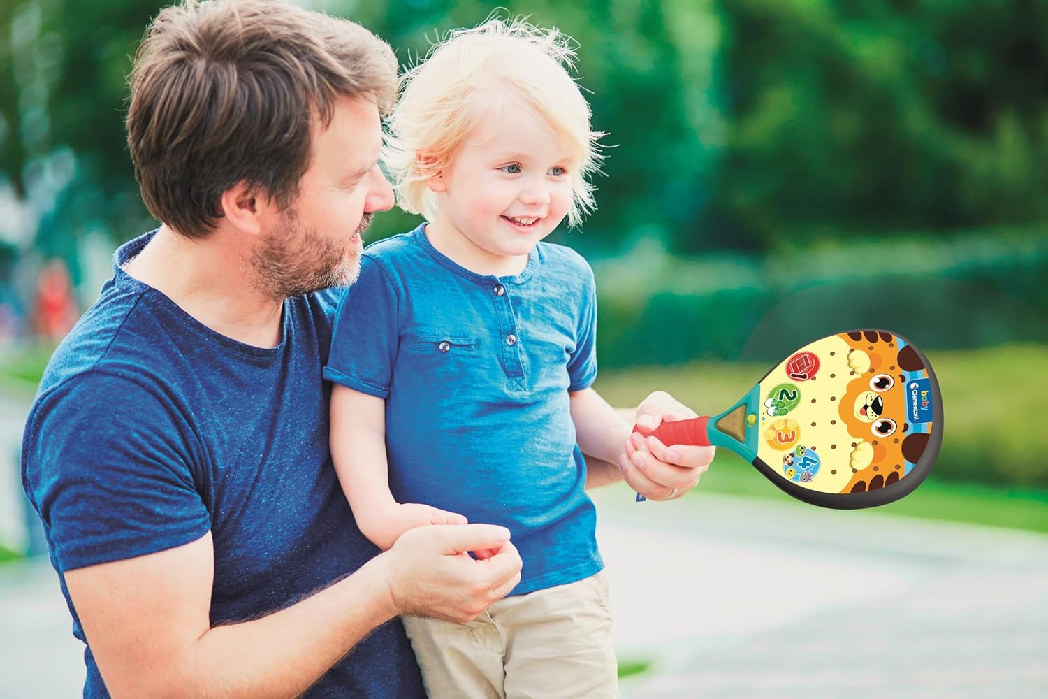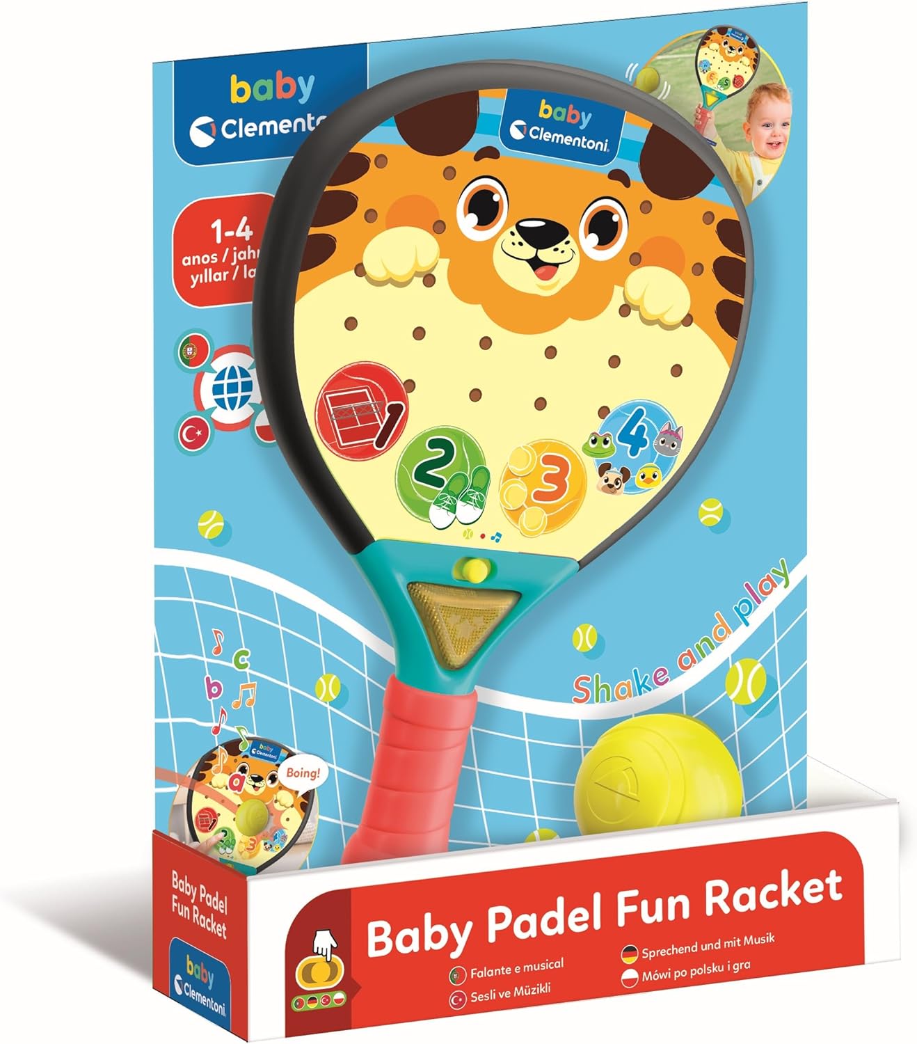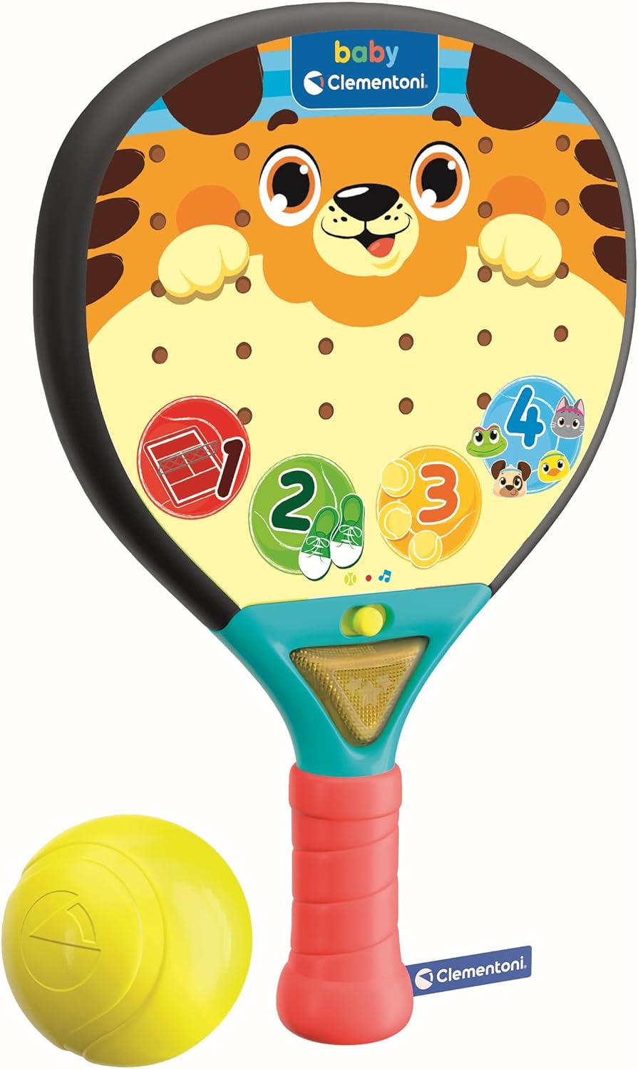 Baby Clementoni Бебешки падел с топка е интерактивна играчка, специално проектирана за малки деца на възраст от 1 до 4 години. С електронния си център за активност, който свири музика, рими и въвежда първите числа, тя осигурява игриво учене и много забавление. Меката, удароустойчива ракета и гумената топка с каишка за закрепване са идеални за първи атлетични движения и насърчават двигателните умения и координацията. Децата игриво учат основите на падела – безопасно и подходящо за възрастта. Идеален подарък за малки изследователи с много енергия.