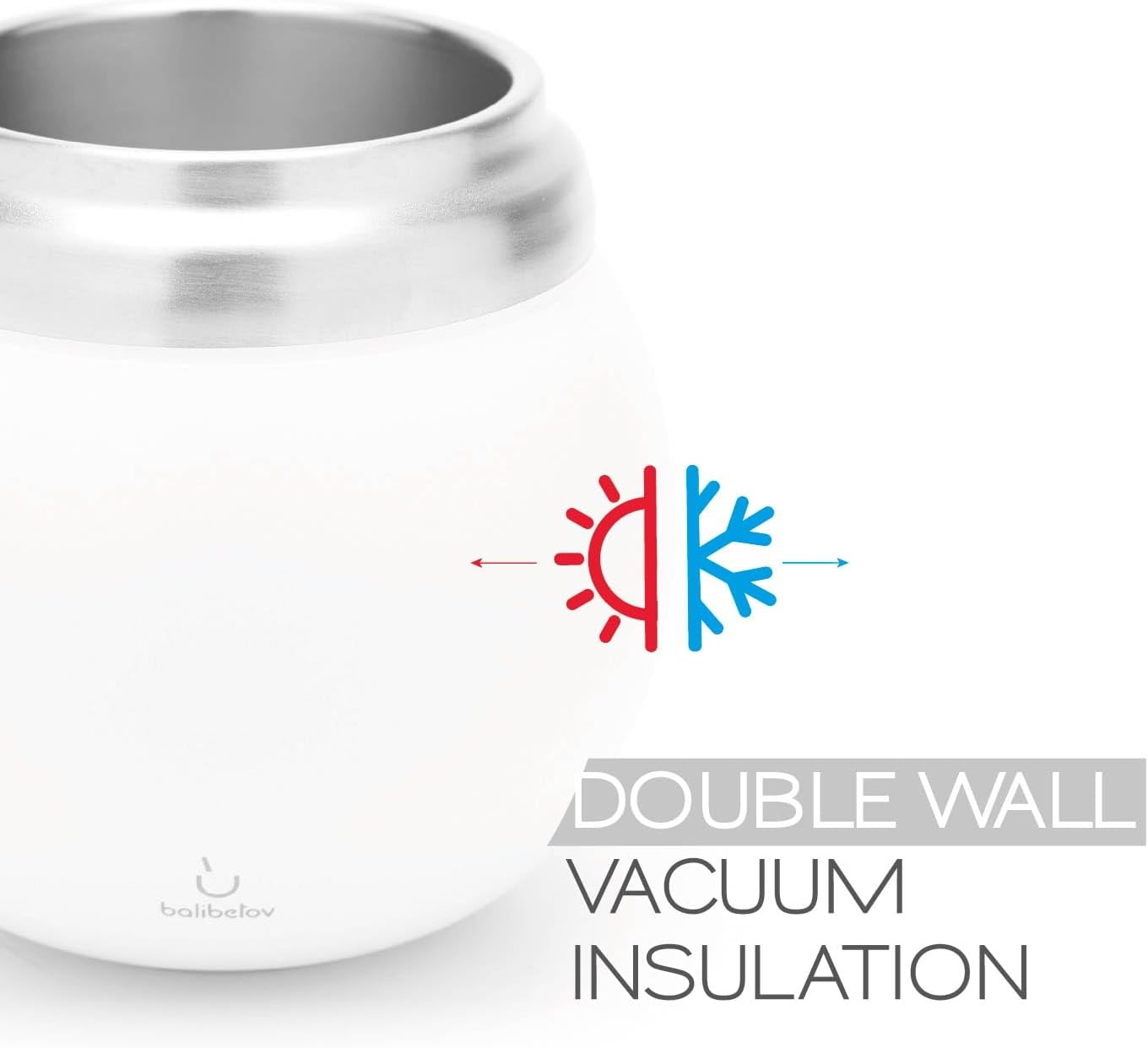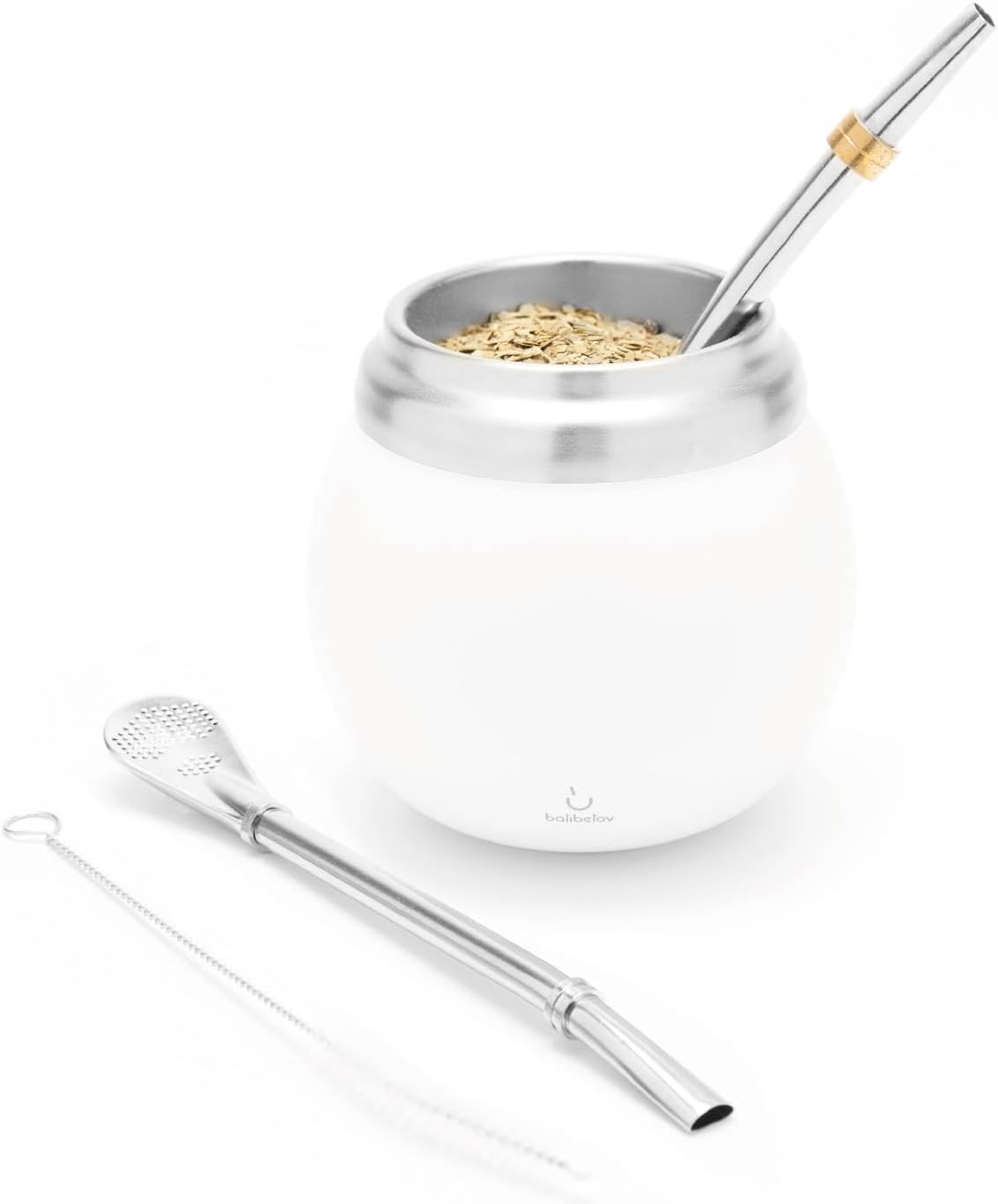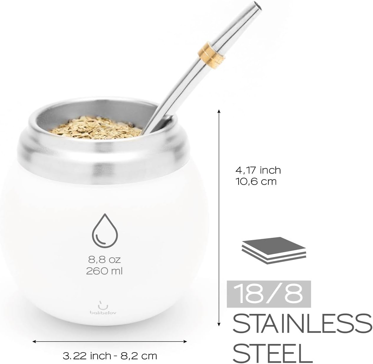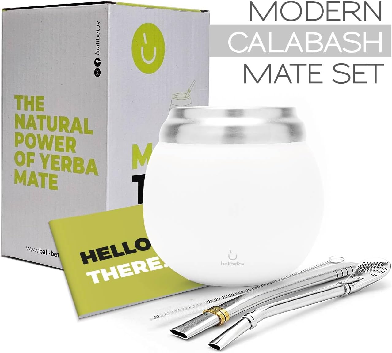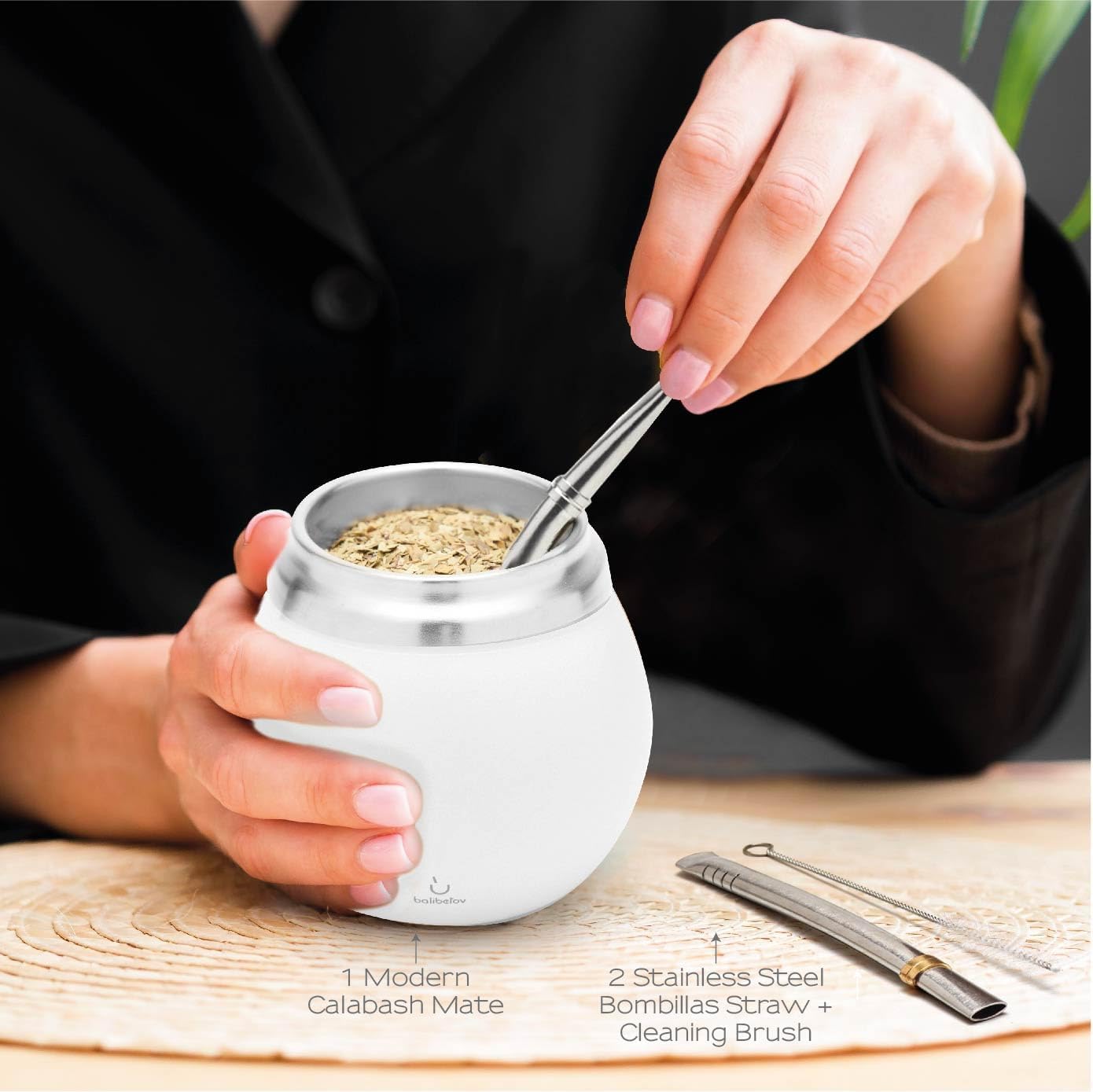 balibetov Комплект Йерба Мате - Модерен комплект за тиква Йерба Мате - Неръждаема стомана с тава за калабас и бомбила - Лесен за почистване (Бял)