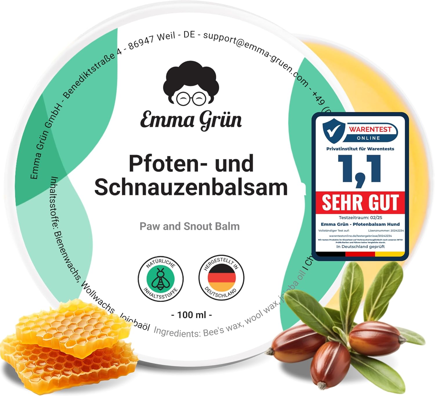 Балсам за лапи Emma Grün® 100 мл - Регенерира и укрепва напукани носове и лапи на животни - С жожоба, прополис и пчелен восък - Натурална защита и грижа за лапите - Балсам за кучешки лапи, произведен в Германия