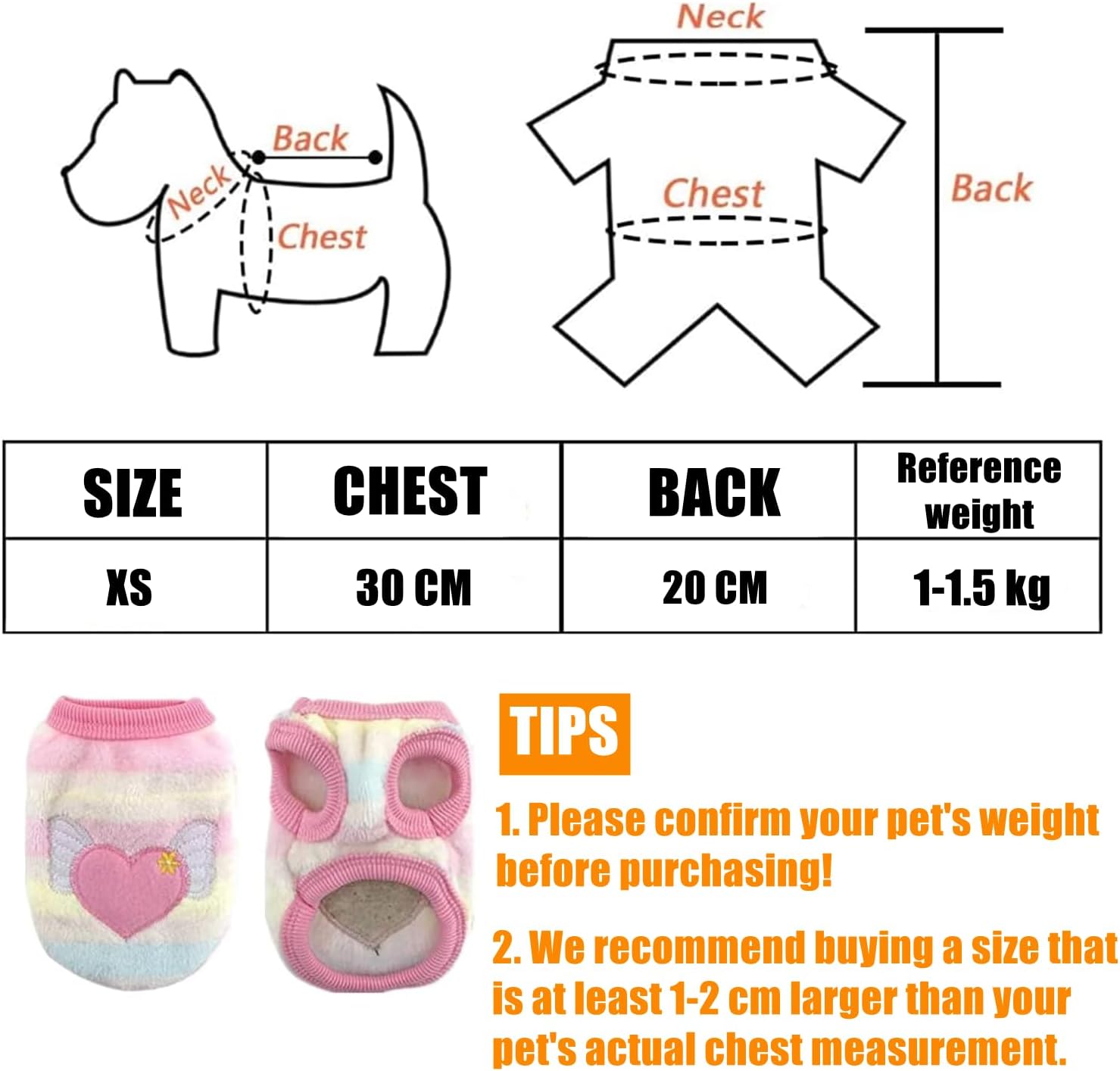 3. Поради ръчно измерване е възможно да има грешка от 1-2 см. Вземете предвид и козината на вашия домашен любимец. Препоръчваме да закупите жилетка, която е с 1-2 см по-голяма от гръдната обиколка на вашия домашен любимец.