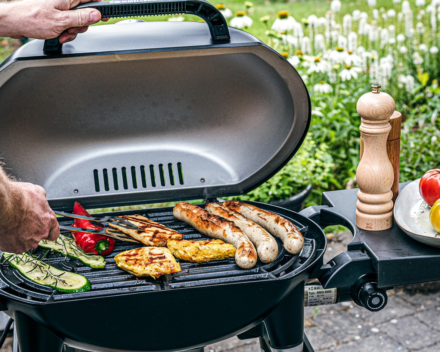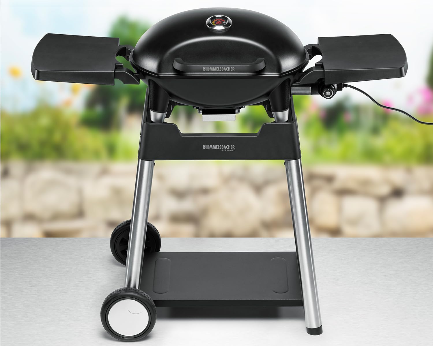 Барбекю грил ROMMELSBACHER BBQ 4100/S, 2-частична чугунена решетка за готвене, капак на панти с температурен дисплей, температури до 300 °C, безстепенно регулируем, включва количка за грил, 2200 W