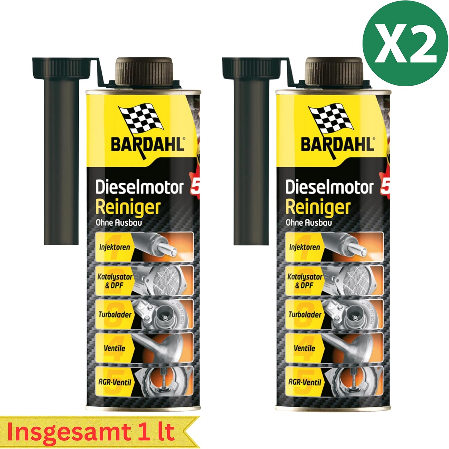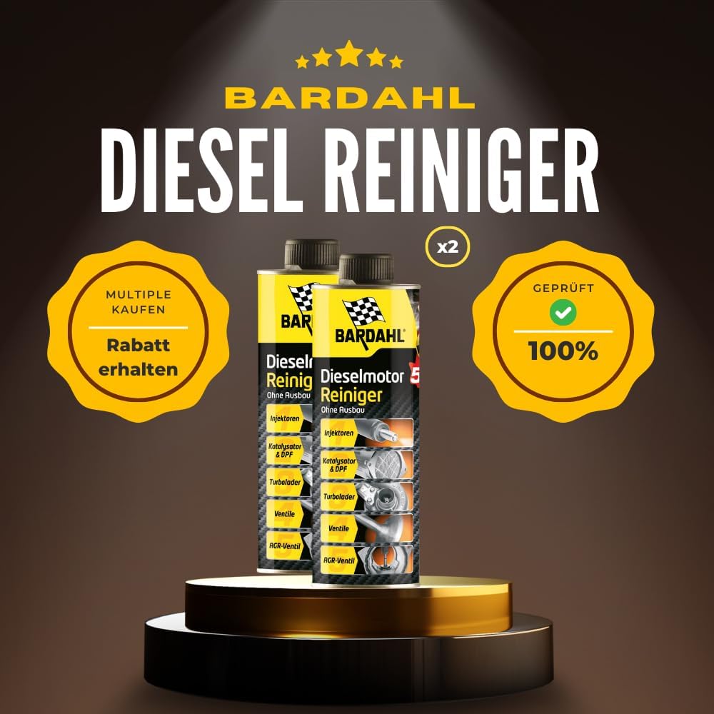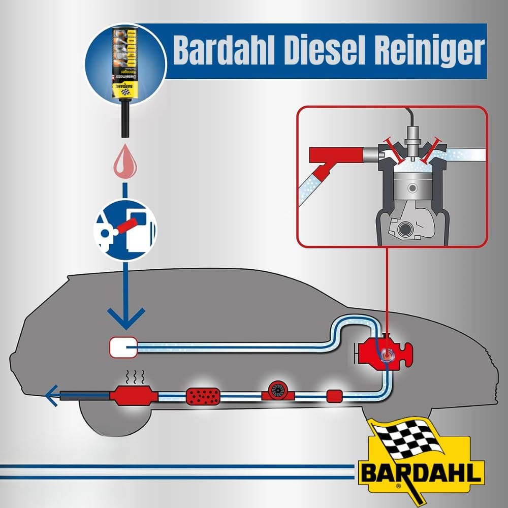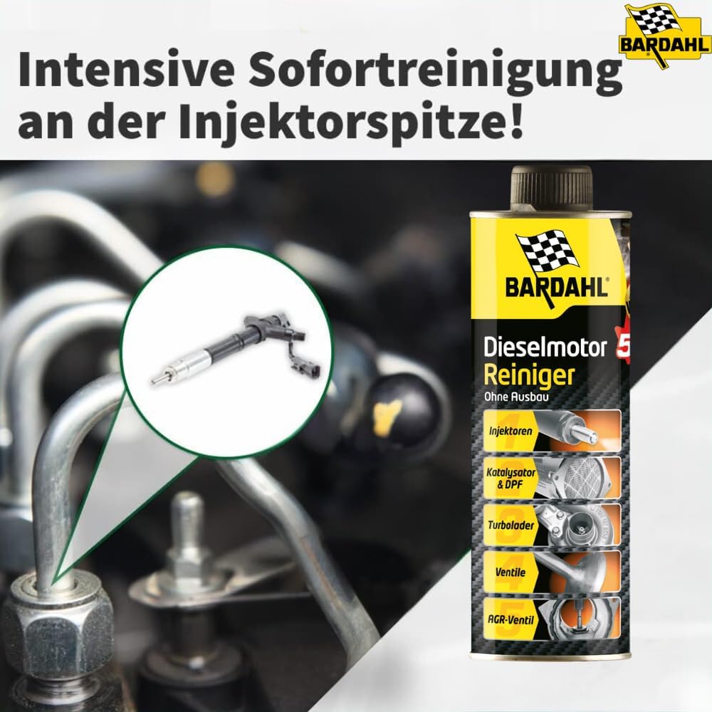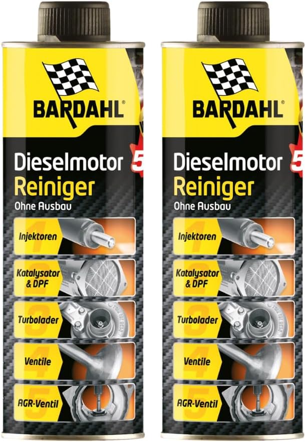 Описание на продукта: универсален почистващ препарат. Комплекс от многофункционални добавки от най-ново поколение за почистване на двигателя и горивните системи без демонтаж. Високо концентрираните активни съставки почистват двигателя на вашето превозно средство и по този начин удължават експлоатационния му живот. Налични са инструкции на немски език. Моля, обърнете внимание: добавката се използва за предотвратяване и удължаване на живота на вашия двигател, съществуващите проблеми (напр. светеща индикаторна светлина за DPF и др.) следователно не се отстраняват. Правна информация: За пълнота и точност на информацията не гарантираме подробна информация. С почистващия препарат за двигател Bardahl 5 в 1 можете да почистите двигателя си, като се насочите към частите, които са най-податливи на замърсяване. Формулата му е базирана на многофункционален комплекс от добавки, който се е появил в резултат на най-новите изследвания. Високата концентрация на почистващи вещества използва дизеловото гориво като транспортно средство за оптимално почистване на двигателя. Така че просто трябва да добавите почистващия препарат за двигател 5 в 1 в резервоара си и добавката ви към горивото служи като лечебно решение. Почистващият препарат за двигател Bardahl впечатлява със следните характеристики: Лесен и бърз за употреба. Почиства турбото, EGR клапана, филтъра за твърди частици, изпускателните клапани и катализатора без демонтаж. Почиства и защитава инжекционната система и възстановява потока на инжекторите. Ограничава емисиите на замърсители и увеличава шансовете ви да преминете тестовете за технически контрол на отработените газове. Предотвратява прекомерен разход на гориво и подмяната на скъпи части. Съвместим с добавки за дизелово гориво на бензиностанции. 5-в-1 почистващият препарат за двигатели от Bardahl действа върху всяка част от двигателя по ефективен и безопасен начин.