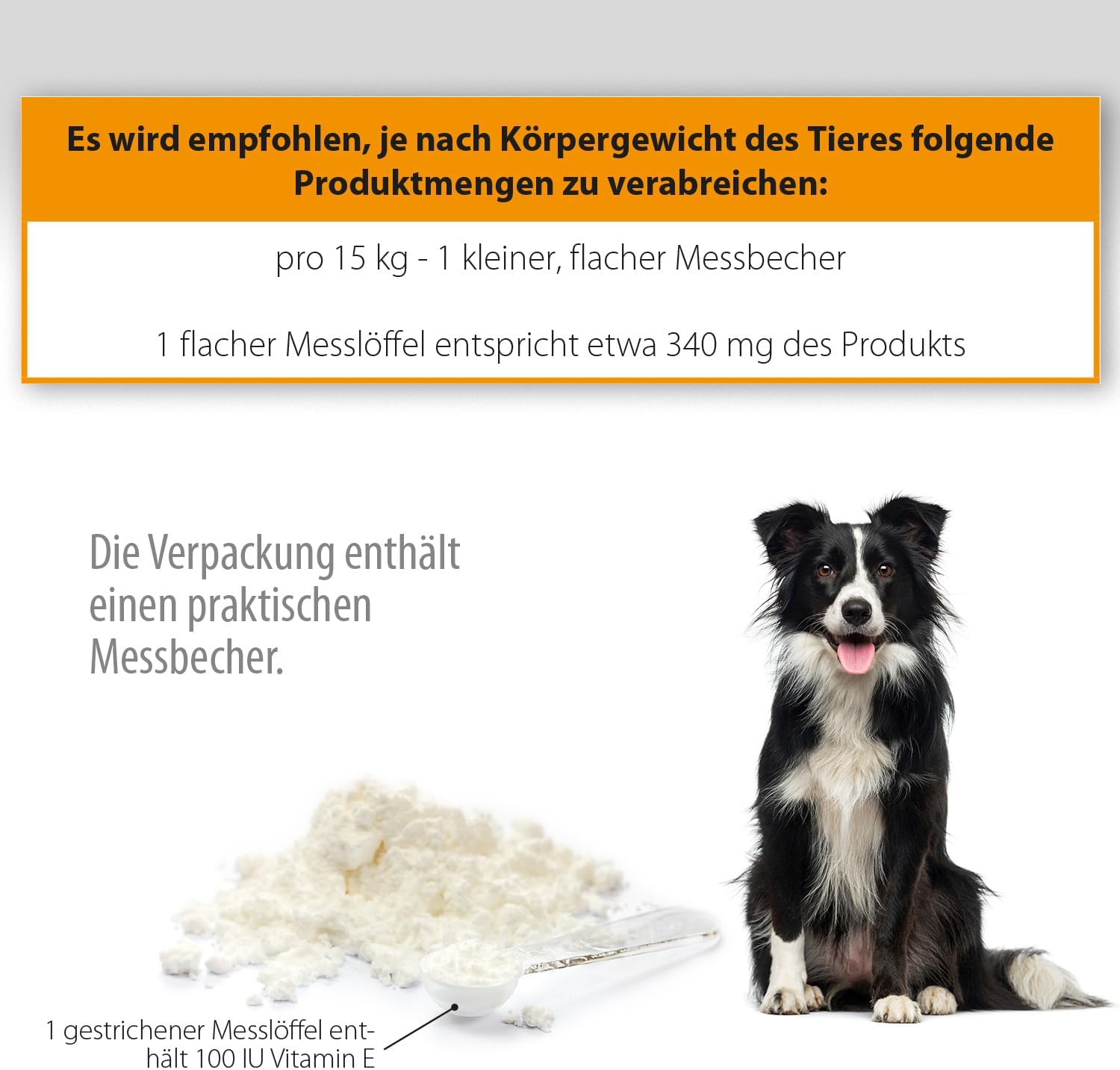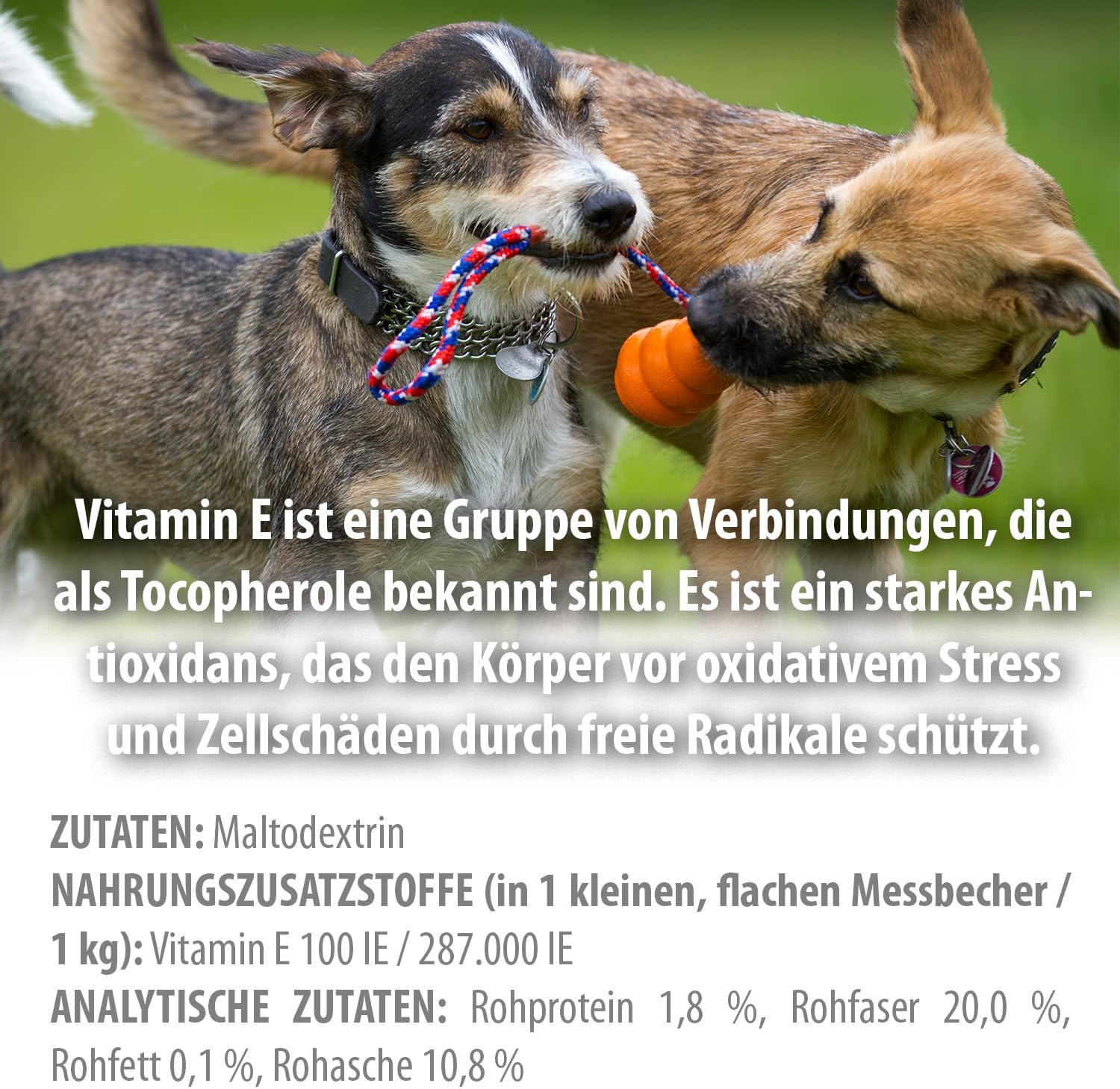 Витамин Е е група съединения, известни като токофероли. Той е мощен антиоксидант, който предпазва организма от оксидативен стрес и клетъчно увреждане, причинено от свободните радикали. Той предпазва клетките от увреждане, причинено от свободните радикали. Участва в синтеза на антикоагуланти, като поддържа пропускливостта на клетъчната мембрана и намалява агрегацията на тромбоцитите. Той е отчасти отговорен за поддържането на бременността и нормалното развитие на плода. Освен това, витамин Е подпомага нормалното зрение. Той е мастноразтворим. Струва си да се отбележи, че положителните ефекти от добавянето на витамин Е в храната за животни могат да включват намаляване на оксидативния стрес и инхибиране на производството и освобождаването на възпалителни медиатори.