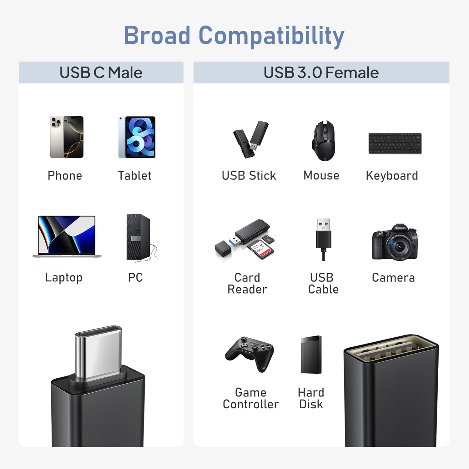 • (Лесен за употреба) Превърнете USB-C портовете на всички ваши устройства в USB-A портове с този OTG адаптер, осигурявайки им необходимия интерфейс за взаимодействие с традиционните ви устройства, които имат USB-A порт. Просто включете USB-C конектора в съответния порт на вашето устройство и сте готови.